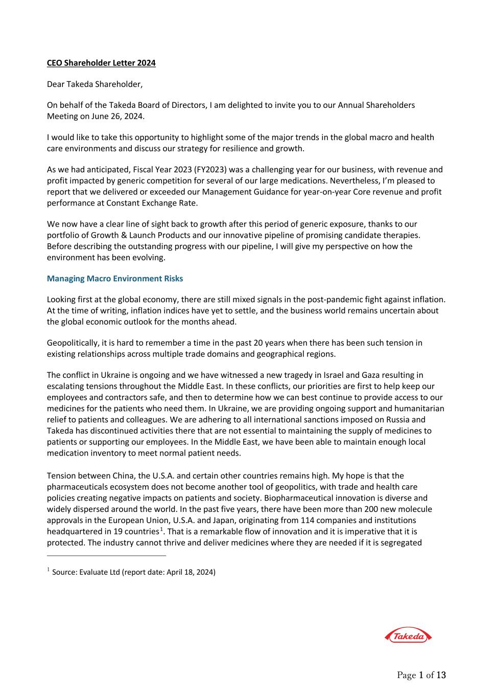 Page 1 of 13 CEO Shareholder Letter 2024 Dear Takeda Shareholder, On behalf of the Takeda Board of Directors, I am delighted to invite you to our Annual Shareholders Meeting on June 26, 2024. I would like to take this opportunity to highlight some of the major trends in the global macro and health care environments and discuss our strategy for resilience and growth. As we had anticipated, Fiscal Year 2023 (FY2023) was a challenging year for our business, with revenue and profit impacted by generic competition for several of our large medications. Nevertheless, I’m pleased to report that we delivered or exceeded our Management Guidance for year-on-year Core revenue and profit performance at Constant Exchange Rate. We now have a clear line of sight back to growth after this period of generic exposure, thanks to our portfolio of Growth & Launch Products and our innovative pipeline of promising candidate therapies. Before describing the outstanding progress with our pipeline, I will give my perspective on how the environment has been evolving. Managing Macro Environment Risks Looking first at the global economy, there are still mixed signals in the post-pandemic fight against inflation. At the time of writing, inflation indices have yet to settle, and the business world remains uncertain about the global economic outlook for the months ahead. Geopolitically, it is hard to remember a time in the past 20 years when there has been such tension in existing relationships across multiple trade domains and geographical regions. The conflict in Ukraine is ongoing and we have witnessed a new tragedy in Israel and Gaza resulting in escalating tensions throughout the Middle East. In these conflicts, our priorities are first to help keep our employees and contractors safe, and then to determine how we can best continue to provide access to our medicines for the patients who need them. In Ukraine, we are providing ongoing support and humanitarian relief to patients and colleagues. We are adhering to all international sanctions imposed on Russia and Takeda has discontinued activities there that are not essential to maintaining the supply of medicines to patients or supporting our employees. In the Middle East, we have been able to maintain enough local medication inventory to meet normal patient needs. Tension between China, the U.S.A. and certain other countries remains high. My hope is that the pharmaceuticals ecosystem does not become another tool of geopolitics, with trade and health care policies creating negative impacts on patients and society. Biopharmaceutical innovation is diverse and widely dispersed around the world. In the past five years, there have been more than 200 new molecule approvals in the European Union, U.S.A. and Japan, originating from 114 companies and institutions headquartered in 19 countries1. That is a remarkable flow of innovation and it is imperative that it is protected. The industry cannot thrive and deliver medicines where they are needed if it is segregated 1 Source: Evaluate Ltd (report date: April 18, 2024)