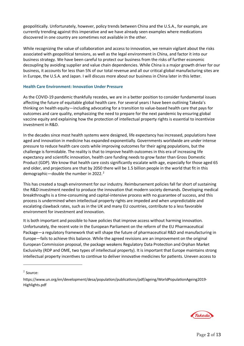 Page 2 of 13 geopolitically. Unfortunately, however, policy trends between China and the U.S.A., for example, are currently trending against this imperative and we have already seen examples where medications discovered in one country are sometimes not available in the other. While recognizing the value of collaboration and access to innovation, we remain vigilant about the risks associated with geopolitical tensions, as well as the legal environment in China, and factor it into our business strategy. We have been careful to protect our business from the risks of further economic decoupling by avoiding supplier and value chain dependencies. While China is a major growth driver for our business, it accounts for less than 5% of our total revenue and all our critical global manufacturing sites are in Europe, the U.S.A. and Japan. I will discuss more about our business in China later in this letter. Health Care Environment: Innovation Under Pressure As the COVID-19 pandemic thankfully recedes, we are in a better position to consider fundamental issues affecting the future of equitable global health care. For several years I have been outlining Takeda’s thinking on health equity—including advocating for a transition to value-based health care that pays for outcomes and care quality, emphasizing the need to prepare for the next pandemic by ensuring global vaccine equity and explaining how the protection of intellectual property rights is essential to incentivize investment in R&D. In the decades since most health systems were designed, life expectancy has increased, populations have aged and innovation in medicine has expanded exponentially. Governments worldwide are under intense pressure to reduce health care costs while improving outcomes for their aging populations, but the challenge is formidable. The reality is that to improve health outcomes in this era of increasing life expectancy and scientific innovation, health care funding needs to grow faster than Gross Domestic Product (GDP). We know that health care costs significantly escalate with age, especially for those aged 65 and older, and projections are that by 2050 there will be 1.5 billion people in the world that fit in this demographic—double the number in 2022.2 This has created a tough environment for our industry. Reimbursement policies fall far short of sustaining the R&D investment needed to produce the innovation that modern society demands. Developing medical breakthroughs is a time-consuming and capital-intensive process with no guarantee of success, and this process is undermined when intellectual property rights are impeded and when unpredictable and escalating clawback rates, such as in the UK and many EU countries, contribute to a less favorable environment for investment and innovation. It is both important and possible to have policies that improve access without harming innova�on. Unfortunately, the recent vote in the European Parliament on the reform of the EU Pharmaceu�cal Package—a regulatory framework that will shape the future of pharmaceu�cal R&D and manufacturing in Europe—fails to achieve this balance. While the agreed revisions are an improvement on the original European Commission proposal, the package weakens Regulatory Data Protec�on and Orphan Market Exclusivity (RDP and OME, two types of intellectual property). It is important that Europe maintains strong intellectual property incen�ves to con�nue to deliver innova�ve medicines for pa�ents. Uneven access to 2 Source: htps://www.un.org/en/development/desa/popula�on/publica�ons/pdf/ageing/WorldPopula�onAgeing2019- Highlights.pdf