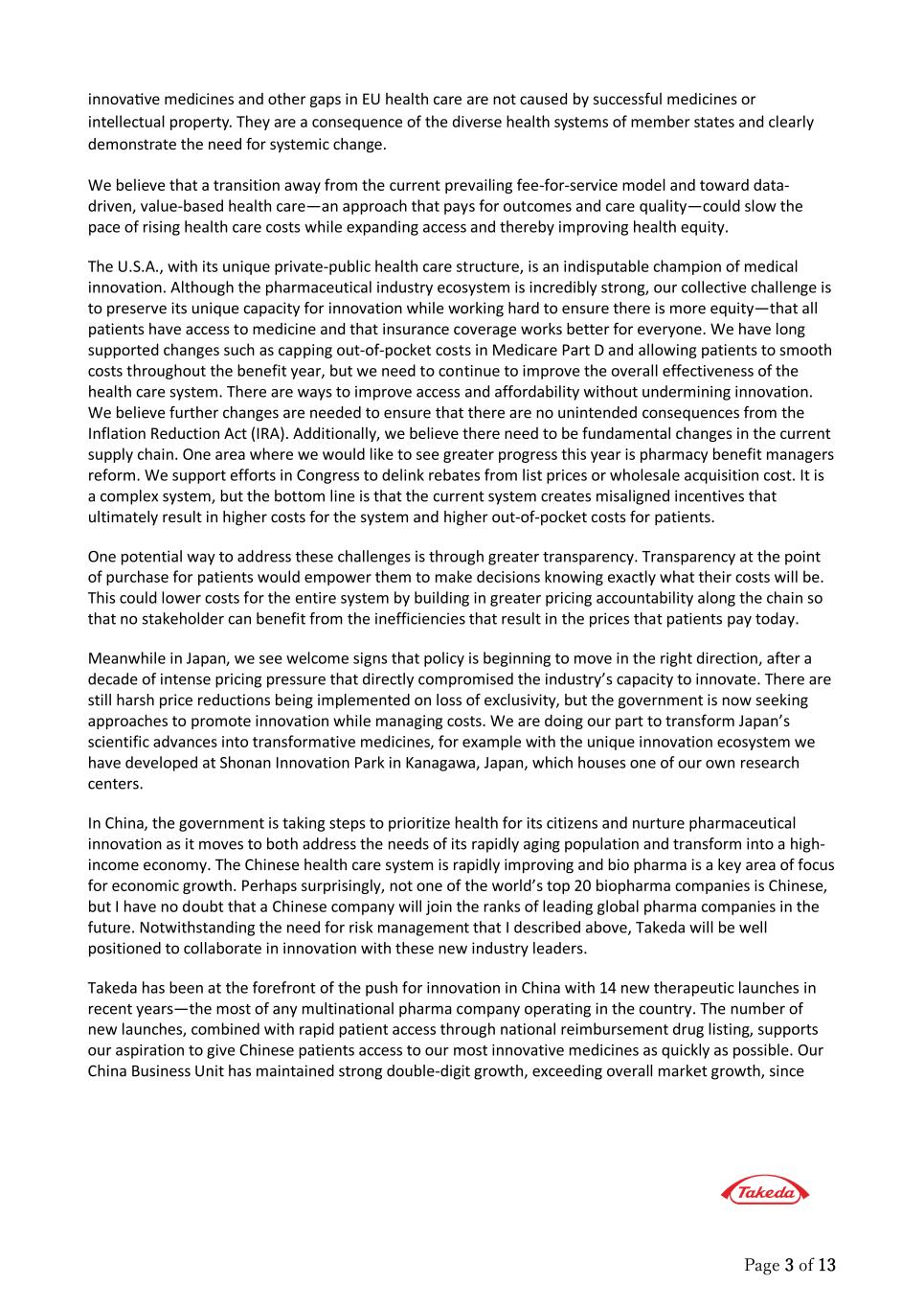 Page 3 of 13 innova�ve medicines and other gaps in EU health care are not caused by successful medicines or intellectual property. They are a consequence of the diverse health systems of member states and clearly demonstrate the need for systemic change. We believe that a transition away from the current prevailing fee-for-service model and toward data- driven, value-based health care—an approach that pays for outcomes and care quality—could slow the pace of rising health care costs while expanding access and thereby improving health equity. The U.S.A., with its unique private-public health care structure, is an indisputable champion of medical innovation. Although the pharmaceutical industry ecosystem is incredibly strong, our collective challenge is to preserve its unique capacity for innovation while working hard to ensure there is more equity—that all patients have access to medicine and that insurance coverage works better for everyone. We have long supported changes such as capping out-of-pocket costs in Medicare Part D and allowing patients to smooth costs throughout the benefit year, but we need to continue to improve the overall effectiveness of the health care system. There are ways to improve access and affordability without undermining innovation. We believe further changes are needed to ensure that there are no unintended consequences from the Inflation Reduction Act (IRA). Additionally, we believe there need to be fundamental changes in the current supply chain. One area where we would like to see greater progress this year is pharmacy benefit managers reform. We support efforts in Congress to delink rebates from list prices or wholesale acquisition cost. It is a complex system, but the bottom line is that the current system creates misaligned incentives that ultimately result in higher costs for the system and higher out-of-pocket costs for patients. One potential way to address these challenges is through greater transparency. Transparency at the point of purchase for patients would empower them to make decisions knowing exactly what their costs will be. This could lower costs for the entire system by building in greater pricing accountability along the chain so that no stakeholder can benefit from the inefficiencies that result in the prices that patients pay today. Meanwhile in Japan, we see welcome signs that policy is beginning to move in the right direction, after a decade of intense pricing pressure that directly compromised the industry’s capacity to innovate. There are still harsh price reductions being implemented on loss of exclusivity, but the government is now seeking approaches to promote innovation while managing costs. We are doing our part to transform Japan’s scientific advances into transformative medicines, for example with the unique innovation ecosystem we have developed at Shonan Innovation Park in Kanagawa, Japan, which houses one of our own research centers. In China, the government is taking steps to prioritize health for its citizens and nurture pharmaceutical innovation as it moves to both address the needs of its rapidly aging population and transform into a high- income economy. The Chinese health care system is rapidly improving and bio pharma is a key area of focus for economic growth. Perhaps surprisingly, not one of the world’s top 20 biopharma companies is Chinese, but I have no doubt that a Chinese company will join the ranks of leading global pharma companies in the future. Notwithstanding the need for risk management that I described above, Takeda will be well positioned to collaborate in innovation with these new industry leaders. Takeda has been at the forefront of the push for innovation in China with 14 new therapeutic launches in recent years—the most of any multinational pharma company operating in the country. The number of new launches, combined with rapid patient access through national reimbursement drug listing, supports our aspiration to give Chinese patients access to our most innovative medicines as quickly as possible. Our China Business Unit has maintained strong double-digit growth, exceeding overall market growth, since