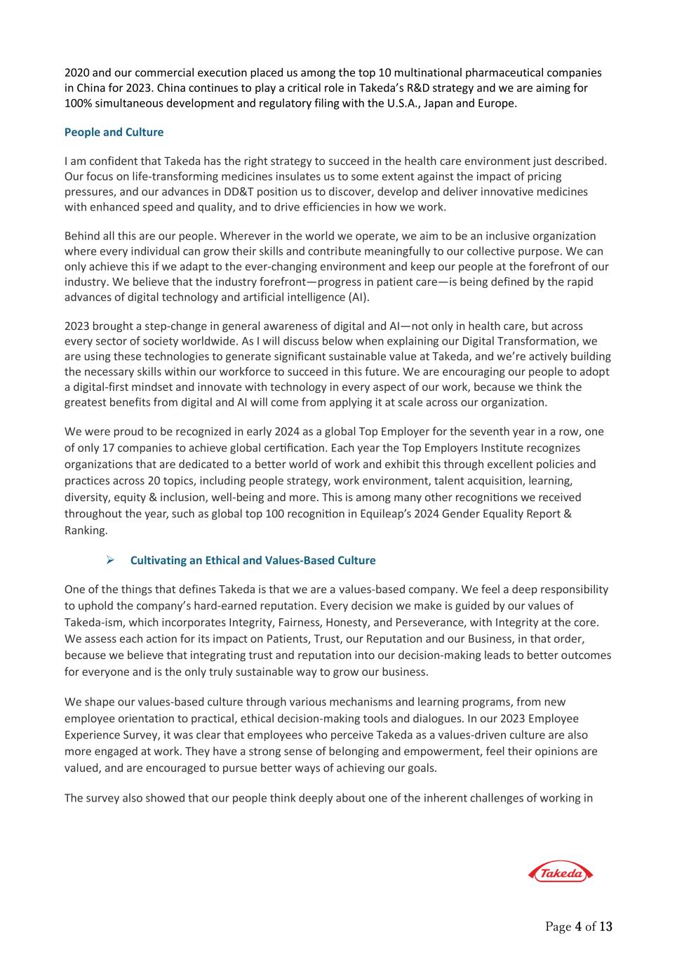 Page 4 of 13 2020 and our commercial execution placed us among the top 10 multinational pharmaceutical companies in China for 2023. China continues to play a critical role in Takeda’s R&D strategy and we are aiming for 100% simultaneous development and regulatory filing with the U.S.A., Japan and Europe. People and Culture I am confident that Takeda has the right strategy to succeed in the health care environment just described. Our focus on life-transforming medicines insulates us to some extent against the impact of pricing pressures, and our advances in DD&T position us to discover, develop and deliver innovative medicines with enhanced speed and quality, and to drive efficiencies in how we work. Behind all this are our people. Wherever in the world we operate, we aim to be an inclusive organization where every individual can grow their skills and contribute meaningfully to our collective purpose. We can only achieve this if we adapt to the ever-changing environment and keep our people at the forefront of our industry. We believe that the industry forefront—progress in patient care—is being defined by the rapid advances of digital technology and artificial intelligence (AI). 2023 brought a step-change in general awareness of digital and AI—not only in health care, but across every sector of society worldwide. As I will discuss below when explaining our Digital Transformation, we are using these technologies to generate significant sustainable value at Takeda, and we’re actively building the necessary skills within our workforce to succeed in this future. We are encouraging our people to adopt a digital-first mindset and innovate with technology in every aspect of our work, because we think the greatest benefits from digital and AI will come from applying it at scale across our organization. We were proud to be recognized in early 2024 as a global Top Employer for the seventh year in a row, one of only 17 companies to achieve global cer�fica�on. Each year the Top Employers Institute recognizes organizations that are dedicated to a better world of work and exhibit this through excellent policies and practices across 20 topics, including people strategy, work environment, talent acquisition, learning, diversity, equity & inclusion, well-being and more. This is among many other recogni�ons we received throughout the year, such as global top 100 recogni�on in Equileap’s 2024 Gender Equality Report & Ranking.  Cultivating an Ethical and Values-Based Culture One of the things that defines Takeda is that we are a values-based company. We feel a deep responsibility to uphold the company’s hard-earned reputation. Every decision we make is guided by our values of Takeda-ism, which incorporates Integrity, Fairness, Honesty, and Perseverance, with Integrity at the core. We assess each action for its impact on Patients, Trust, our Reputation and our Business, in that order, because we believe that integrating trust and reputation into our decision-making leads to better outcomes for everyone and is the only truly sustainable way to grow our business. We shape our values-based culture through various mechanisms and learning programs, from new employee orientation to practical, ethical decision-making tools and dialogues. In our 2023 Employee Experience Survey, it was clear that employees who perceive Takeda as a values-driven culture are also more engaged at work. They have a strong sense of belonging and empowerment, feel their opinions are valued, and are encouraged to pursue better ways of achieving our goals. The survey also showed that our people think deeply about one of the inherent challenges of working in