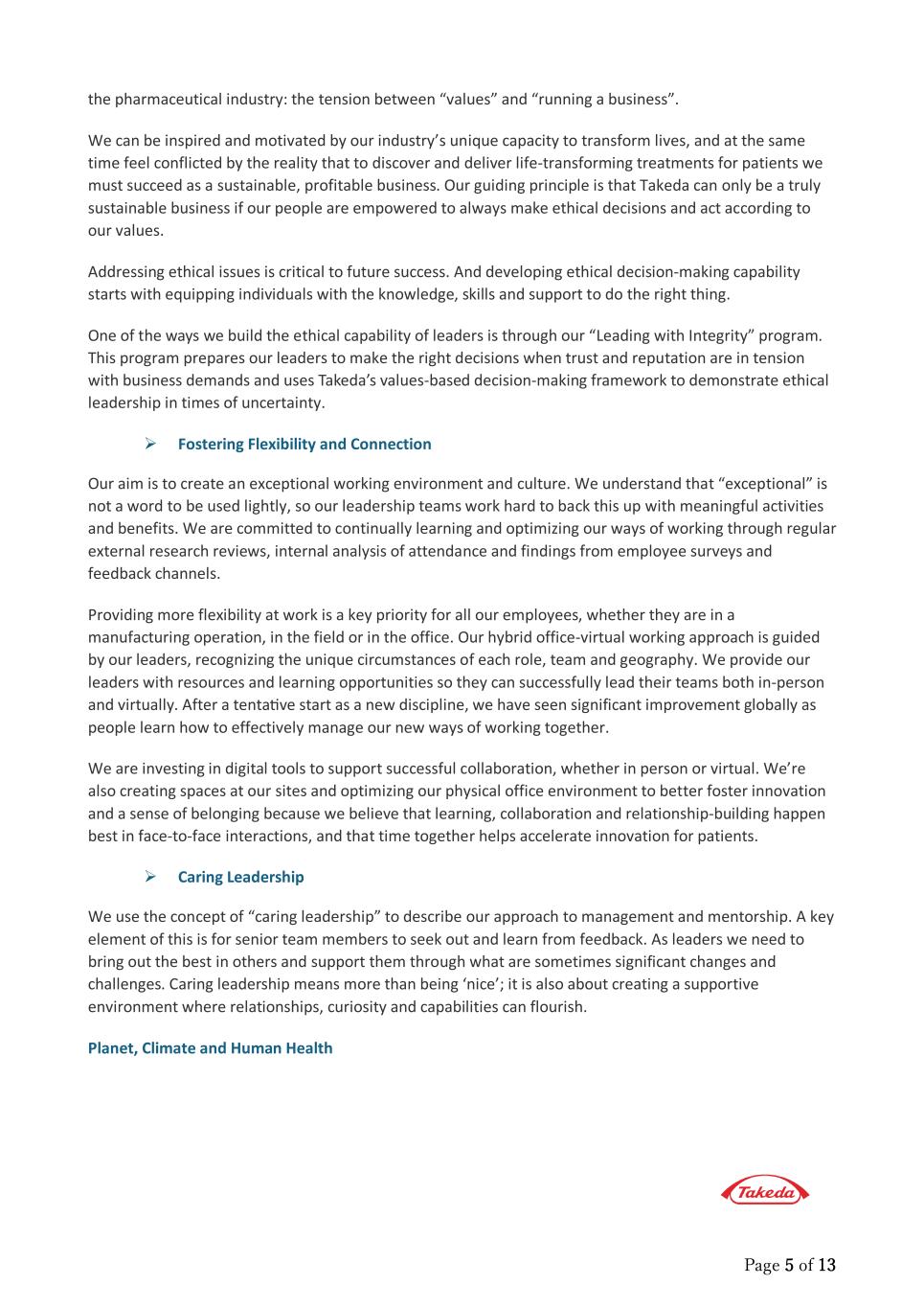 Page 5 of 13 the pharmaceutical industry: the tension between “values” and “running a business”. We can be inspired and motivated by our industry’s unique capacity to transform lives, and at the same time feel conflicted by the reality that to discover and deliver life-transforming treatments for patients we must succeed as a sustainable, profitable business. Our guiding principle is that Takeda can only be a truly sustainable business if our people are empowered to always make ethical decisions and act according to our values. Addressing ethical issues is critical to future success. And developing ethical decision-making capability starts with equipping individuals with the knowledge, skills and support to do the right thing. One of the ways we build the ethical capability of leaders is through our “Leading with Integrity” program. This program prepares our leaders to make the right decisions when trust and reputation are in tension with business demands and uses Takeda’s values-based decision-making framework to demonstrate ethical leadership in times of uncertainty.  Fostering Flexibility and Connection Our aim is to create an exceptional working environment and culture. We understand that “exceptional” is not a word to be used lightly, so our leadership teams work hard to back this up with meaningful activities and benefits. We are committed to continually learning and optimizing our ways of working through regular external research reviews, internal analysis of attendance and findings from employee surveys and feedback channels. Providing more flexibility at work is a key priority for all our employees, whether they are in a manufacturing operation, in the field or in the office. Our hybrid office-virtual working approach is guided by our leaders, recognizing the unique circumstances of each role, team and geography. We provide our leaders with resources and learning opportunities so they can successfully lead their teams both in-person and virtually. After a tenta�ve start as a new discipline, we have seen significant improvement globally as people learn how to effectively manage our new ways of working together. We are investing in digital tools to support successful collaboration, whether in person or virtual. We’re also creating spaces at our sites and optimizing our physical office environment to better foster innovation and a sense of belonging because we believe that learning, collaboration and relationship-building happen best in face-to-face interactions, and that time together helps accelerate innovation for patients.  Caring Leadership We use the concept of “caring leadership” to describe our approach to management and mentorship. A key element of this is for senior team members to seek out and learn from feedback. As leaders we need to bring out the best in others and support them through what are sometimes significant changes and challenges. Caring leadership means more than being ‘nice’; it is also about creating a supportive environment where relationships, curiosity and capabilities can flourish. Planet, Climate and Human Health
