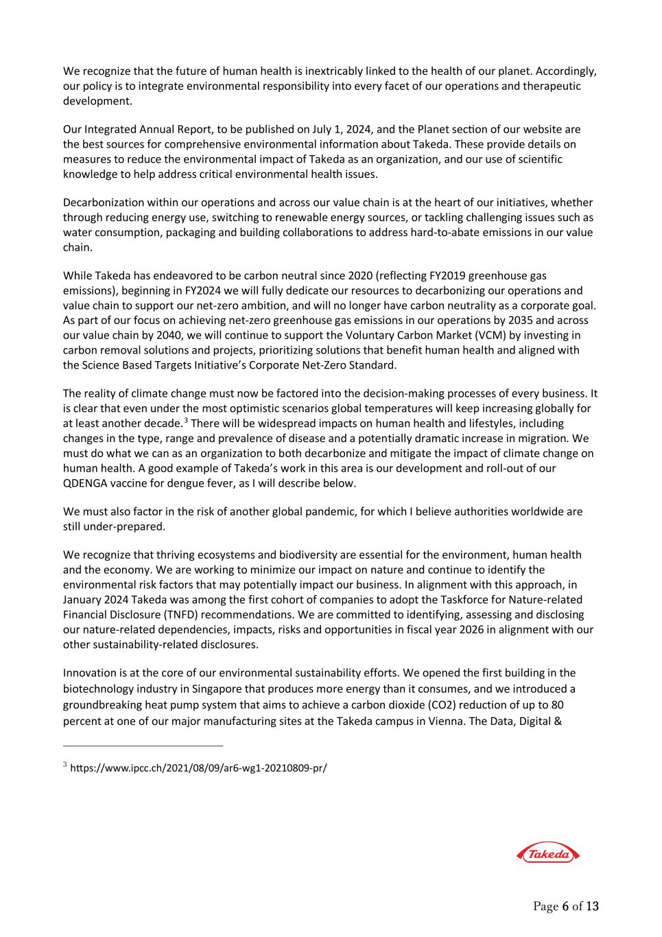 Page 6 of 13 We recognize that the future of human health is inextricably linked to the health of our planet. Accordingly, our policy is to integrate environmental responsibility into every facet of our operations and therapeutic development. Our Integrated Annual Report, to be published on July 1, 2024, and the Planet sec�on of our website are the best sources for comprehensive environmental information about Takeda. These provide details on measures to reduce the environmental impact of Takeda as an organization, and our use of scientific knowledge to help address critical environmental health issues. Decarbonization within our operations and across our value chain is at the heart of our initiatives, whether through reducing energy use, switching to renewable energy sources, or tackling challenging issues such as water consumption, packaging and building collaborations to address hard-to-abate emissions in our value chain. While Takeda has endeavored to be carbon neutral since 2020 (reflecting FY2019 greenhouse gas emissions), beginning in FY2024 we will fully dedicate our resources to decarbonizing our operations and value chain to support our net-zero ambition, and will no longer have carbon neutrality as a corporate goal. As part of our focus on achieving net-zero greenhouse gas emissions in our operations by 2035 and across our value chain by 2040, we will continue to support the Voluntary Carbon Market (VCM) by investing in carbon removal solutions and projects, prioritizing solutions that benefit human health and aligned with the Science Based Targets Initiative’s Corporate Net-Zero Standard. The reality of climate change must now be factored into the decision-making processes of every business. It is clear that even under the most optimistic scenarios global temperatures will keep increasing globally for at least another decade.3 There will be widespread impacts on human health and lifestyles, including changes in the type, range and prevalence of disease and a potentially dramatic increase in migration. We must do what we can as an organization to both decarbonize and mitigate the impact of climate change on human health. A good example of Takeda’s work in this area is our development and roll-out of our QDENGA vaccine for dengue fever, as I will describe below. We must also factor in the risk of another global pandemic, for which I believe authorities worldwide are still under-prepared. We recognize that thriving ecosystems and biodiversity are essential for the environment, human health and the economy. We are working to minimize our impact on nature and continue to identify the environmental risk factors that may potentially impact our business. In alignment with this approach, in January 2024 Takeda was among the first cohort of companies to adopt the Taskforce for Nature-related Financial Disclosure (TNFD) recommendations. We are committed to identifying, assessing and disclosing our nature-related dependencies, impacts, risks and opportunities in fiscal year 2026 in alignment with our other sustainability-related disclosures. Innovation is at the core of our environmental sustainability efforts. We opened the first building in the biotechnology industry in Singapore that produces more energy than it consumes, and we introduced a groundbreaking heat pump system that aims to achieve a carbon dioxide (CO2) reduction of up to 80 percent at one of our major manufacturing sites at the Takeda campus in Vienna. The Data, Digital & 3 htps://www.ipcc.ch/2021/08/09/ar6-wg1-20210809-pr/