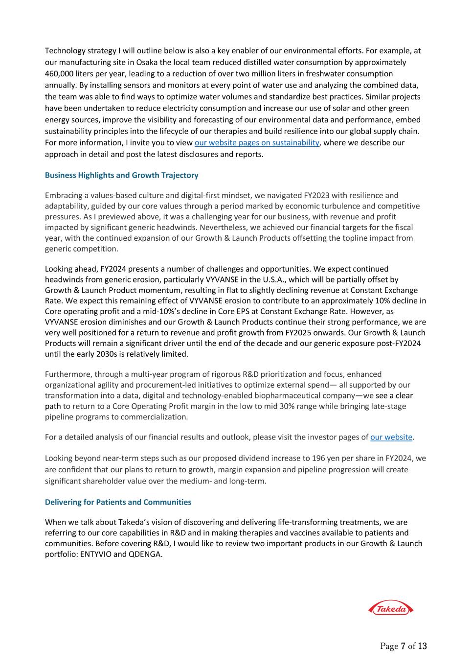 Page 7 of 13 Technology strategy I will outline below is also a key enabler of our environmental efforts. For example, at our manufacturing site in Osaka the local team reduced distilled water consumption by approximately 460,000 liters per year, leading to a reduction of over two million liters in freshwater consumption annually. By installing sensors and monitors at every point of water use and analyzing the combined data, the team was able to find ways to optimize water volumes and standardize best practices. Similar projects have been undertaken to reduce electricity consumption and increase our use of solar and other green energy sources, improve the visibility and forecasting of our environmental data and performance, embed sustainability principles into the lifecycle of our therapies and build resilience into our global supply chain. For more information, I invite you to view our website pages on sustainability, where we describe our approach in detail and post the latest disclosures and reports. Business Highlights and Growth Trajectory Embracing a values-based culture and digital-first mindset, we navigated FY2023 with resilience and adaptability, guided by our core values through a period marked by economic turbulence and competitive pressures. As I previewed above, it was a challenging year for our business, with revenue and profit impacted by significant generic headwinds. Nevertheless, we achieved our financial targets for the fiscal year, with the continued expansion of our Growth & Launch Products offsetting the topline impact from generic competition. Looking ahead, FY2024 presents a number of challenges and opportunities. We expect continued headwinds from generic erosion, particularly VYVANSE in the U.S.A., which will be partially offset by Growth & Launch Product momentum, resulting in flat to slightly declining revenue at Constant Exchange Rate. We expect this remaining effect of VYVANSE erosion to contribute to an approximately 10% decline in Core operating profit and a mid-10%’s decline in Core EPS at Constant Exchange Rate. However, as VYVANSE erosion diminishes and our Growth & Launch Products continue their strong performance, we are very well positioned for a return to revenue and profit growth from FY2025 onwards. Our Growth & Launch Products will remain a significant driver until the end of the decade and our generic exposure post-FY2024 until the early 2030s is relatively limited. Furthermore, through a multi-year program of rigorous R&D prioritization and focus, enhanced organizational agility and procurement-led initiatives to optimize external spend— all supported by our transformation into a data, digital and technology-enabled biopharmaceutical company—we see a clear path to return to a Core Operating Profit margin in the low to mid 30% range while bringing late-stage pipeline programs to commercialization. For a detailed analysis of our financial results and outlook, please visit the investor pages of our website. Looking beyond near-term steps such as our proposed dividend increase to 196 yen per share in FY2024, we are confident that our plans to return to growth, margin expansion and pipeline progression will create significant shareholder value over the medium- and long-term. Delivering for Patients and Communities When we talk about Takeda’s vision of discovering and delivering life-transforming treatments, we are referring to our core capabilities in R&D and in making therapies and vaccines available to patients and communities. Before covering R&D, I would like to review two important products in our Growth & Launch portfolio: ENTYVIO and QDENGA.