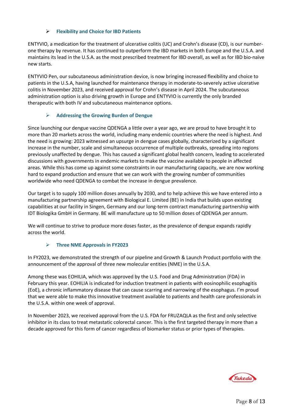 Page 8 of 13  Flexibility and Choice for IBD Patients ENTYVIO, a medication for the treatment of ulcerative colitis (UC) and Crohn’s disease (CD), is our number- one therapy by revenue. It has continued to outperform the IBD markets in both Europe and the U.S.A. and maintains its lead in the U.S.A. as the most prescribed treatment for IBD overall, as well as for IBD bio-naïve new starts. ENTYVIO Pen, our subcutaneous administration device, is now bringing increased flexibility and choice to patients in the U.S.A, having launched for maintenance therapy in moderate-to-severely active ulcerative colitis in November 2023, and received approval for Crohn’s disease in April 2024. The subcutaneous administration option is also driving growth in Europe and ENTYVIO is currently the only branded therapeutic with both IV and subcutaneous maintenance options.  Addressing the Growing Burden of Dengue Since launching our dengue vaccine QDENGA a little over a year ago, we are proud to have brought it to more than 20 markets across the world, including many endemic countries where the need is highest. And the need is growing: 2023 witnessed an upsurge in dengue cases globally, characterized by a significant increase in the number, scale and simultaneous occurrence of multiple outbreaks, spreading into regions previously unaffected by dengue. This has caused a significant global health concern, leading to accelerated discussions with governments in endemic markets to make the vaccine available to people in affected areas. While this has come up against some constraints in our manufacturing capacity, we are now working hard to expand production and ensure that we can work with the growing number of communities worldwide who need QDENGA to combat the increase in dengue prevalence. Our target is to supply 100 million doses annually by 2030, and to help achieve this we have entered into a manufacturing partnership agreement with Biological E. Limited (BE) in India that builds upon existing capabilities at our facility in Singen, Germany and our long-term contract manufacturing partnership with IDT Biologika GmbH in Germany. BE will manufacture up to 50 million doses of QDENGA per annum. We will continue to strive to produce more doses faster, as the prevalence of dengue expands rapidly across the world.  Three NME Approvals in FY2023 In FY2023, we demonstrated the strength of our pipeline and Growth & Launch Product portfolio with the announcement of the approval of three new molecular entities (NME) in the U.S.A. Among these was EOHILIA, which was approved by the U.S. Food and Drug Administration (FDA) in February this year. EOHILIA is indicated for induction treatment in patients with eosinophilic esophagitis (EoE), a chronic inflammatory disease that can cause scarring and narrowing of the esophagus. I’m proud that we were able to make this innovative treatment available to patients and health care professionals in the U.S.A. within one week of approval. In November 2023, we received approval from the U.S. FDA for FRUZAQLA as the first and only selective inhibitor in its class to treat metastatic colorectal cancer. This is the first targeted therapy in more than a decade approved for this form of cancer regardless of biomarker status or prior types of therapies.