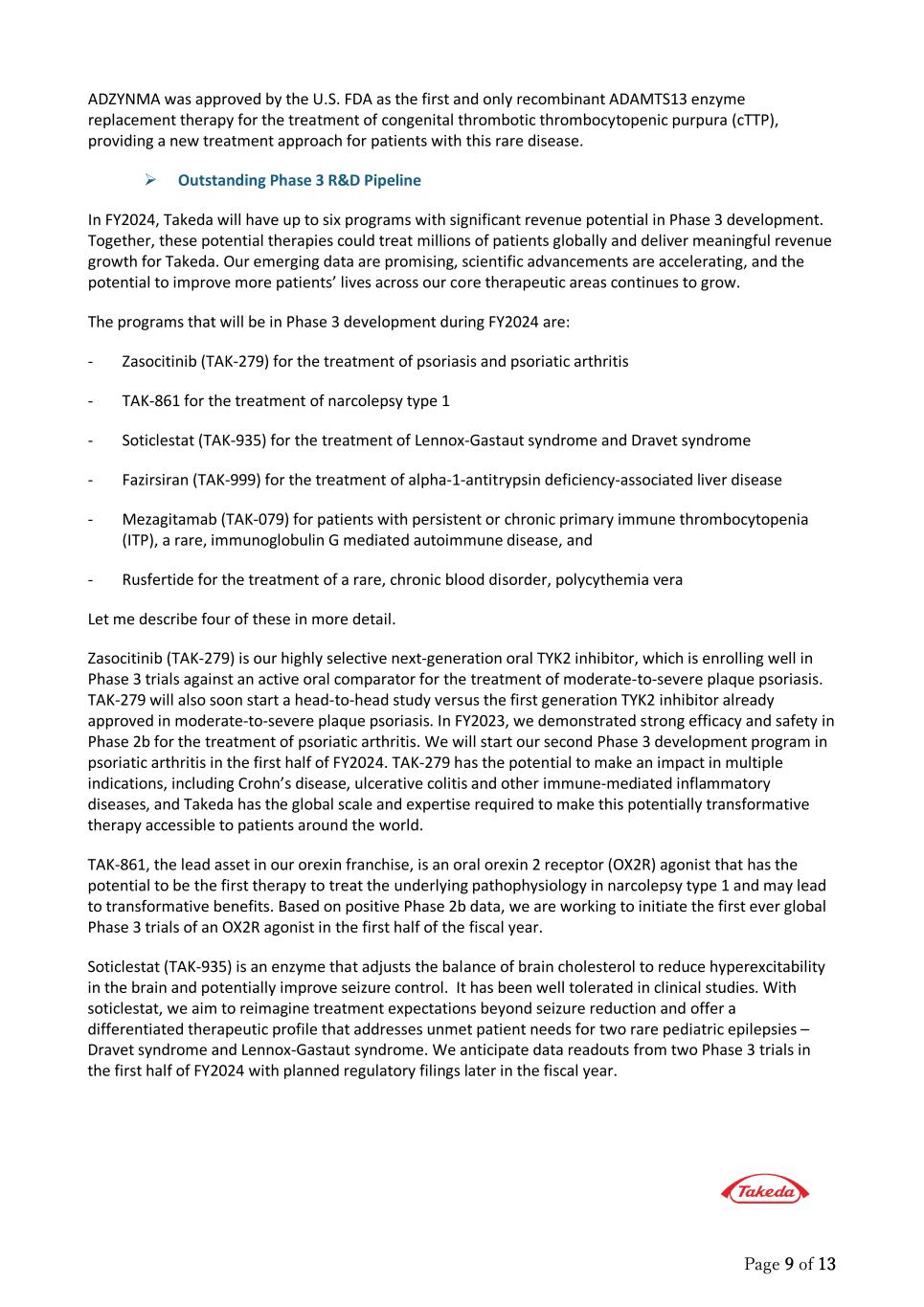 Page 9 of 13 ADZYNMA was approved by the U.S. FDA as the first and only recombinant ADAMTS13 enzyme replacement therapy for the treatment of congenital thrombotic thrombocytopenic purpura (cTTP), providing a new treatment approach for patients with this rare disease.  Outstanding Phase 3 R&D Pipeline In FY2024, Takeda will have up to six programs with significant revenue potential in Phase 3 development. Together, these potential therapies could treat millions of patients globally and deliver meaningful revenue growth for Takeda. Our emerging data are promising, scientific advancements are accelerating, and the potential to improve more patients’ lives across our core therapeutic areas continues to grow. The programs that will be in Phase 3 development during FY2024 are: - Zasocitinib (TAK-279) for the treatment of psoriasis and psoriatic arthritis - TAK-861 for the treatment of narcolepsy type 1 - Soticlestat (TAK-935) for the treatment of Lennox-Gastaut syndrome and Dravet syndrome - Fazirsiran (TAK-999) for the treatment of alpha-1-antitrypsin deficiency-associated liver disease - Mezagitamab (TAK-079) for patients with persistent or chronic primary immune thrombocytopenia (ITP), a rare, immunoglobulin G mediated autoimmune disease, and - Rusfertide for the treatment of a rare, chronic blood disorder, polycythemia vera Let me describe four of these in more detail. Zasocitinib (TAK-279) is our highly selective next-generation oral TYK2 inhibitor, which is enrolling well in Phase 3 trials against an active oral comparator for the treatment of moderate-to-severe plaque psoriasis. TAK-279 will also soon start a head-to-head study versus the first generation TYK2 inhibitor already approved in moderate-to-severe plaque psoriasis. In FY2023, we demonstrated strong efficacy and safety in Phase 2b for the treatment of psoriatic arthritis. We will start our second Phase 3 development program in psoriatic arthritis in the first half of FY2024. TAK-279 has the potential to make an impact in multiple indications, including Crohn’s disease, ulcerative colitis and other immune-mediated inflammatory diseases, and Takeda has the global scale and expertise required to make this potentially transformative therapy accessible to patients around the world. TAK-861, the lead asset in our orexin franchise, is an oral orexin 2 receptor (OX2R) agonist that has the potential to be the first therapy to treat the underlying pathophysiology in narcolepsy type 1 and may lead to transformative benefits. Based on positive Phase 2b data, we are working to initiate the first ever global Phase 3 trials of an OX2R agonist in the first half of the fiscal year. Soticlestat (TAK-935) is an enzyme that adjusts the balance of brain cholesterol to reduce hyperexcitability in the brain and potentially improve seizure control. It has been well tolerated in clinical studies. With soticlestat, we aim to reimagine treatment expectations beyond seizure reduction and offer a differentiated therapeutic profile that addresses unmet patient needs for two rare pediatric epilepsies – Dravet syndrome and Lennox-Gastaut syndrome. We anticipate data readouts from two Phase 3 trials in the first half of FY2024 with planned regulatory filings later in the fiscal year.