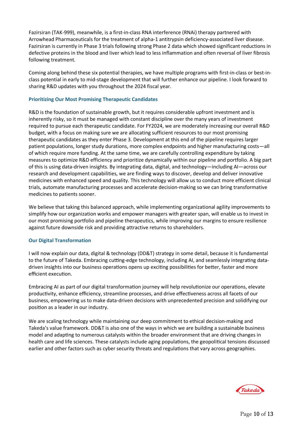 Page 10 of 13 Fazirsiran (TAK-999), meanwhile, is a first-in-class RNA interference (RNAi) therapy partnered with Arrowhead Pharmaceuticals for the treatment of alpha-1 antitrypsin deficiency-associated liver disease. Fazirsiran is currently in Phase 3 trials following strong Phase 2 data which showed significant reductions in defective proteins in the blood and liver which lead to less inflammation and often reversal of liver fibrosis following treatment. Coming along behind these six potential therapies, we have multiple programs with first-in-class or best-in- class potential in early to mid-stage development that will further enhance our pipeline. I look forward to sharing R&D updates with you throughout the 2024 fiscal year. Prioritizing Our Most Promising Therapeutic Candidates R&D is the foundation of sustainable growth, but it requires considerable upfront investment and is inherently risky, so it must be managed with constant discipline over the many years of investment required to pursue each therapeutic candidate. For FY2024, we are moderately increasing our overall R&D budget, with a focus on making sure we are allocating sufficient resources to our most promising therapeutic candidates as they enter Phase 3. Development at this end of the pipeline requires larger patient populations, longer study durations, more complex endpoints and higher manufacturing costs—all of which require more funding. At the same time, we are carefully controlling expenditure by taking measures to optimize R&D efficiency and prioritize dynamically within our pipeline and portfolio. A big part of this is using data-driven insights. By integrating data, digital, and technology—including AI—across our research and development capabilities, we are finding ways to discover, develop and deliver innovative medicines with enhanced speed and quality. This technology will allow us to conduct more efficient clinical trials, automate manufacturing processes and accelerate decision-making so we can bring transformative medicines to patients sooner. We believe that taking this balanced approach, while implementing organizational agility improvements to simplify how our organization works and empower managers with greater span, will enable us to invest in our most promising portfolio and pipeline therapeutics, while improving our margins to ensure resilience against future downside risk and providing attractive returns to shareholders. Our Digital Transformation I will now explain our data, digital & technology (DD&T) strategy in some detail, because it is fundamental to the future of Takeda. Embracing cu�ng-edge technology, including AI, and seamlessly integra�ng data- driven insights into our business opera�ons opens up exci�ng possibili�es for beter, faster and more efficient execu�on. Embracing AI as part of our digital transforma�on journey will help revolu�onize our opera�ons, elevate produc�vity, enhance efficiency, streamline processes, and drive effec�veness across all facets of our business, empowering us to make data-driven decisions with unprecedented precision and solidifying our posi�on as a leader in our industry. We are scaling technology while maintaining our deep commitment to ethical decision-making and Takeda’s value framework. DD&T is also one of the ways in which we are building a sustainable business model and adap�ng to numerous catalysts within the broader environment that are driving changes in health care and life sciences. These catalysts include aging popula�ons, the geopoli�cal tensions discussed earlier and other factors such as cyber security threats and regula�ons that vary across geographies.