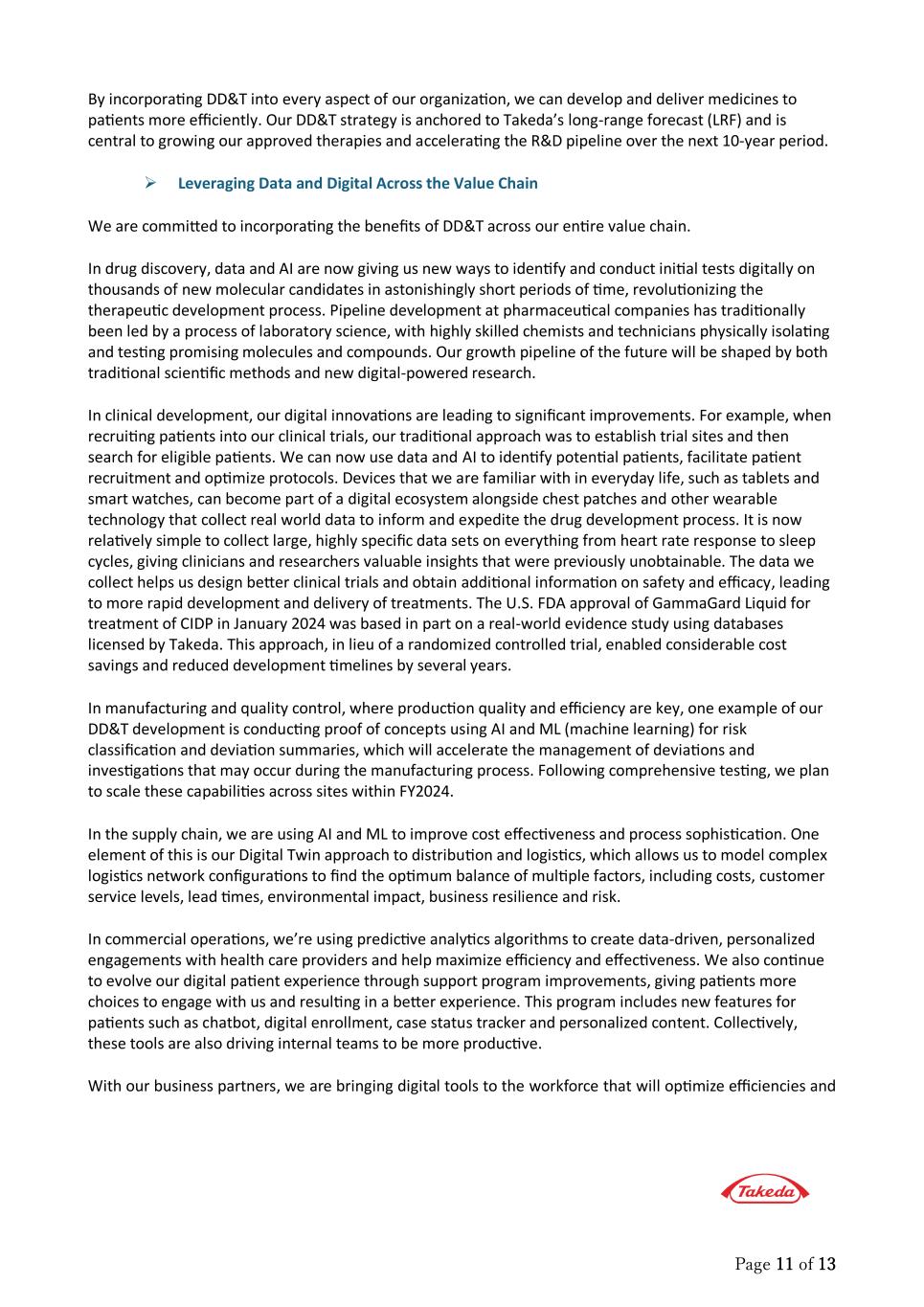 Page 11 of 13 By incorpora�ng DD&T into every aspect of our organiza�on, we can develop and deliver medicines to pa�ents more efficiently. Our DD&T strategy is anchored to Takeda’s long-range forecast (LRF) and is central to growing our approved therapies and accelera�ng the R&D pipeline over the next 10-year period.  Leveraging Data and Digital Across the Value Chain We are commited to incorpora�ng the benefits of DD&T across our en�re value chain. In drug discovery, data and AI are now giving us new ways to iden�fy and conduct ini�al tests digitally on thousands of new molecular candidates in astonishingly short periods of �me, revolu�onizing the therapeu�c development process. Pipeline development at pharmaceu�cal companies has tradi�onally been led by a process of laboratory science, with highly skilled chemists and technicians physically isola�ng and tes�ng promising molecules and compounds. Our growth pipeline of the future will be shaped by both tradi�onal scien�fic methods and new digital-powered research. In clinical development, our digital innova�ons are leading to significant improvements. For example, when recrui�ng pa�ents into our clinical trials, our tradi�onal approach was to establish trial sites and then search for eligible pa�ents. We can now use data and AI to iden�fy poten�al pa�ents, facilitate pa�ent recruitment and op�mize protocols. Devices that we are familiar with in everyday life, such as tablets and smart watches, can become part of a digital ecosystem alongside chest patches and other wearable technology that collect real world data to inform and expedite the drug development process. It is now rela�vely simple to collect large, highly specific data sets on everything from heart rate response to sleep cycles, giving clinicians and researchers valuable insights that were previously unobtainable. The data we collect helps us design beter clinical trials and obtain addi�onal informa�on on safety and efficacy, leading to more rapid development and delivery of treatments. The U.S. FDA approval of GammaGard Liquid for treatment of CIDP in January 2024 was based in part on a real-world evidence study using databases licensed by Takeda. This approach, in lieu of a randomized controlled trial, enabled considerable cost savings and reduced development �melines by several years. In manufacturing and quality control, where produc�on quality and efficiency are key, one example of our DD&T development is conduc�ng proof of concepts using AI and ML (machine learning) for risk classifica�on and devia�on summaries, which will accelerate the management of devia�ons and inves�ga�ons that may occur during the manufacturing process. Following comprehensive tes�ng, we plan to scale these capabili�es across sites within FY2024. In the supply chain, we are using AI and ML to improve cost effec�veness and process sophis�ca�on. One element of this is our Digital Twin approach to distribu�on and logis�cs, which allows us to model complex logis�cs network configura�ons to find the op�mum balance of mul�ple factors, including costs, customer service levels, lead �mes, environmental impact, business resilience and risk. In commercial opera�ons, we’re using predic�ve analy�cs algorithms to create data-driven, personalized engagements with health care providers and help maximize efficiency and effec�veness. We also con�nue to evolve our digital pa�ent experience through support program improvements, giving pa�ents more choices to engage with us and resul�ng in a beter experience. This program includes new features for pa�ents such as chatbot, digital enrollment, case status tracker and personalized content. Collec�vely, these tools are also driving internal teams to be more produc�ve. With our business partners, we are bringing digital tools to the workforce that will op�mize efficiencies and