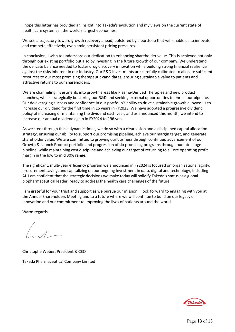 Page 13 of 13 I hope this letter has provided an insight into Takeda's evolution and my views on the current state of health care systems in the world’s largest economies. We see a trajectory toward growth recovery ahead, bolstered by a portfolio that will enable us to innovate and compete effectively, even amid persistent pricing pressures. In conclusion, I wish to underscore our dedication to enhancing shareholder value. This is achieved not only through our existing portfolio but also by investing in the future growth of our company. We understand the delicate balance needed to foster drug discovery innovation while building strong financial resilience against the risks inherent in our industry. Our R&D investments are carefully calibrated to allocate sufficient resources to our most promising therapeutic candidates, ensuring sustainable value to patients and attractive returns to our shareholders. We are channeling investments into growth areas like Plasma-Derived Therapies and new product launches, while strategically bolstering our R&D and seeking external opportunities to enrich our pipeline. Our deleveraging success and confidence in our portfolio's ability to drive sustainable growth allowed us to increase our dividend for the first time in 15 years in FY2023. We have adopted a progressive dividend policy of increasing or maintaining the dividend each year, and as announced this month, we intend to increase our annual dividend again in FY2024 to 196 yen. As we steer through these dynamic times, we do so with a clear vision and a disciplined capital allocation strategy, ensuring our ability to support our promising pipeline, achieve our margin target, and generate shareholder value. We are committed to growing our business through continued advancement of our Growth & Launch Product portfolio and progression of six promising programs through our late-stage pipeline, while maintaining cost discipline and achieving our target of returning to a Core operating profit margin in the low to mid 30% range. The significant, multi-year efficiency program we announced in FY2024 is focused on organizational agility, procurement saving, and capitalizing on our ongoing investment in data, digital and technology, including AI. I am confident that the strategic decisions we make today will solidify Takeda's status as a global biopharmaceutical leader, ready to address the health care challenges of the future. I am grateful for your trust and support as we pursue our mission. I look forward to engaging with you at the Annual Shareholders Meeting and to a future where we will continue to build on our legacy of innovation and our commitment to improving the lives of patients around the world. Warm regards, Christophe Weber, President & CEO Takeda Pharmaceutical Company Limited