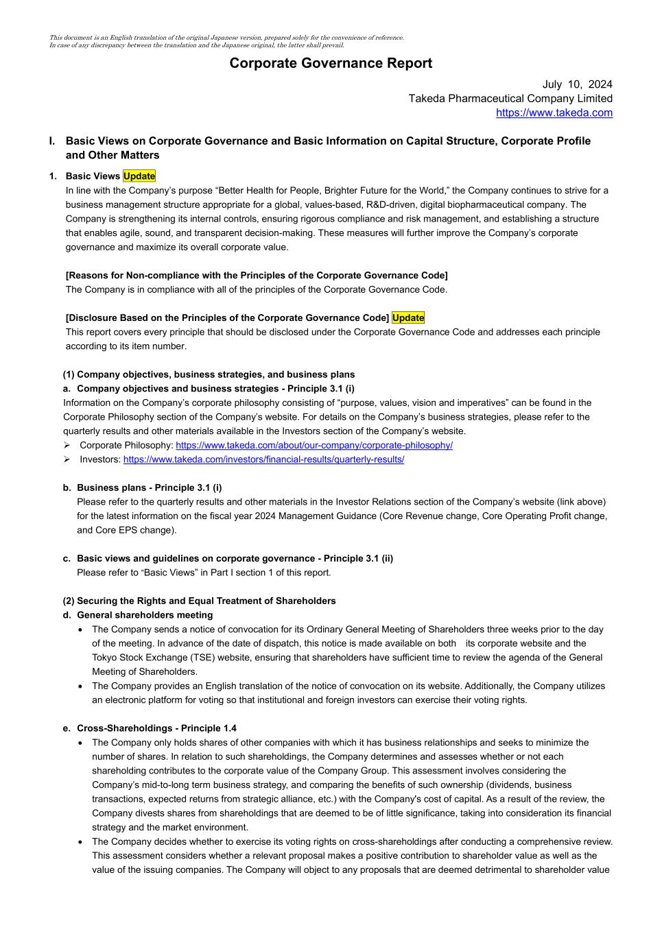 This document is an English translation of the original Japanese version, prepared solely for the convenience of reference. In case of any discrepancy between the translation and the Japanese original, the latter shall prevail. Corporate Governance Report July 10, 2024 Takeda Pharmaceutical Company Limited https://www.takeda.com I. Basic Views on Corporate Governance and Basic Information on Capital Structure, Corporate Profile and Other Matters 1. Basic Views Update In line with the Company’s purpose “Better Health for People, Brighter Future for the World,” the Company continues to strive for a business management structure appropriate for a global, values-based, R&D-driven, digital biopharmaceutical company. The Company is strengthening its internal controls, ensuring rigorous compliance and risk management, and establishing a structure that enables agile, sound, and transparent decision-making. These measures will further improve the Company’s corporate governance and maximize its overall corporate value. [Reasons for Non-compliance with the Principles of the Corporate Governance Code] The Company is in compliance with all of the principles of the Corporate Governance Code. [Disclosure Based on the Principles of the Corporate Governance Code] Update This report covers every principle that should be disclosed under the Corporate Governance Code and addresses each principle according to its item number. (1) Company objectives, business strategies, and business plans a. Company objectives and business strategies - Principle 3.1 (i) Information on the Company’s corporate philosophy consisting of “purpose, values, vision and imperatives” can be found in the Corporate Philosophy section of the Company’s website. For details on the Company’s business strategies, please refer to the quarterly results and other materials available in the Investors section of the Company’s website.  Corporate Philosophy: https://www.takeda.com/about/our-company/corporate-philosophy/  Investors: https://www.takeda.com/investors/financial-results/quarterly-results/ b. Business plans - Principle 3.1 (i) Please refer to the quarterly results and other materials in the Investor Relations section of the Company’s website (link above) for the latest information on the fiscal year 2024 Management Guidance (Core Revenue change, Core Operating Profit change, and Core EPS change). c. Basic views and guidelines on corporate governance - Principle 3.1 (ii) Please refer to “Basic Views” in Part I section 1 of this report. (2) Securing the Rights and Equal Treatment of Shareholders d. General shareholders meeting • The Company sends a notice of convocation for its Ordinary General Meeting of Shareholders three weeks prior to the day of the meeting. In advance of the date of dispatch, this notice is made available on both its corporate website and the Tokyo Stock Exchange (TSE) website, ensuring that shareholders have sufficient time to review the agenda of the General Meeting of Shareholders. • The Company provides an English translation of the notice of convocation on its website. Additionally, the Company utilizes an electronic platform for voting so that institutional and foreign investors can exercise their voting rights. e. Cross-Shareholdings - Principle 1.4 • The Company only holds shares of other companies with which it has business relationships and seeks to minimize the number of shares. In relation to such shareholdings, the Company determines and assesses whether or not each shareholding contributes to the corporate value of the Company Group. This assessment involves considering the Company’s mid-to-long term business strategy, and comparing the benefits of such ownership (dividends, business transactions, expected returns from strategic alliance, etc.) with the Company's cost of capital. As a result of the review, the Company divests shares from shareholdings that are deemed to be of little significance, taking into consideration its financial strategy and the market environment. • The Company decides whether to exercise its voting rights on cross-shareholdings after conducting a comprehensive review. This assessment considers whether a relevant proposal makes a positive contribution to shareholder value as well as the value of the issuing companies. The Company will object to any proposals that are deemed detrimental to shareholder value