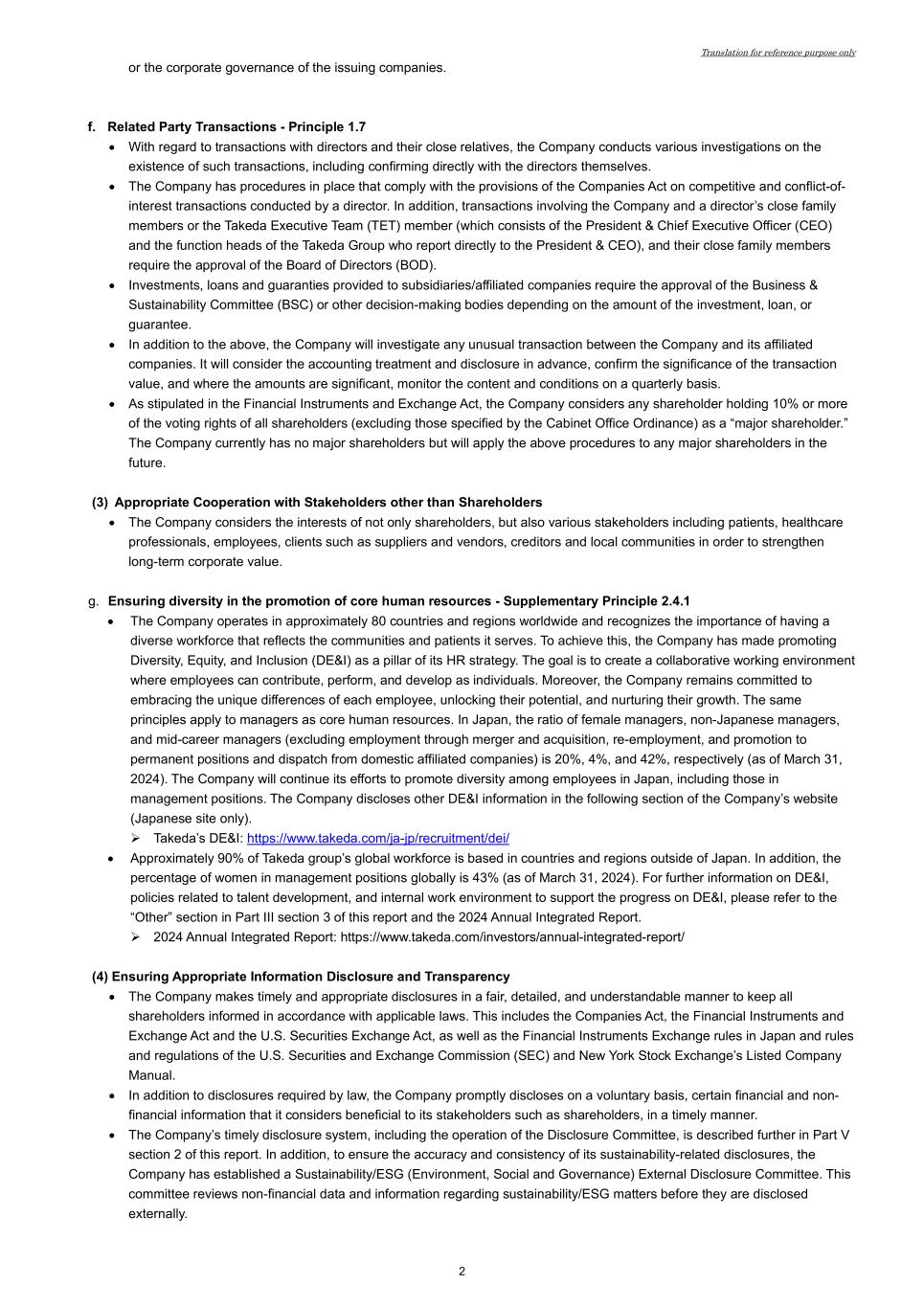 Translation for reference purpose only 2 or the corporate governance of the issuing companies. f. Related Party Transactions - Principle 1.7 • With regard to transactions with directors and their close relatives, the Company conducts various investigations on the existence of such transactions, including confirming directly with the directors themselves. • The Company has procedures in place that comply with the provisions of the Companies Act on competitive and conflict-of- interest transactions conducted by a director. In addition, transactions involving the Company and a director’s close family members or the Takeda Executive Team (TET) member (which consists of the President & Chief Executive Officer (CEO) and the function heads of the Takeda Group who report directly to the President & CEO), and their close family members require the approval of the Board of Directors (BOD). • Investments, loans and guaranties provided to subsidiaries/affiliated companies require the approval of the Business & Sustainability Committee (BSC) or other decision-making bodies depending on the amount of the investment, loan, or guarantee. • In addition to the above, the Company will investigate any unusual transaction between the Company and its affiliated companies. It will consider the accounting treatment and disclosure in advance, confirm the significance of the transaction value, and where the amounts are significant, monitor the content and conditions on a quarterly basis. • As stipulated in the Financial Instruments and Exchange Act, the Company considers any shareholder holding 10% or more of the voting rights of all shareholders (excluding those specified by the Cabinet Office Ordinance) as a “major shareholder.” The Company currently has no major shareholders but will apply the above procedures to any major shareholders in the future. (3) Appropriate Cooperation with Stakeholders other than Shareholders • The Company considers the interests of not only shareholders, but also various stakeholders including patients, healthcare professionals, employees, clients such as suppliers and vendors, creditors and local communities in order to strengthen long-term corporate value. g. Ensuring diversity in the promotion of core human resources - Supplementary Principle 2.4.1 • The Company operates in approximately 80 countries and regions worldwide and recognizes the importance of having a diverse workforce that reflects the communities and patients it serves. To achieve this, the Company has made promoting Diversity, Equity, and Inclusion (DE&I) as a pillar of its HR strategy. The goal is to create a collaborative working environment where employees can contribute, perform, and develop as individuals. Moreover, the Company remains committed to embracing the unique differences of each employee, unlocking their potential, and nurturing their growth. The same principles apply to managers as core human resources. In Japan, the ratio of female managers, non-Japanese managers, and mid-career managers (excluding employment through merger and acquisition, re-employment, and promotion to permanent positions and dispatch from domestic affiliated companies) is 20%, 4%, and 42%, respectively (as of March 31, 2024). The Company will continue its efforts to promote diversity among employees in Japan, including those in management positions. The Company discloses other DE&I information in the following section of the Company’s website (Japanese site only).  Takeda’s DE&I: https://www.takeda.com/ja-jp/recruitment/dei/ • Approximately 90% of Takeda group’s global workforce is based in countries and regions outside of Japan. In addition, the percentage of women in management positions globally is 43% (as of March 31, 2024). For further information on DE&I, policies related to talent development, and internal work environment to support the progress on DE&I, please refer to the “Other” section in Part III section 3 of this report and the 2024 Annual Integrated Report.  2024 Annual Integrated Report: https://www.takeda.com/investors/annual-integrated-report/ (4) Ensuring Appropriate Information Disclosure and Transparency • The Company makes timely and appropriate disclosures in a fair, detailed, and understandable manner to keep all shareholders informed in accordance with applicable laws. This includes the Companies Act, the Financial Instruments and Exchange Act and the U.S. Securities Exchange Act, as well as the Financial Instruments Exchange rules in Japan and rules and regulations of the U.S. Securities and Exchange Commission (SEC) and New York Stock Exchange’s Listed Company Manual. • In addition to disclosures required by law, the Company promptly discloses on a voluntary basis, certain financial and non- financial information that it considers beneficial to its stakeholders such as shareholders, in a timely manner. • The Company’s timely disclosure system, including the operation of the Disclosure Committee, is described further in Part V section 2 of this report. In addition, to ensure the accuracy and consistency of its sustainability-related disclosures, the Company has established a Sustainability/ESG (Environment, Social and Governance) External Disclosure Committee. This committee reviews non-financial data and information regarding sustainability/ESG matters before they are disclosed externally.