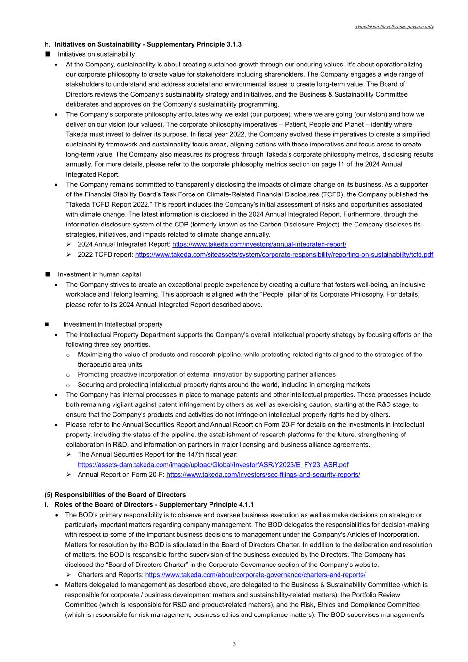 Translation for reference purpose only 3 h. Initiatives on Sustainability - Supplementary Principle 3.1.3 ■ Initiatives on sustainability • At the Company, sustainability is about creating sustained growth through our enduring values. It’s about operationalizing our corporate philosophy to create value for stakeholders including shareholders. The Company engages a wide range of stakeholders to understand and address societal and environmental issues to create long-term value. The Board of Directors reviews the Company’s sustainability strategy and initiatives, and the Business & Sustainability Committee deliberates and approves on the Company’s sustainability programming. • The Company’s corporate philosophy articulates why we exist (our purpose), where we are going (our vision) and how we deliver on our vision (our values). The corporate philosophy imperatives – Patient, People and Planet – identify where Takeda must invest to deliver its purpose. In fiscal year 2022, the Company evolved these imperatives to create a simplified sustainability framework and sustainability focus areas, aligning actions with these imperatives and focus areas to create long-term value. The Company also measures its progress through Takeda’s corporate philosophy metrics, disclosing results annually. For more details, please refer to the corporate philosophy metrics section on page 11 of the 2024 Annual Integrated Report. • The Company remains committed to transparently disclosing the impacts of climate change on its business. As a supporter of the Financial Stability Board’s Task Force on Climate-Related Financial Disclosures (TCFD), the Company published the “Takeda TCFD Report 2022.” This report includes the Company’s initial assessment of risks and opportunities associated with climate change. The latest information is disclosed in the 2024 Annual Integrated Report. Furthermore, through the information disclosure system of the CDP (formerly known as the Carbon Disclosure Project), the Company discloses its strategies, initiatives, and impacts related to climate change annually.  2024 Annual Integrated Report: https://www.takeda.com/investors/annual-integrated-report/  2022 TCFD report: https://www.takeda.com/siteassets/system/corporate-responsibility/reporting-on-sustainability/tcfd.pdf ■ Investment in human capital • The Company strives to create an exceptional people experience by creating a culture that fosters well-being, an inclusive workplace and lifelong learning. This approach is aligned with the “People” pillar of its Corporate Philosophy. For details, please refer to its 2024 Annual Integrated Report described above.  Investment in intellectual property • The Intellectual Property Department supports the Company’s overall intellectual property strategy by focusing efforts on the following three key priorities. o Maximizing the value of products and research pipeline, while protecting related rights aligned to the strategies of the therapeutic area units o Promoting proactive incorporation of external innovation by supporting partner alliances o Securing and protecting intellectual property rights around the world, including in emerging markets • The Company has internal processes in place to manage patents and other intellectual properties. These processes include both remaining vigilant against patent infringement by others as well as exercising caution, starting at the R&D stage, to ensure that the Company’s products and activities do not infringe on intellectual property rights held by others. • Please refer to the Annual Securities Report and Annual Report on Form 20-F for details on the investments in intellectual property, including the status of the pipeline, the establishment of research platforms for the future, strengthening of collaboration in R&D, and information on partners in major licensing and business alliance agreements.  The Annual Securities Report for the 147th fiscal year: https://assets-dam.takeda.com/image/upload/Global/Investor/ASR/Y2023/E_FY23_ASR.pdf  Annual Report on Form 20-F: https://www.takeda.com/investors/sec-filings-and-security-reports/ (5) Responsibilities of the Board of Directors i. Roles of the Board of Directors - Supplementary Principle 4.1.1 • The BOD’s primary responsibility is to observe and oversee business execution as well as make decisions on strategic or particularly important matters regarding company management. The BOD delegates the responsibilities for decision-making with respect to some of the important business decisions to management under the Company's Articles of Incorporation. Matters for resolution by the BOD is stipulated in the Board of Directors Charter. In addition to the deliberation and resolution of matters, the BOD is responsible for the supervision of the business executed by the Directors. The Company has disclosed the “Board of Directors Charter” in the Corporate Governance section of the Company’s website.  Charters and Reports: https://www.takeda.com/about/corporate-governance/charters-and-reports/ • Matters delegated to management as described above, are delegated to the Business & Sustainability Committee (which is responsible for corporate / business development matters and sustainability-related matters), the Portfolio Review Committee (which is responsible for R&D and product-related matters), and the Risk, Ethics and Compliance Committee (which is responsible for risk management, business ethics and compliance matters). The BOD supervises management's