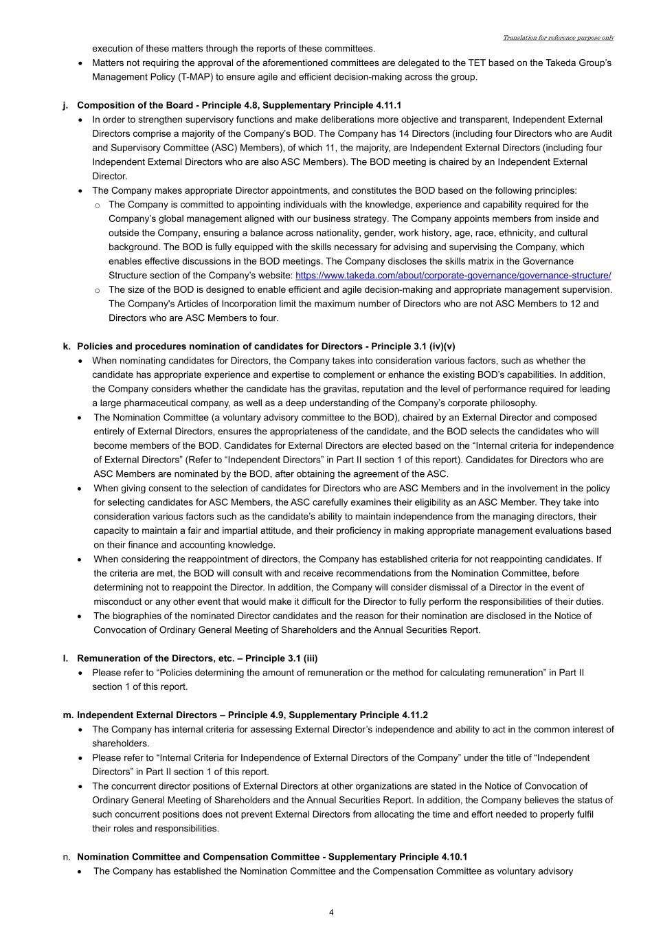 Translation for reference purpose only 4 execution of these matters through the reports of these committees. • Matters not requiring the approval of the aforementioned committees are delegated to the TET based on the Takeda Group’s Management Policy (T-MAP) to ensure agile and efficient decision-making across the group. j. Composition of the Board - Principle 4.8, Supplementary Principle 4.11.1 • In order to strengthen supervisory functions and make deliberations more objective and transparent, Independent External Directors comprise a majority of the Company’s BOD. The Company has 14 Directors (including four Directors who are Audit and Supervisory Committee (ASC) Members), of which 11, the majority, are Independent External Directors (including four Independent External Directors who are also ASC Members). The BOD meeting is chaired by an Independent External Director. • The Company makes appropriate Director appointments, and constitutes the BOD based on the following principles: o The Company is committed to appointing individuals with the knowledge, experience and capability required for the Company’s global management aligned with our business strategy. The Company appoints members from inside and outside the Company, ensuring a balance across nationality, gender, work history, age, race, ethnicity, and cultural background. The BOD is fully equipped with the skills necessary for advising and supervising the Company, which enables effective discussions in the BOD meetings. The Company discloses the skills matrix in the Governance Structure section of the Company’s website: https://www.takeda.com/about/corporate-governance/governance-structure/ o The size of the BOD is designed to enable efficient and agile decision-making and appropriate management supervision. The Company's Articles of Incorporation limit the maximum number of Directors who are not ASC Members to 12 and Directors who are ASC Members to four. k. Policies and procedures nomination of candidates for Directors - Principle 3.1 (iv)(v) • When nominating candidates for Directors, the Company takes into consideration various factors, such as whether the candidate has appropriate experience and expertise to complement or enhance the existing BOD’s capabilities. In addition, the Company considers whether the candidate has the gravitas, reputation and the level of performance required for leading a large pharmaceutical company, as well as a deep understanding of the Company’s corporate philosophy. • The Nomination Committee (a voluntary advisory committee to the BOD), chaired by an External Director and composed entirely of External Directors, ensures the appropriateness of the candidate, and the BOD selects the candidates who will become members of the BOD. Candidates for External Directors are elected based on the “Internal criteria for independence of External Directors” (Refer to “Independent Directors” in Part II section 1 of this report). Candidates for Directors who are ASC Members are nominated by the BOD, after obtaining the agreement of the ASC. • When giving consent to the selection of candidates for Directors who are ASC Members and in the involvement in the policy for selecting candidates for ASC Members, the ASC carefully examines their eligibility as an ASC Member. They take into consideration various factors such as the candidate’s ability to maintain independence from the managing directors, their capacity to maintain a fair and impartial attitude, and their proficiency in making appropriate management evaluations based on their finance and accounting knowledge. • When considering the reappointment of directors, the Company has established criteria for not reappointing candidates. If the criteria are met, the BOD will consult with and receive recommendations from the Nomination Committee, before determining not to reappoint the Director. In addition, the Company will consider dismissal of a Director in the event of misconduct or any other event that would make it difficult for the Director to fully perform the responsibilities of their duties. • The biographies of the nominated Director candidates and the reason for their nomination are disclosed in the Notice of Convocation of Ordinary General Meeting of Shareholders and the Annual Securities Report. l. Remuneration of the Directors, etc. – Principle 3.1 (iii) • Please refer to “Policies determining the amount of remuneration or the method for calculating remuneration” in Part II section 1 of this report. m. Independent External Directors – Principle 4.9, Supplementary Principle 4.11.2 • The Company has internal criteria for assessing External Director’s independence and ability to act in the common interest of shareholders. • Please refer to “Internal Criteria for Independence of External Directors of the Company” under the title of “Independent Directors” in Part II section 1 of this report. • The concurrent director positions of External Directors at other organizations are stated in the Notice of Convocation of Ordinary General Meeting of Shareholders and the Annual Securities Report. In addition, the Company believes the status of such concurrent positions does not prevent External Directors from allocating the time and effort needed to properly fulfil their roles and responsibilities. n. Nomination Committee and Compensation Committee - Supplementary Principle 4.10.1 • The Company has established the Nomination Committee and the Compensation Committee as voluntary advisory