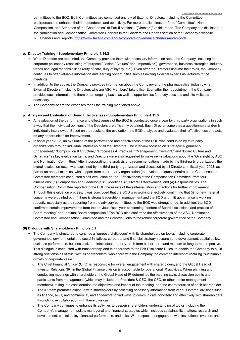 Translation for reference purpose only 5 committees to the BOD. Both Committees are comprised entirely of External Directors, including the Committee chairpersons, to enhance their independence and objectivity. For more details, please refer to “Committee’s Name, Composition, and Attributes of the Chairperson” of Part II section 1 “[Directors]” of this report. The Company has disclosed the Nomination and Compensation Committee Charters in the Charters and Reports section of the Company’s website.  Charters and Reports: https://www.takeda.com/about/corporate-governance/charters-and-reports/ o. Director Training - Supplementary Principle 4.14.2 • When Directors are appointed, the Company provides them with necessary information about the Company, including its corporate philosophy (consisting of “purpose,” “vision,” “values” and “imperatives”), governance, business strategies, industry trends and legal responsibilities (duty of care, duty of loyalty, etc.). Even after the Directors assume their roles, the Company continues to offer valuable information and learning opportunities such as inviting external experts as lecturers to the meetings. • In addition to the above, the Company provides information about the Company and the pharmaceutical industry when External Directors (including Directors who are ASC Members) take office. Even after their appointment, the Company provides such information to them on an ongoing basis, as well as opportunities for study sessions and site visits, as necessary. • The Company bears the expenses for all the training mentioned above. p. Analysis and Evaluation of Board Effectiveness - Supplementary Principle 4.11.3 • An evaluation of the performance and effectiveness of the BOD is conducted once a year by third party organizations in such a way that the individual opinions of the Directors are efficiently obtained. Each Director completes a questionnaire and/or is individually interviewed. Based on the results of the evaluation, the BOD analyzes and evaluates their effectiveness and acts on any opportunities for improvement. • In fiscal year 2023, an evaluation of the performance and effectiveness of the BOD was conducted by third party organizations through individual interviews of all the Directors. The interview focused on “Strategic Alignment & Engagement,” “Composition & Structure,” “Processes & Practices,” “Management Oversight,” and “Board Culture and Dynamics” as key evaluation items, and Directors were also requested to make self-evaluations about the “Oversight by ASC and Nomination Committee.” After incorporating the analysis and recommendations made by the third-party organization, the overall evaluation result was explained by the third-party organization and discussed by all Directors. In fiscal year 2023, as part of an annual exercise, with support from a third-party organization (to develop the questionnaires), the Compensation Committee members conducted a self-evaluation on the “Effectiveness of the Compensation Committee” from four dimensions: (1) Composition and Leadership, (2) Meetings, (3) Overall Effectiveness, and (4) Responsibilities. The Compensation Committee reported to the BOD the results of the self-evaluation and actions for further improvement. Through this evaluation process, it was concluded that the BOD was working effectively, confirming that (i) no new material concerns were pointed out (ii) there is strong leadership in management and the BOD and, (iii) governance is working robustly, especially as the reporting from the advisory committees to the BOD was strengthened. In addition, the BOD confirmed certain improvements from the previous fiscal year concerning “content of Board discussions and practice of Board meeting” and “optimal Board composition.” The BOD also confirmed the effectiveness of the ASC, Nomination Committee and Compensation Committee and their contributions to the robust corporate governance of the Company. (6) Dialogue with Shareholders - Principle 5.1 • The Company is structured to continue a “purposeful dialogue” with its shareholders on topics including corporate governance, environmental and social initiatives, corporate and financial strategy, research and development, capital policy, business performance, business risk and intellectual property, each from a short-term and medium-to-long-term perspective. This dialogue is conducted with transparency, and in adherence to the Fair Disclosure Rules, to enable the Company to build strong relationships of trust with its shareholders, who share with the Company the common interest of realizing “sustainable growth of corporate value.” o The Chief Financial Officer (CFO) is responsible for overall engagement with shareholders, and the Global Head of Investor Relations (IR) in the Global Finance division is accountable for operational IR activities. When planning and conducting meetings with shareholders, the Global Head of IR determines the meeting style, discussion points and participants from management (which may include the President & CEO, the CFO, or other senior management members), taking into consideration the objectives and impact of the meeting, and the characteristics of each shareholder. o The IR team promotes dialogue with shareholders by collecting necessary information from various internal divisions such as finance, R&D, and commercial, and endeavors to find ways to communicate concisely and effectively with shareholders through close collaboration with these divisions. o The Company continues to enhance its activities to deepen shareholders' understanding of topics including the Company's management policy, managerial and financial strategies which includes sustainability matters, research and development, capital policy, financial performance, and risks. With respect to engagement with institutional investors and