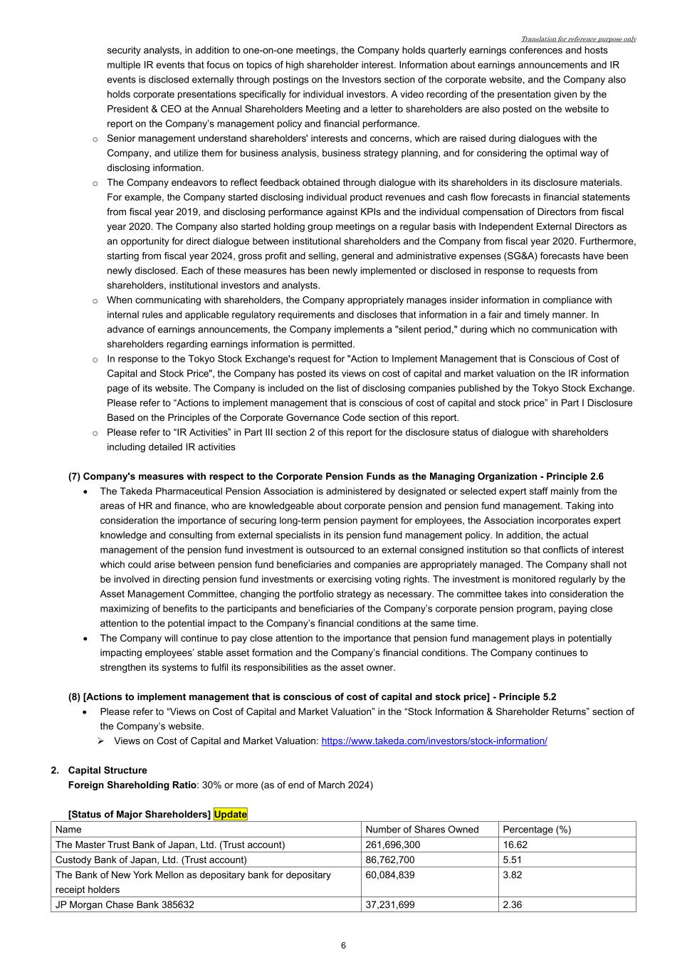 Translation for reference purpose only 6 security analysts, in addition to one-on-one meetings, the Company holds quarterly earnings conferences and hosts multiple IR events that focus on topics of high shareholder interest. Information about earnings announcements and IR events is disclosed externally through postings on the Investors section of the corporate website, and the Company also holds corporate presentations specifically for individual investors. A video recording of the presentation given by the President & CEO at the Annual Shareholders Meeting and a letter to shareholders are also posted on the website to report on the Company’s management policy and financial performance. o Senior management understand shareholders' interests and concerns, which are raised during dialogues with the Company, and utilize them for business analysis, business strategy planning, and for considering the optimal way of disclosing information. o The Company endeavors to reflect feedback obtained through dialogue with its shareholders in its disclosure materials. For example, the Company started disclosing individual product revenues and cash flow forecasts in financial statements from fiscal year 2019, and disclosing performance against KPIs and the individual compensation of Directors from fiscal year 2020. The Company also started holding group meetings on a regular basis with Independent External Directors as an opportunity for direct dialogue between institutional shareholders and the Company from fiscal year 2020. Furthermore, starting from fiscal year 2024, gross profit and selling, general and administrative expenses (SG&A) forecasts have been newly disclosed. Each of these measures has been newly implemented or disclosed in response to requests from shareholders, institutional investors and analysts. o When communicating with shareholders, the Company appropriately manages insider information in compliance with internal rules and applicable regulatory requirements and discloses that information in a fair and timely manner. In advance of earnings announcements, the Company implements a "silent period," during which no communication with shareholders regarding earnings information is permitted. o In response to the Tokyo Stock Exchange's request for "Action to Implement Management that is Conscious of Cost of Capital and Stock Price", the Company has posted its views on cost of capital and market valuation on the IR information page of its website. The Company is included on the list of disclosing companies published by the Tokyo Stock Exchange. Please refer to “Actions to implement management that is conscious of cost of capital and stock price” in Part I Disclosure Based on the Principles of the Corporate Governance Code section of this report. o Please refer to “IR Activities” in Part III section 2 of this report for the disclosure status of dialogue with shareholders including detailed IR activities (7) Company's measures with respect to the Corporate Pension Funds as the Managing Organization - Principle 2.6 • The Takeda Pharmaceutical Pension Association is administered by designated or selected expert staff mainly from the areas of HR and finance, who are knowledgeable about corporate pension and pension fund management. Taking into consideration the importance of securing long-term pension payment for employees, the Association incorporates expert knowledge and consulting from external specialists in its pension fund management policy. In addition, the actual management of the pension fund investment is outsourced to an external consigned institution so that conflicts of interest which could arise between pension fund beneficiaries and companies are appropriately managed. The Company shall not be involved in directing pension fund investments or exercising voting rights. The investment is monitored regularly by the Asset Management Committee, changing the portfolio strategy as necessary. The committee takes into consideration the maximizing of benefits to the participants and beneficiaries of the Company’s corporate pension program, paying close attention to the potential impact to the Company’s financial conditions at the same time. • The Company will continue to pay close attention to the importance that pension fund management plays in potentially impacting employees’ stable asset formation and the Company’s financial conditions. The Company continues to strengthen its systems to fulfil its responsibilities as the asset owner. (8) [Actions to implement management that is conscious of cost of capital and stock price] - Principle 5.2 • Please refer to “Views on Cost of Capital and Market Valuation” in the “Stock Information & Shareholder Returns” section of the Company’s website.  Views on Cost of Capital and Market Valuation: https://www.takeda.com/investors/stock-information/ 2. Capital Structure Foreign Shareholding Ratio: 30% or more (as of end of March 2024) [Status of Major Shareholders] Update Name Number of Shares Owned Percentage (%) The Master Trust Bank of Japan, Ltd. (Trust account) 261,696,300 16.62 Custody Bank of Japan, Ltd. (Trust account) 86,762,700 5.51 The Bank of New York Mellon as depositary bank for depositary receipt holders 60,084,839 3.82 JP Morgan Chase Bank 385632 37,231,699 2.36