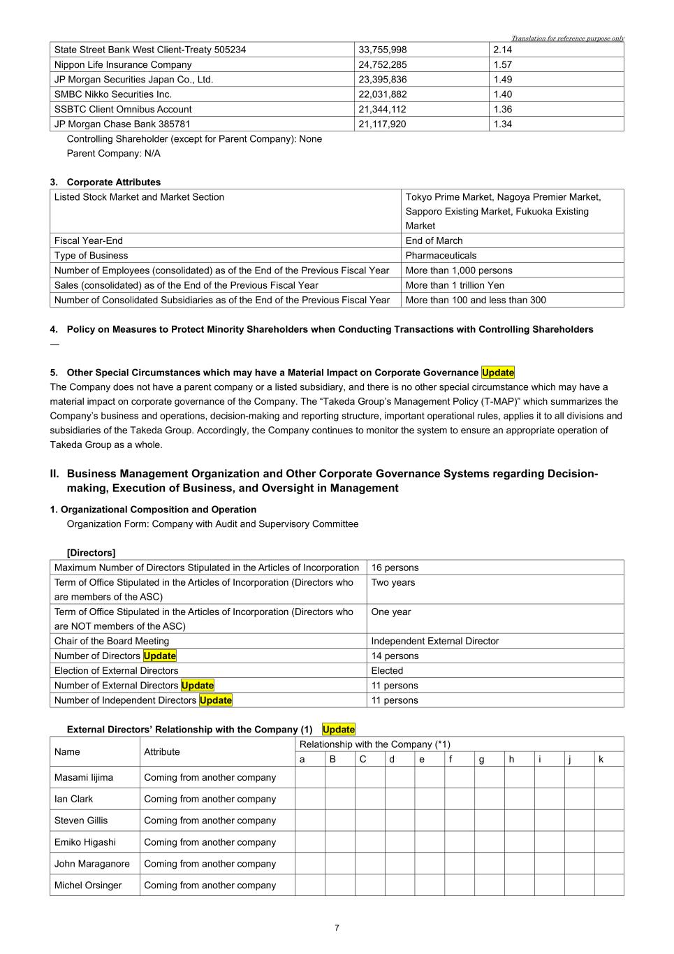 Translation for reference purpose only 7 State Street Bank West Client-Treaty 505234 33,755,998 2.14 Nippon Life Insurance Company 24,752,285 1.57 JP Morgan Securities Japan Co., Ltd. 23,395,836 1.49 SMBC Nikko Securities Inc. 22,031,882 1.40 SSBTC Client Omnibus Account 21,344,112 1.36 JP Morgan Chase Bank 385781 21,117,920 1.34 Controlling Shareholder (except for Parent Company): None Parent Company: N/A 3. Corporate Attributes Listed Stock Market and Market Section Tokyo Prime Market, Nagoya Premier Market, Sapporo Existing Market, Fukuoka Existing Market Fiscal Year-End End of March Type of Business Pharmaceuticals Number of Employees (consolidated) as of the End of the Previous Fiscal Year More than 1,000 persons Sales (consolidated) as of the End of the Previous Fiscal Year More than 1 trillion Yen Number of Consolidated Subsidiaries as of the End of the Previous Fiscal Year More than 100 and less than 300 4. Policy on Measures to Protect Minority Shareholders when Conducting Transactions with Controlling Shareholders ― 5. Other Special Circumstances which may have a Material Impact on Corporate Governance Update The Company does not have a parent company or a listed subsidiary, and there is no other special circumstance which may have a material impact on corporate governance of the Company. The “Takeda Group’s Management Policy (T-MAP)” which summarizes the Company’s business and operations, decision-making and reporting structure, important operational rules, applies it to all divisions and subsidiaries of the Takeda Group. Accordingly, the Company continues to monitor the system to ensure an appropriate operation of Takeda Group as a whole. II. Business Management Organization and Other Corporate Governance Systems regarding Decision- making, Execution of Business, and Oversight in Management 1. Organizational Composition and Operation Organization Form: Company with Audit and Supervisory Committee [Directors] Maximum Number of Directors Stipulated in the Articles of Incorporation 16 persons Term of Office Stipulated in the Articles of Incorporation (Directors who are members of the ASC) Two years Term of Office Stipulated in the Articles of Incorporation (Directors who are NOT members of the ASC) One year Chair of the Board Meeting Independent External Director Number of Directors Update 14 persons Election of External Directors Elected Number of External Directors Update 11 persons Number of Independent Directors Update 11 persons External Directors’ Relationship with the Company (1) Update Name Attribute Relationship with the Company (*1) a B C d e f g h i j k Masami Iijima Coming from another company Ian Clark Coming from another company Steven Gillis Coming from another company Emiko Higashi Coming from another company John Maraganore Coming from another company Michel Orsinger Coming from another company