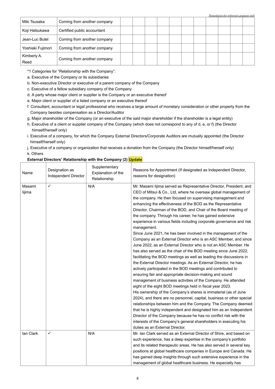 Translation for reference purpose only 8 Miki Tsusaka Coming from another company Koji Hatsukawa Certified public accountant Jean-Luc Butel Coming from another company Yoshiaki Fujimori Coming from another company Kimberly A. Reed Coming from another company *1 Categories for “Relationship with the Company”: a. Executive of the Company or its subsidiaries b. Non-executive Director or executive of a parent company of the Company c. Executive of a fellow subsidiary company of the Company d. A party whose major client or supplier is the Company or an executive thereof e. Major client or supplier of a listed company or an executive thereof f. Consultant, accountant or legal professional who receives a large amount of monetary consideration or other property from the Company besides compensation as a Director/Auditor g. Major shareholder of the Company (or an executive of the said major shareholder if the shareholder is a legal entity) h. Executive of a client or supplier company of the Company (which does not correspond to any of d, e, or f) (the Director himself/herself only) i. Executive of a company, for which the Company External Directors/Corporate Auditors are mutually appointed (the Director himself/herself only) j. Executive of a company or organization that receives a donation from the Company (the Director himself/herself only) k. Others External Directors’ Relationship with the Company (2) Update Name Designation as Independent Director Supplementary Explanation of the Relationship Reasons for Appointment (If designated as Independent Director, reasons for designation) Masami Iijima  N/A Mr. Masami Iijima served as Representative Director, President, and CEO of Mitsui & Co., Ltd, where he oversaw global management of the company. He then focused on supervising management and enhancing the effectiveness of the BOD as the Representative Director, Chairman of the BOD, and Chair of the Board meeting of the company. Through his career, he has gained extensive experience in various fields including corporate governance and risk management. Since June 2021, he has been involved in the management of the Company as an External Director who is an ASC Member, and since June 2022, as an External Director who is not an ASC Member. He has also served as the chair of the BOD meeting since June 2022, facilitating the BOD meetings as well as leading the discussions in the External Director meetings. As an External Director, he has actively participated in the BOD meetings and contributed to ensuring fair and appropriate decision-making and sound management of business activities of the Company. He attended eight of the eight BOD meetings held in fiscal year 2023. His ownership of the Company’s shares is immaterial (as of June 2024), and there are no personnel, capital, business or other special relationships between him and the Company. The Company deemed that he is highly independent and designated him as an Independent Director of the Company because he has no conflict risk with the interests of the Company’s general shareholders in executing his duties as an External Director. Ian Clark  N/A Mr. Ian Clark served as an External Director of Shire, and based on such experience, has a deep expertise in the company’s portfolio and its related therapeutic areas. He has also served in several key positions at global healthcare companies in Europe and Canada. He has gained deep insights through such extensive experience in the management of global healthcare business. He especially has