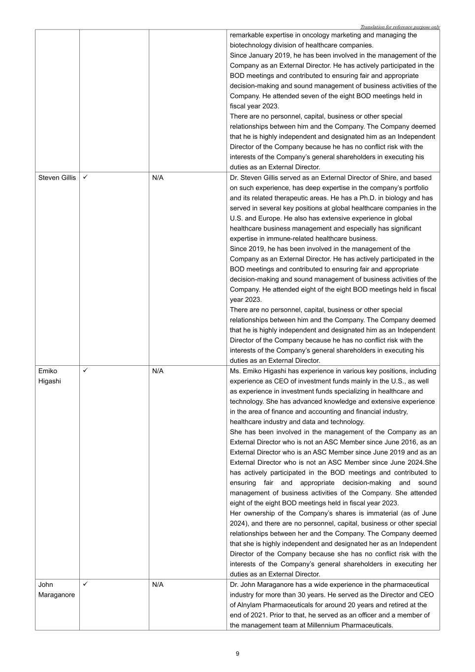 Translation for reference purpose only 9 remarkable expertise in oncology marketing and managing the biotechnology division of healthcare companies. Since January 2019, he has been involved in the management of the Company as an External Director. He has actively participated in the BOD meetings and contributed to ensuring fair and appropriate decision-making and sound management of business activities of the Company. He attended seven of the eight BOD meetings held in fiscal year 2023. There are no personnel, capital, business or other special relationships between him and the Company. The Company deemed that he is highly independent and designated him as an Independent Director of the Company because he has no conflict risk with the interests of the Company’s general shareholders in executing his duties as an External Director. Steven Gillis  N/A Dr. Steven Gillis served as an External Director of Shire, and based on such experience, has deep expertise in the company’s portfolio and its related therapeutic areas. He has a Ph.D. in biology and has served in several key positions at global healthcare companies in the U.S. and Europe. He also has extensive experience in global healthcare business management and especially has significant expertise in immune-related healthcare business. Since 2019, he has been involved in the management of the Company as an External Director. He has actively participated in the BOD meetings and contributed to ensuring fair and appropriate decision-making and sound management of business activities of the Company. He attended eight of the eight BOD meetings held in fiscal year 2023. There are no personnel, capital, business or other special relationships between him and the Company. The Company deemed that he is highly independent and designated him as an Independent Director of the Company because he has no conflict risk with the interests of the Company’s general shareholders in executing his duties as an External Director. Emiko Higashi  N/A Ms. Emiko Higashi has experience in various key positions, including experience as CEO of investment funds mainly in the U.S., as well as experience in investment funds specializing in healthcare and technology. She has advanced knowledge and extensive experience in the area of finance and accounting and financial industry, healthcare industry and data and technology. She has been involved in the management of the Company as an External Director who is not an ASC Member since June 2016, as an External Director who is an ASC Member since June 2019 and as an External Director who is not an ASC Member since June 2024.She has actively participated in the BOD meetings and contributed to ensuring fair and appropriate decision-making and sound management of business activities of the Company. She attended eight of the eight BOD meetings held in fiscal year 2023. Her ownership of the Company’s shares is immaterial (as of June 2024), and there are no personnel, capital, business or other special relationships between her and the Company. The Company deemed that she is highly independent and designated her as an Independent Director of the Company because she has no conflict risk with the interests of the Company’s general shareholders in executing her duties as an External Director. John Maraganore  N/A Dr. John Maraganore has a wide experience in the pharmaceutical industry for more than 30 years. He served as the Director and CEO of Alnylam Pharmaceuticals for around 20 years and retired at the end of 2021. Prior to that, he served as an officer and a member of the management team at Millennium Pharmaceuticals.