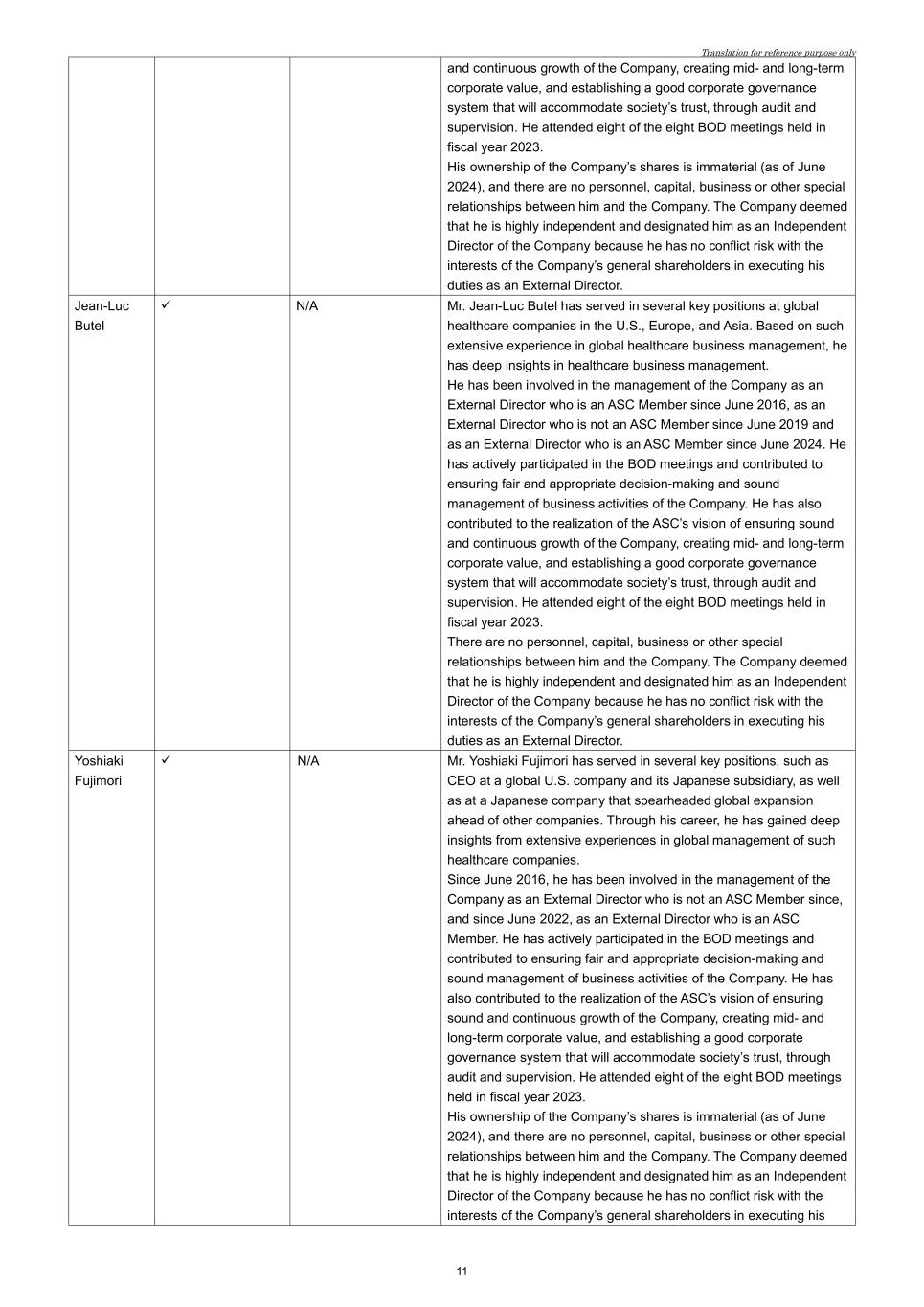 Translation for reference purpose only 11 and continuous growth of the Company, creating mid- and long-term corporate value, and establishing a good corporate governance system that will accommodate society’s trust, through audit and supervision. He attended eight of the eight BOD meetings held in fiscal year 2023. His ownership of the Company’s shares is immaterial (as of June 2024), and there are no personnel, capital, business or other special relationships between him and the Company. The Company deemed that he is highly independent and designated him as an Independent Director of the Company because he has no conflict risk with the interests of the Company’s general shareholders in executing his duties as an External Director. Jean-Luc Butel  N/A Mr. Jean-Luc Butel has served in several key positions at global healthcare companies in the U.S., Europe, and Asia. Based on such extensive experience in global healthcare business management, he has deep insights in healthcare business management. He has been involved in the management of the Company as an External Director who is an ASC Member since June 2016, as an External Director who is not an ASC Member since June 2019 and as an External Director who is an ASC Member since June 2024. He has actively participated in the BOD meetings and contributed to ensuring fair and appropriate decision-making and sound management of business activities of the Company. He has also contributed to the realization of the ASC’s vision of ensuring sound and continuous growth of the Company, creating mid- and long-term corporate value, and establishing a good corporate governance system that will accommodate society’s trust, through audit and supervision. He attended eight of the eight BOD meetings held in fiscal year 2023. There are no personnel, capital, business or other special relationships between him and the Company. The Company deemed that he is highly independent and designated him as an Independent Director of the Company because he has no conflict risk with the interests of the Company’s general shareholders in executing his duties as an External Director. Yoshiaki Fujimori  N/A Mr. Yoshiaki Fujimori has served in several key positions, such as CEO at a global U.S. company and its Japanese subsidiary, as well as at a Japanese company that spearheaded global expansion ahead of other companies. Through his career, he has gained deep insights from extensive experiences in global management of such healthcare companies. Since June 2016, he has been involved in the management of the Company as an External Director who is not an ASC Member since, and since June 2022, as an External Director who is an ASC Member. He has actively participated in the BOD meetings and contributed to ensuring fair and appropriate decision-making and sound management of business activities of the Company. He has also contributed to the realization of the ASC’s vision of ensuring sound and continuous growth of the Company, creating mid- and long-term corporate value, and establishing a good corporate governance system that will accommodate society’s trust, through audit and supervision. He attended eight of the eight BOD meetings held in fiscal year 2023. His ownership of the Company’s shares is immaterial (as of June 2024), and there are no personnel, capital, business or other special relationships between him and the Company. The Company deemed that he is highly independent and designated him as an Independent Director of the Company because he has no conflict risk with the interests of the Company’s general shareholders in executing his