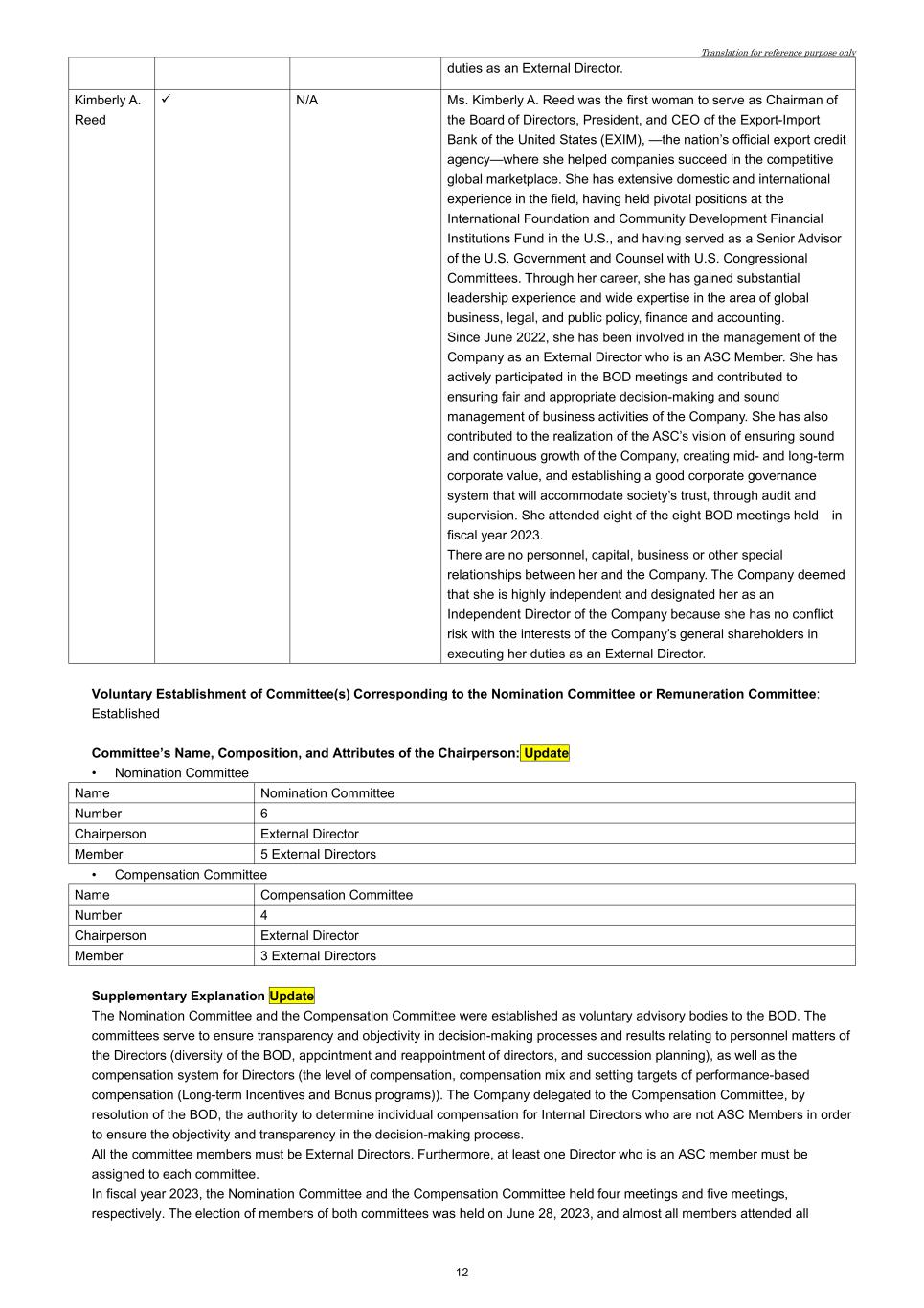 Translation for reference purpose only 12 duties as an External Director. Kimberly A. Reed  N/A Ms. Kimberly A. Reed was the first woman to serve as Chairman of the Board of Directors, President, and CEO of the Export-Import Bank of the United States (EXIM), —the nation’s official export credit agency—where she helped companies succeed in the competitive global marketplace. She has extensive domestic and international experience in the field, having held pivotal positions at the International Foundation and Community Development Financial Institutions Fund in the U.S., and having served as a Senior Advisor of the U.S. Government and Counsel with U.S. Congressional Committees. Through her career, she has gained substantial leadership experience and wide expertise in the area of global business, legal, and public policy, finance and accounting. Since June 2022, she has been involved in the management of the Company as an External Director who is an ASC Member. She has actively participated in the BOD meetings and contributed to ensuring fair and appropriate decision-making and sound management of business activities of the Company. She has also contributed to the realization of the ASC’s vision of ensuring sound and continuous growth of the Company, creating mid- and long-term corporate value, and establishing a good corporate governance system that will accommodate society’s trust, through audit and supervision. She attended eight of the eight BOD meetings held in fiscal year 2023. There are no personnel, capital, business or other special relationships between her and the Company. The Company deemed that she is highly independent and designated her as an Independent Director of the Company because she has no conflict risk with the interests of the Company’s general shareholders in executing her duties as an External Director. Voluntary Establishment of Committee(s) Corresponding to the Nomination Committee or Remuneration Committee: Established Committee’s Name, Composition, and Attributes of the Chairperson: Update • Nomination Committee Name Nomination Committee Number 6 Chairperson External Director Member 5 External Directors • Compensation Committee Name Compensation Committee Number 4 Chairperson External Director Member 3 External Directors Supplementary Explanation Update The Nomination Committee and the Compensation Committee were established as voluntary advisory bodies to the BOD. The committees serve to ensure transparency and objectivity in decision-making processes and results relating to personnel matters of the Directors (diversity of the BOD, appointment and reappointment of directors, and succession planning), as well as the compensation system for Directors (the level of compensation, compensation mix and setting targets of performance-based compensation (Long-term Incentives and Bonus programs)). The Company delegated to the Compensation Committee, by resolution of the BOD, the authority to determine individual compensation for Internal Directors who are not ASC Members in order to ensure the objectivity and transparency in the decision-making process. All the committee members must be External Directors. Furthermore, at least one Director who is an ASC member must be assigned to each committee. In fiscal year 2023, the Nomination Committee and the Compensation Committee held four meetings and five meetings, respectively. The election of members of both committees was held on June 28, 2023, and almost all members attended all