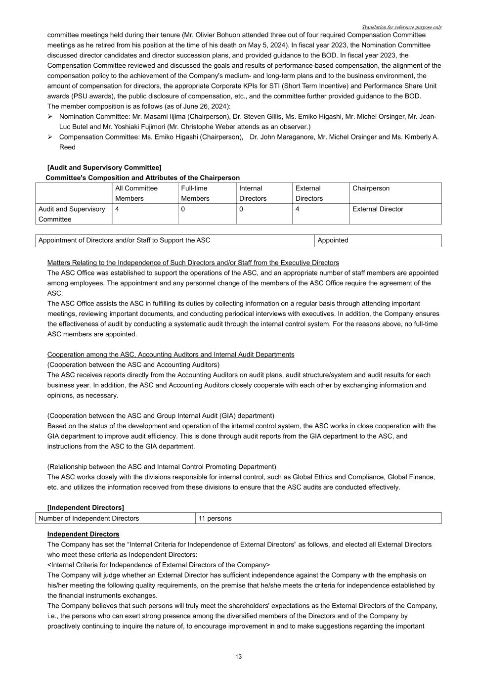 Translation for reference purpose only 13 committee meetings held during their tenure (Mr. Olivier Bohuon attended three out of four required Compensation Committee meetings as he retired from his position at the time of his death on May 5, 2024). In fiscal year 2023, the Nomination Committee discussed director candidates and director succession plans, and provided guidance to the BOD. In fiscal year 2023, the Compensation Committee reviewed and discussed the goals and results of performance-based compensation, the alignment of the compensation policy to the achievement of the Company's medium- and long-term plans and to the business environment, the amount of compensation for directors, the appropriate Corporate KPIs for STI (Short Term Incentive) and Performance Share Unit awards (PSU awards), the public disclosure of compensation, etc., and the committee further provided guidance to the BOD. The member composition is as follows (as of June 26, 2024):  Nomination Committee: Mr. Masami Iijima (Chairperson), Dr. Steven Gillis, Ms. Emiko Higashi, Mr. Michel Orsinger, Mr. Jean- Luc Butel and Mr. Yoshiaki Fujimori (Mr. Christophe Weber attends as an observer.)  Compensation Committee: Ms. Emiko Higashi (Chairperson), Dr. John Maraganore, Mr. Michel Orsinger and Ms. Kimberly A. Reed [Audit and Supervisory Committee] Committee's Composition and Attributes of the Chairperson All Committee Members Full-time Members Internal Directors External Directors Chairperson Audit and Supervisory Committee 4 0 0 4 External Director Appointment of Directors and/or Staff to Support the ASC Appointed Matters Relating to the Independence of Such Directors and/or Staff from the Executive Directors The ASC Office was established to support the operations of the ASC, and an appropriate number of staff members are appointed among employees. The appointment and any personnel change of the members of the ASC Office require the agreement of the ASC. The ASC Office assists the ASC in fulfilling its duties by collecting information on a regular basis through attending important meetings, reviewing important documents, and conducting periodical interviews with executives. In addition, the Company ensures the effectiveness of audit by conducting a systematic audit through the internal control system. For the reasons above, no full-time ASC members are appointed. Cooperation among the ASC, Accounting Auditors and Internal Audit Departments (Cooperation between the ASC and Accounting Auditors) The ASC receives reports directly from the Accounting Auditors on audit plans, audit structure/system and audit results for each business year. In addition, the ASC and Accounting Auditors closely cooperate with each other by exchanging information and opinions, as necessary. (Cooperation between the ASC and Group Internal Audit (GIA) department) Based on the status of the development and operation of the internal control system, the ASC works in close cooperation with the GIA department to improve audit efficiency. This is done through audit reports from the GIA department to the ASC, and instructions from the ASC to the GIA department. (Relationship between the ASC and Internal Control Promoting Department) The ASC works closely with the divisions responsible for internal control, such as Global Ethics and Compliance, Global Finance, etc. and utilizes the information received from these divisions to ensure that the ASC audits are conducted effectively. [Independent Directors] Number of Independent Directors 11 persons Independent Directors The Company has set the “Internal Criteria for Independence of External Directors” as follows, and elected all External Directors who meet these criteria as Independent Directors: <Internal Criteria for Independence of External Directors of the Company> The Company will judge whether an External Director has sufficient independence against the Company with the emphasis on his/her meeting the following quality requirements, on the premise that he/she meets the criteria for independence established by the financial instruments exchanges. The Company believes that such persons will truly meet the shareholders' expectations as the External Directors of the Company, i.e., the persons who can exert strong presence among the diversified members of the Directors and of the Company by proactively continuing to inquire the nature of, to encourage improvement in and to make suggestions regarding the important