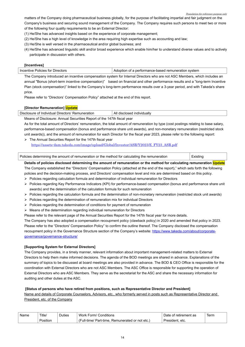 Translation for reference purpose only 14 matters of the Company doing pharmaceutical business globally, for the purpose of facilitating impartial and fair judgment on the Company's business and securing sound management of the Company. The Company requires such persons to meet two or more of the following four quality requirements to be an External Director: (1) He/She has advanced insights based on the experience of corporate management; (2) He/She has a high level of knowledge in the area requiring high expertise such as accounting and law; (3) He/She is well versed in the pharmaceutical and/or global business; and (4) He/She has advanced linguistic skill and/or broad experience which enable him/her to understand diverse values and to actively participate in discussion with others. [Incentives] Incentive Policies for Directors Adoption of a performance-based remuneration system The Company introduced an incentive compensation system for Internal Directors who are not ASC Members, which includes an annual "Bonus (short-term incentive compensation)” based on financial and other performance results and a ”long-term Incentive Plan (stock compensation)” linked to the Company’s long-term performance results over a 3-year period, and with Takeda's share price. Please refer to “Directors’ Compensation Policy” attached at the end of this report. [Director Remuneration] Update Disclosure of Individual Directors’ Remuneration All disclosed individually Means of Disclosure: Annual Securities Report of the 147th fiscal year As for the total amount of Directors’ remuneration, the total amount of remuneration by type (cost postings relating to base salary, performance-based compensation (bonus and performance share unit awards), and non-monetary remuneration (restricted stock unit awards)), and the amount of remuneration for each Director for the fiscal year 2023, please refer to the following report:  The Annual Securities Report for the 147th fiscal year https://assets-dam.takeda.com/image/upload/Global/Investor/ASR/Y2023/E_FY23_ASR.pdf Policies determining the amount of remuneration or the method for calculating the remuneration Existing Details of policies disclosed determining the amount of remuneration or the method for calculating remuneration Update The Company established the “Directors’ Compensation Policy (attached at the end of the report),” which sets forth the following policies and the decision-making process, and Directors' compensation level and mix are determined based on this policy.  Policies regarding calculation formula and determination of individual remuneration for Directors  Policies regarding Key Performance Indicators (KPI) for performance-based compensation (bonus and performance share unit awards) and the determination of the calculation formula for such remuneration  Policies regarding the calculation formula and the determination of non-monetary remuneration (restricted stock unit awards)  Policies regarding the determination of remuneration mix for individual Directors  Policies regarding the determination of conditions for payment of remuneration  Means of the determination regarding individual remuneration for Directors Please refer to the relevant page of the Annual Securities Report for the 147th fiscal year for more details. The Company has also adopted a compensation recoupment policy (clawback policy) in 2020 and amended that policy in 2023. Please refer to the “Directors' Compensation Policy” to confirm the outline thereof. The Company disclosed the compensation recoupment policy in the Governance Structure section of the Company’s website: https://www.takeda.com/about/corporate- governance/governance-structure/ [Supporting System for External Directors] The Company provides, in a timely manner, relevant information about important management-related matters to External Directors to help them make informed decisions. The agenda of the BOD meetings are shared in advance. Explanations of the summary of topics to be discussed at board meetings are also provided in advance. The BOD & CEO Office is responsible for the coordination with External Directors who are not ASC Members. The ASC Office is responsible for supporting the operation of External Directors who are ASC Members. They serve as the secretariat for the ASC and share the necessary information for auditing and other duties at the ASC. [Status of persons who have retired from positions, such as Representative Director and President] Name and details of Corporate Counselors, Advisors, etc., who formerly served in posts such as Representative Director and President, etc. of the Company Name Title/ Position Duties Work Form/ Conditions (Full-time/ Part-time, Remunerated or not etc.) Date of retirement as President, etc. Term