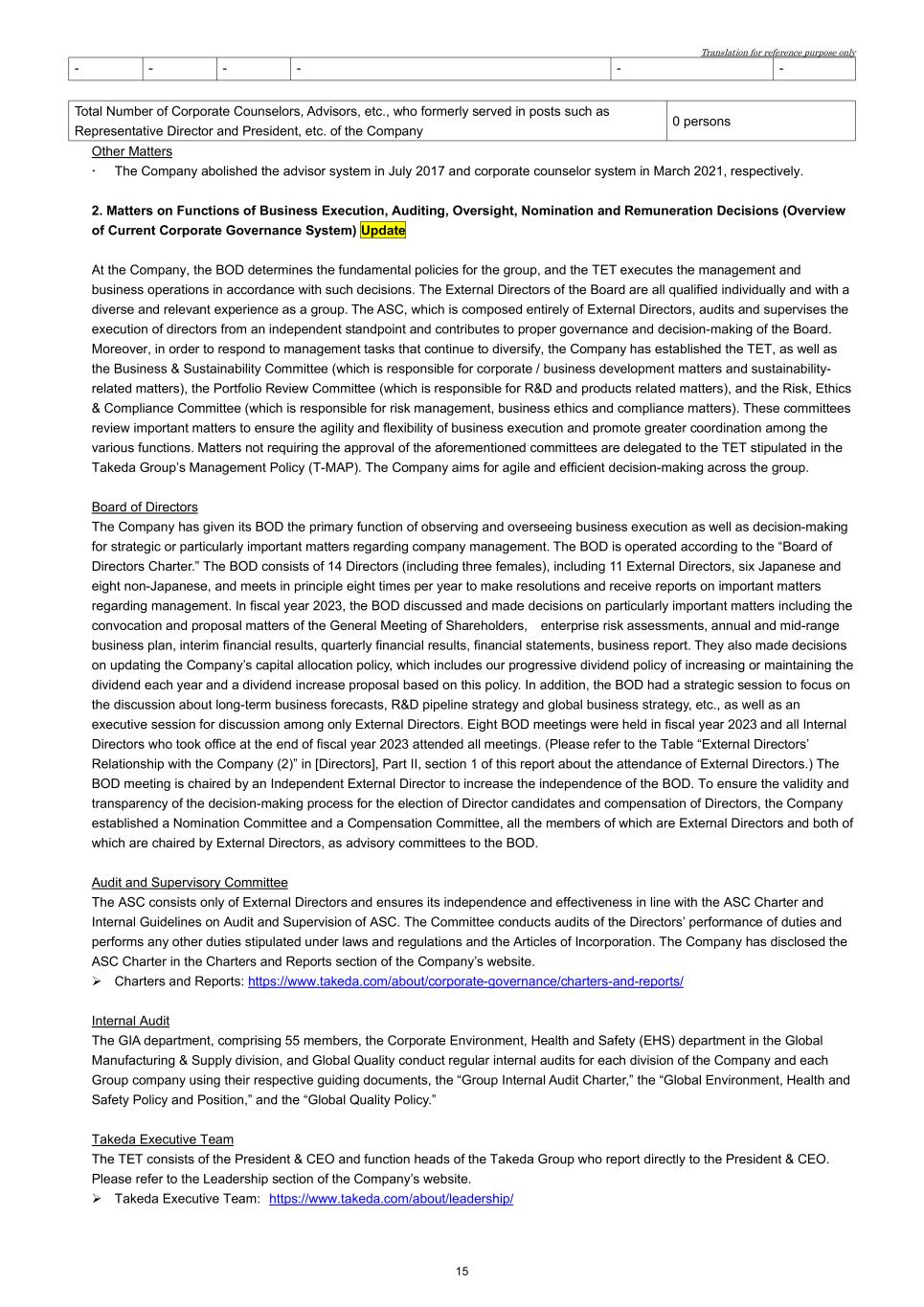 Translation for reference purpose only 15 - - - - - - Total Number of Corporate Counselors, Advisors, etc., who formerly served in posts such as Representative Director and President, etc. of the Company 0 persons Other Matters  The Company abolished the advisor system in July 2017 and corporate counselor system in March 2021, respectively. 2. Matters on Functions of Business Execution, Auditing, Oversight, Nomination and Remuneration Decisions (Overview of Current Corporate Governance System) Update At the Company, the BOD determines the fundamental policies for the group, and the TET executes the management and business operations in accordance with such decisions. The External Directors of the Board are all qualified individually and with a diverse and relevant experience as a group. The ASC, which is composed entirely of External Directors, audits and supervises the execution of directors from an independent standpoint and contributes to proper governance and decision-making of the Board. Moreover, in order to respond to management tasks that continue to diversify, the Company has established the TET, as well as the Business & Sustainability Committee (which is responsible for corporate / business development matters and sustainability- related matters), the Portfolio Review Committee (which is responsible for R&D and products related matters), and the Risk, Ethics & Compliance Committee (which is responsible for risk management, business ethics and compliance matters). These committees review important matters to ensure the agility and flexibility of business execution and promote greater coordination among the various functions. Matters not requiring the approval of the aforementioned committees are delegated to the TET stipulated in the Takeda Group’s Management Policy (T-MAP). The Company aims for agile and efficient decision-making across the group. Board of Directors The Company has given its BOD the primary function of observing and overseeing business execution as well as decision-making for strategic or particularly important matters regarding company management. The BOD is operated according to the “Board of Directors Charter.” The BOD consists of 14 Directors (including three females), including 11 External Directors, six Japanese and eight non-Japanese, and meets in principle eight times per year to make resolutions and receive reports on important matters regarding management. In fiscal year 2023, the BOD discussed and made decisions on particularly important matters including the convocation and proposal matters of the General Meeting of Shareholders, enterprise risk assessments, annual and mid-range business plan, interim financial results, quarterly financial results, financial statements, business report. They also made decisions on updating the Company’s capital allocation policy, which includes our progressive dividend policy of increasing or maintaining the dividend each year and a dividend increase proposal based on this policy. In addition, the BOD had a strategic session to focus on the discussion about long-term business forecasts, R&D pipeline strategy and global business strategy, etc., as well as an executive session for discussion among only External Directors. Eight BOD meetings were held in fiscal year 2023 and all Internal Directors who took office at the end of fiscal year 2023 attended all meetings. (Please refer to the Table “External Directors’ Relationship with the Company (2)” in [Directors], Part II, section 1 of this report about the attendance of External Directors.) The BOD meeting is chaired by an Independent External Director to increase the independence of the BOD. To ensure the validity and transparency of the decision-making process for the election of Director candidates and compensation of Directors, the Company established a Nomination Committee and a Compensation Committee, all the members of which are External Directors and both of which are chaired by External Directors, as advisory committees to the BOD. Audit and Supervisory Committee The ASC consists only of External Directors and ensures its independence and effectiveness in line with the ASC Charter and Internal Guidelines on Audit and Supervision of ASC. The Committee conducts audits of the Directors’ performance of duties and performs any other duties stipulated under laws and regulations and the Articles of Incorporation. The Company has disclosed the ASC Charter in the Charters and Reports section of the Company’s website.  Charters and Reports: https://www.takeda.com/about/corporate-governance/charters-and-reports/ Internal Audit The GIA department, comprising 55 members, the Corporate Environment, Health and Safety (EHS) department in the Global Manufacturing & Supply division, and Global Quality conduct regular internal audits for each division of the Company and each Group company using their respective guiding documents, the “Group Internal Audit Charter,” the “Global Environment, Health and Safety Policy and Position,” and the “Global Quality Policy.” Takeda Executive Team The TET consists of the President & CEO and function heads of the Takeda Group who report directly to the President & CEO. Please refer to the Leadership section of the Company’s website.  Takeda Executive Team: https://www.takeda.com/about/leadership/
