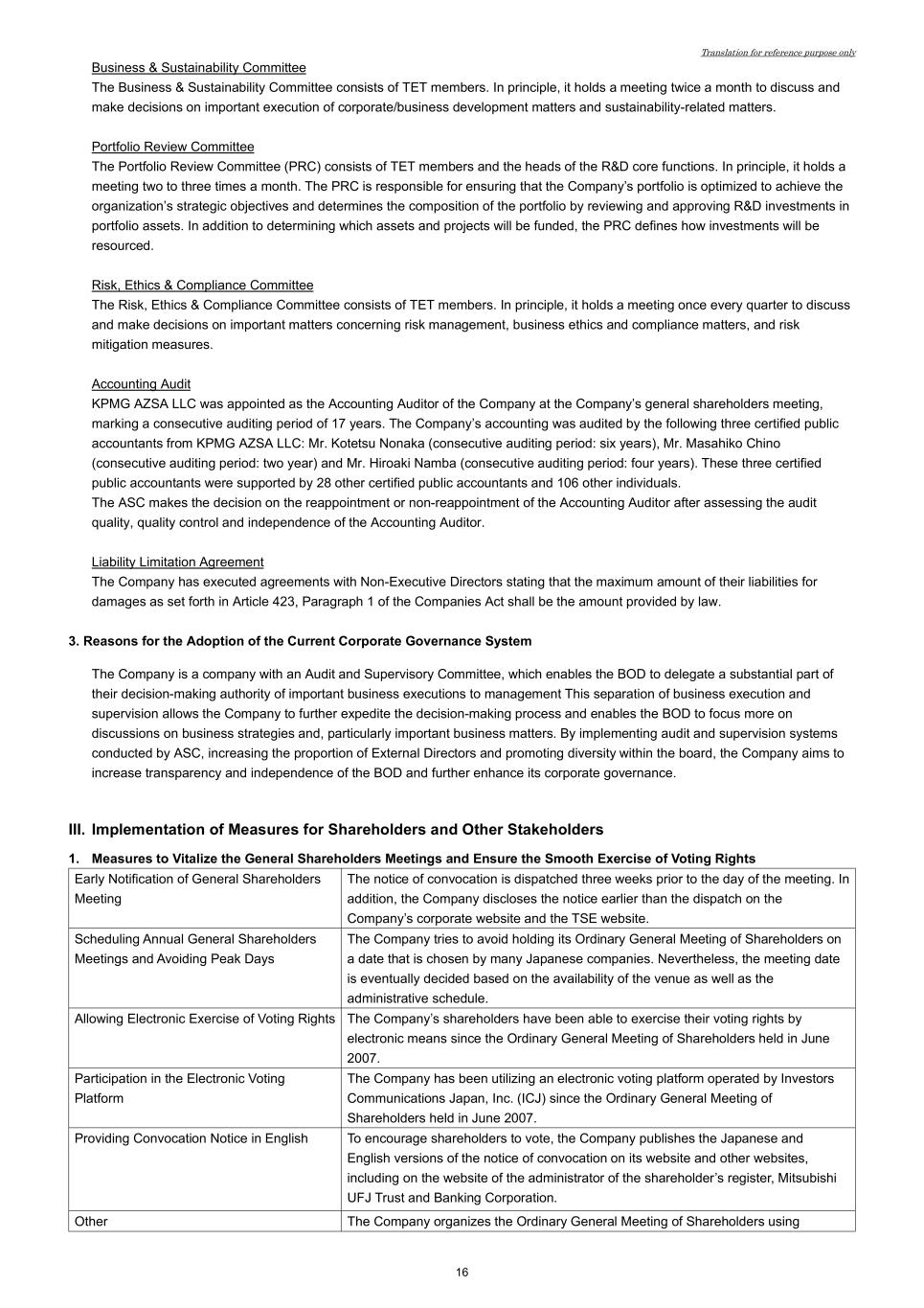 Translation for reference purpose only 16 Business & Sustainability Committee The Business & Sustainability Committee consists of TET members. In principle, it holds a meeting twice a month to discuss and make decisions on important execution of corporate/business development matters and sustainability-related matters. Portfolio Review Committee The Portfolio Review Committee (PRC) consists of TET members and the heads of the R&D core functions. In principle, it holds a meeting two to three times a month. The PRC is responsible for ensuring that the Company’s portfolio is optimized to achieve the organization’s strategic objectives and determines the composition of the portfolio by reviewing and approving R&D investments in portfolio assets. In addition to determining which assets and projects will be funded, the PRC defines how investments will be resourced. Risk, Ethics & Compliance Committee The Risk, Ethics & Compliance Committee consists of TET members. In principle, it holds a meeting once every quarter to discuss and make decisions on important matters concerning risk management, business ethics and compliance matters, and risk mitigation measures. Accounting Audit KPMG AZSA LLC was appointed as the Accounting Auditor of the Company at the Company’s general shareholders meeting, marking a consecutive auditing period of 17 years. The Company’s accounting was audited by the following three certified public accountants from KPMG AZSA LLC: Mr. Kotetsu Nonaka (consecutive auditing period: six years), Mr. Masahiko Chino (consecutive auditing period: two year) and Mr. Hiroaki Namba (consecutive auditing period: four years). These three certified public accountants were supported by 28 other certified public accountants and 106 other individuals. The ASC makes the decision on the reappointment or non-reappointment of the Accounting Auditor after assessing the audit quality, quality control and independence of the Accounting Auditor. Liability Limitation Agreement The Company has executed agreements with Non-Executive Directors stating that the maximum amount of their liabilities for damages as set forth in Article 423, Paragraph 1 of the Companies Act shall be the amount provided by law. 3. Reasons for the Adoption of the Current Corporate Governance System The Company is a company with an Audit and Supervisory Committee, which enables the BOD to delegate a substantial part of their decision-making authority of important business executions to management This separation of business execution and supervision allows the Company to further expedite the decision-making process and enables the BOD to focus more on discussions on business strategies and, particularly important business matters. By implementing audit and supervision systems conducted by ASC, increasing the proportion of External Directors and promoting diversity within the board, the Company aims to increase transparency and independence of the BOD and further enhance its corporate governance. III. Implementation of Measures for Shareholders and Other Stakeholders 1. Measures to Vitalize the General Shareholders Meetings and Ensure the Smooth Exercise of Voting Rights Early Notification of General Shareholders Meeting The notice of convocation is dispatched three weeks prior to the day of the meeting. In addition, the Company discloses the notice earlier than the dispatch on the Company’s corporate website and the TSE website. Scheduling Annual General Shareholders Meetings and Avoiding Peak Days The Company tries to avoid holding its Ordinary General Meeting of Shareholders on a date that is chosen by many Japanese companies. Nevertheless, the meeting date is eventually decided based on the availability of the venue as well as the administrative schedule. Allowing Electronic Exercise of Voting Rights The Company’s shareholders have been able to exercise their voting rights by electronic means since the Ordinary General Meeting of Shareholders held in June 2007. Participation in the Electronic Voting Platform The Company has been utilizing an electronic voting platform operated by Investors Communications Japan, Inc. (ICJ) since the Ordinary General Meeting of Shareholders held in June 2007. Providing Convocation Notice in English To encourage shareholders to vote, the Company publishes the Japanese and English versions of the notice of convocation on its website and other websites, including on the website of the administrator of the shareholder’s register, Mitsubishi UFJ Trust and Banking Corporation. Other The Company organizes the Ordinary General Meeting of Shareholders using