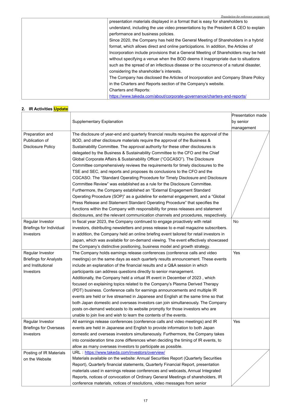 Translation for reference purpose only 17 presentation materials displayed in a format that is easy for shareholders to understand, including the use video presentations by the President & CEO to explain performance and business policies. Since 2020, the Company has held the General Meeting of Shareholders in a hybrid format, which allows direct and online participations. In addition, the Articles of Incorporation include provisions that a General Meeting of Shareholders may be held without specifying a venue when the BOD deems it inappropriate due to situations such as the spread of an infectious disease or the occurrence of a natural disaster, considering the shareholder’s interests. The Company has disclosed the Articles of Incorporation and Company Share Policy in the Charters and Reports section of the Company’s website. Charters and Reports: https://www.takeda.com/about/corporate-governance/charters-and-reports/ 2. IR Activities Update Supplementary Explanation Presentation made by senior management Preparation and Publication of Disclosure Policy The disclosure of year-end and quarterly financial results requires the approval of the BOD, and other disclosure materials require the approval of the Business & Sustainability Committee. The approval authority for these other disclosures is delegated by the Business & Sustainability Committee to the CFO and the Chief Global Corporate Affairs & Sustainability Officer (“CGCASO”). The Disclosure Committee comprehensively reviews the requirements for timely disclosures to the TSE and SEC, and reports and proposes its conclusions to the CFO and the CGCASO. The “Standard Operating Procedure for Timely Disclosure and Disclosure Committee Review” was established as a rule for the Disclosure Committee. Furthermore, the Company established an “External Engagement Standard Operating Procedure (SOP)” as a guideline for external engagement, and a “Global Press Release and Statement Standard Operating Procedure” that specifies the functions within the Company with responsibility for press releases and statement disclosures, and the relevant communication channels and procedures, respectively. Regular Investor Briefings for Individual Investors In fiscal year 2023, the Company continued to engage proactively with retail investors, distributing newsletters and press release to e-mail magazine subscribers. In addition, the Company held an online briefing event tailored for retail investors in Japan, which was available for on-demand viewing. The event effectively showcased the Company’s distinctive positioning, business model and growth strategy. No Regular Investor Briefings for Analysts and Institutional Investors The Company holds earnings release conferences (conference calls and video meetings) on the same days as each quarterly results announcement. These events include an explanation of the financial results and a Q&A session in which participants can address questions directly to senior management. Additionally, the Company held a virtual IR event in December of 2023 , which focused on explaining topics related to the Company’s Plasma Derived Therapy (PDT) business. Conference calls for earnings announcements and multiple IR events are held or live streamed in Japanese and English at the same time so that both Japan domestic and overseas investors can join simultaneously. The Company posts on-demand webcasts to its website promptly for those investors who are unable to join live and wish to learn the contents of the events. Yes Regular Investor Briefings for Overseas Investors All earnings release conferences (conference calls and video meetings) and IR events are held in Japanese and English to provide information to both Japan domestic and overseas investors simultaneously. Furthermore, the Company takes into consideration time zone differences when deciding the timing of IR events, to allow as many overseas investors to participate as possible. Yes Posting of IR Materials on the Website URL:https://www.takeda.com/investors/overview/ 1TU1T Materials available on the website: Annual Securities Report (Quarterly Securities Report), Quarterly financial statements, Quarterly Financial Report, presentation materials used in earnings release conferences and webcasts, Annual Integrated Reports, notices of convocation of Ordinary General Meetings of shareholders, IR conference materials, notices of resolutions, video messages from senior