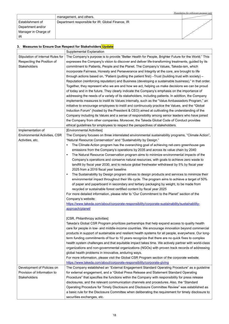 Translation for reference purpose only 18 management, and others. Establishment of Department and/or Manager in Charge of IR Department responsible for IR: Global Finance, IR 3. Measures to Ensure Due Respect for Stakeholders Update Supplemental Explanation Stipulation of Internal Rules for Respecting the Position of Stakeholders The Company’s purpose is to provide “Better Health for People, Brighter Future for the World.” This expresses the Company’s vision to discover and deliver life-transforming treatments, guided by its commitment to Patients, People and the Planet. The Company’s Values, Takeda-ism, which incorporate Fairness, Honesty and Perseverance and Integrity at the core, are brought to life through actions based on, “Patient (putting the patient first) –Trust (building trust with society) – Reputation (reinforcing reputation) and Business (developing a sustainable business),” in that order. Together, they represent who we are and how we act, helping us make decisions we can be proud of today and in the future. They clearly indicate the Company’s emphasis on the importance of addressing the needs of a variety of its stakeholders, including patients. In addition, the Company implements measures to instill its Values internally, such as the “Value Ambassadors Program,” an initiative to encourage employees to instill and continuously practice the Values, and the “Global Induction Forum” (hosted by the President & CEO) aimed at cultivating the understanding of the Company including its Values and a sense of responsibility among senior leaders who have joined the Company from other companies. Moreover, the Takeda Global Code of Conduct provides ethical guidelines for employees to respect the perspectives of stakeholders. Implementation of Environmental Activities, CSR Activities, etc. [Environmental Activities] The Company focuses on three interrelated environmental sustainability programs, “Climate Action”, “Natural Resource Conservation” and “Sustainability by Design.”  The Climate Action program has the overarching goal of achieving net-zero greenhouse gas emissions from the Company’s operations by 2035 and across its value chain by 2040  The Natural Resource Conservation program aims to minimize environmental impacts of the Company’s operations and conserve natural resources, with goals to achieve zero waste to landfill by fiscal year 2030, and to reduce global freshwater withdrawal by 5% by fiscal year 2025 from a 2019 fiscal year baseline  The Sustainability by Design program strives to design products and services to minimize their environmental impact throughout their life cycle. The program aims to achieve a target of 50% of paper and paperboard in secondary and tertiary packaging by weight, to be made from recycled or sustainable forest certified content by fiscal year 2025 For more detailed information, please refer to “Our Commitment to the Planet” section of the Company’s website: https://www.takeda.com/about/corporate-responsibility/corporate-sustainability/sustainability- approach/planet/ [CSR, Philanthropy activities] Takeda’s Global CSR Program prioritizes partnerships that help expand access to quality health care for people in low- and middle-income countries. We encourage innovation beyond commercial products in support of sustainable and resilient health systems for all people, everywhere. Our long- term funding commitments of four to 10 years recognize that there are no quick fixes to complex health system challenges and that equitable impact takes time. We actively partner with world-class organizations and non-governmental organizations (NGOs) with proven track records of addressing global health problems in innovative, enduring ways. For more information, please visit the Global CSR Program section of the corporate website. https://www.takeda.com/about/corporate-responsibility/corporate-giving Development of Policies on Provision of Information to Stakeholders The Company established an “External Engagement Standard Operating Procedure” as a guideline for external engagement, and a “Global Press Release and Statement Standard Operating Procedure” that specifies the functions within the Company with responsibility for press release disclosures, and the relevant communication channels and procedures. Also, the “Standard Operating Procedure for Timely Disclosure and Disclosure Committee Review” was established as a basic rule for the Disclosure Committee when deliberating the requirement for timely disclosure to securities exchanges, etc.