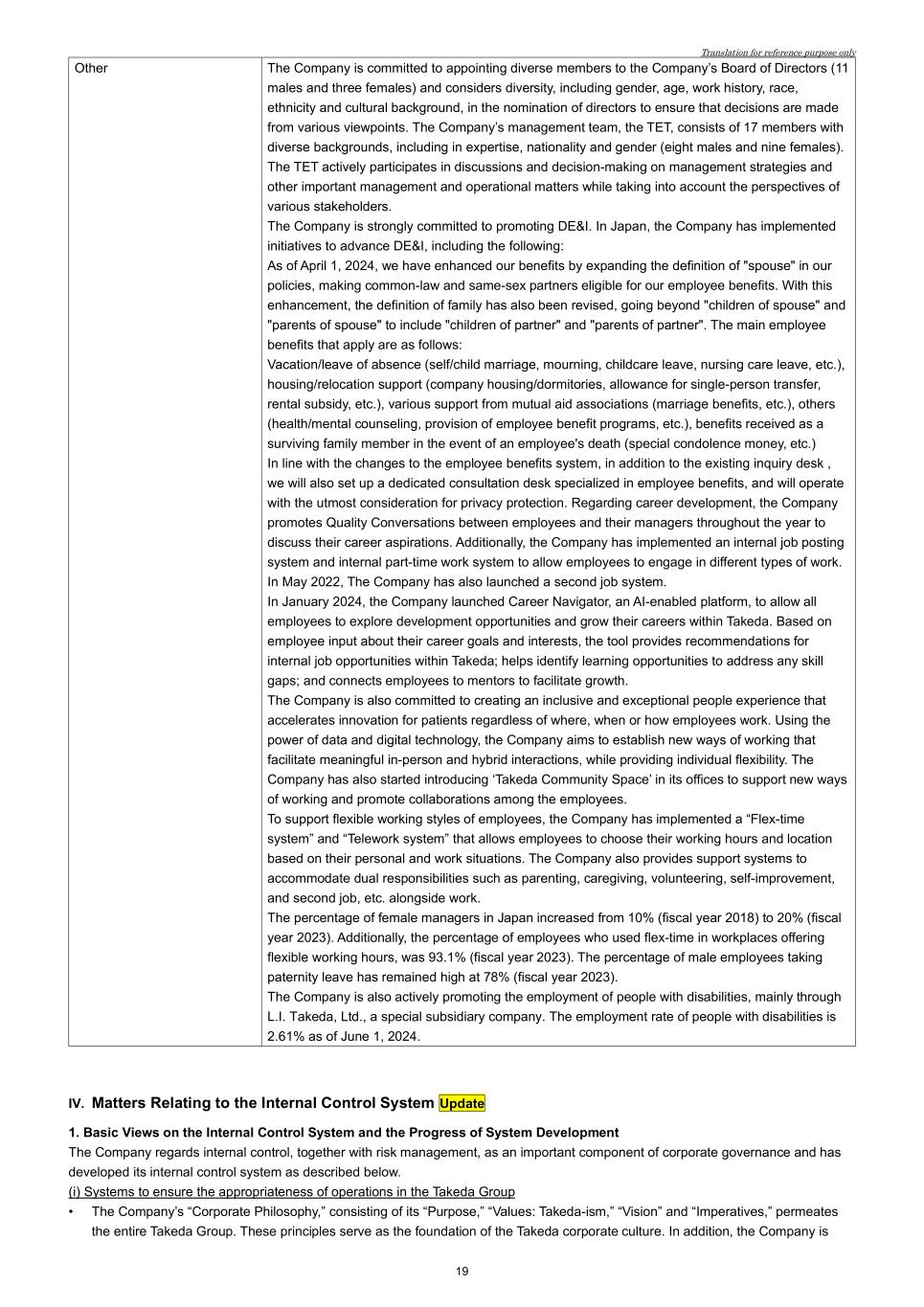 Translation for reference purpose only 19 Other The Company is committed to appointing diverse members to the Company’s Board of Directors (11 males and three females) and considers diversity, including gender, age, work history, race, ethnicity and cultural background, in the nomination of directors to ensure that decisions are made from various viewpoints. The Company’s management team, the TET, consists of 17 members with diverse backgrounds, including in expertise, nationality and gender (eight males and nine females). The TET actively participates in discussions and decision-making on management strategies and other important management and operational matters while taking into account the perspectives of various stakeholders. The Company is strongly committed to promoting DE&I. In Japan, the Company has implemented initiatives to advance DE&I, including the following: As of April 1, 2024, we have enhanced our benefits by expanding the definition of "spouse" in our policies, making common-law and same-sex partners eligible for our employee benefits. With this enhancement, the definition of family has also been revised, going beyond "children of spouse" and "parents of spouse" to include "children of partner" and "parents of partner". The main employee benefits that apply are as follows: Vacation/leave of absence (self/child marriage, mourning, childcare leave, nursing care leave, etc.), housing/relocation support (company housing/dormitories, allowance for single-person transfer, rental subsidy, etc.), various support from mutual aid associations (marriage benefits, etc.), others (health/mental counseling, provision of employee benefit programs, etc.), benefits received as a surviving family member in the event of an employee's death (special condolence money, etc.) In line with the changes to the employee benefits system, in addition to the existing inquiry desk , we will also set up a dedicated consultation desk specialized in employee benefits, and will operate with the utmost consideration for privacy protection. Regarding career development, the Company promotes Quality Conversations between employees and their managers throughout the year to discuss their career aspirations. Additionally, the Company has implemented an internal job posting system and internal part-time work system to allow employees to engage in different types of work. In May 2022, The Company has also launched a second job system. In January 2024, the Company launched Career Navigator, an AI-enabled platform, to allow all employees to explore development opportunities and grow their careers within Takeda. Based on employee input about their career goals and interests, the tool provides recommendations for internal job opportunities within Takeda; helps identify learning opportunities to address any skill gaps; and connects employees to mentors to facilitate growth. The Company is also committed to creating an inclusive and exceptional people experience that accelerates innovation for patients regardless of where, when or how employees work. Using the power of data and digital technology, the Company aims to establish new ways of working that facilitate meaningful in-person and hybrid interactions, while providing individual flexibility. The Company has also started introducing ‘Takeda Community Space’ in its offices to support new ways of working and promote collaborations among the employees. To support flexible working styles of employees, the Company has implemented a “Flex-time system” and “Telework system” that allows employees to choose their working hours and location based on their personal and work situations. The Company also provides support systems to accommodate dual responsibilities such as parenting, caregiving, volunteering, self-improvement, and second job, etc. alongside work. The percentage of female managers in Japan increased from 10% (fiscal year 2018) to 20% (fiscal year 2023). Additionally, the percentage of employees who used flex-time in workplaces offering flexible working hours, was 93.1% (fiscal year 2023). The percentage of male employees taking paternity leave has remained high at 78% (fiscal year 2023). The Company is also actively promoting the employment of people with disabilities, mainly through L.I. Takeda, Ltd., a special subsidiary company. The employment rate of people with disabilities is 2.61% as of June 1, 2024. IV. Matters Relating to the Internal Control System Update 1. Basic Views on the Internal Control System and the Progress of System Development The Company regards internal control, together with risk management, as an important component of corporate governance and has developed its internal control system as described below. (i) Systems to ensure the appropriateness of operations in the Takeda Group • The Company’s “Corporate Philosophy,” consisting of its “Purpose,” “Values: Takeda-ism,” “Vision” and “Imperatives,” permeates the entire Takeda Group. These principles serve as the foundation of the Takeda corporate culture. In addition, the Company is