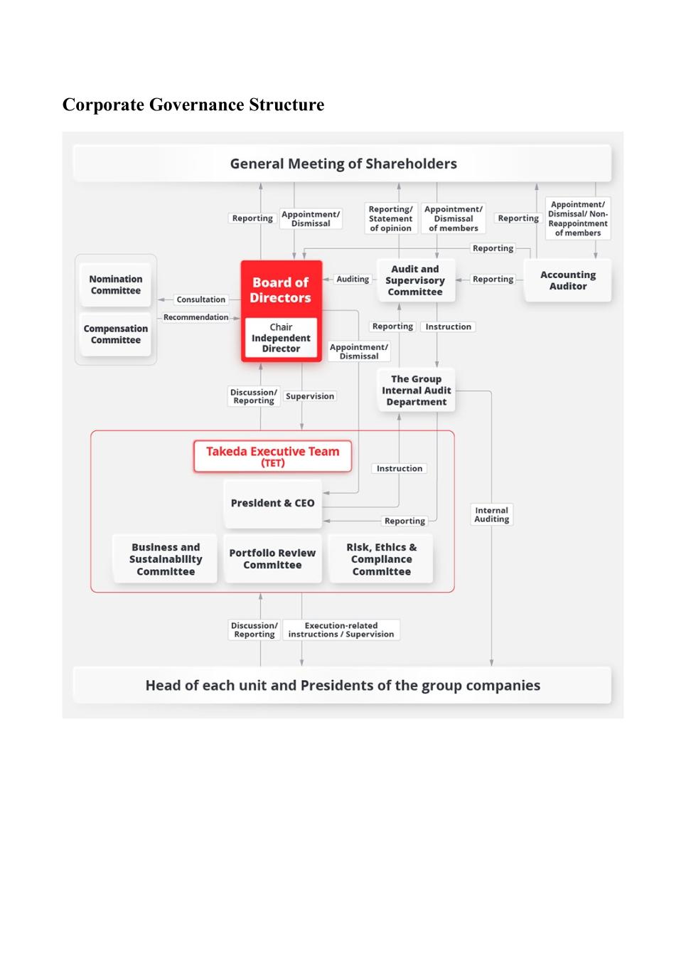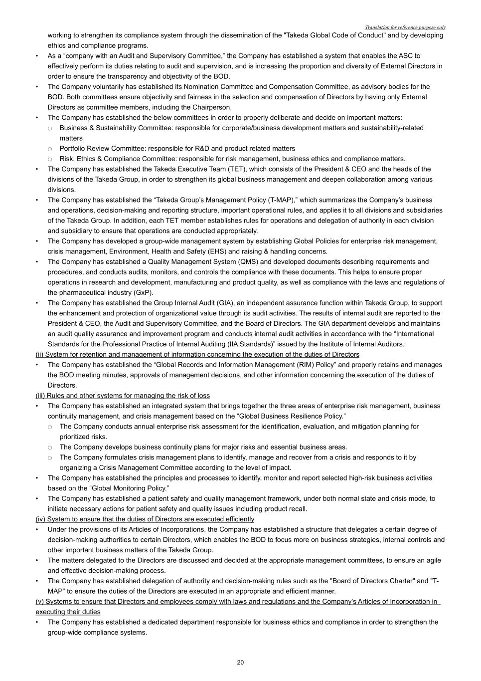 Translation for reference purpose only 20 working to strengthen its compliance system through the dissemination of the "Takeda Global Code of Conduct" and by developing ethics and compliance programs. • As a “company with an Audit and Supervisory Committee,” the Company has established a system that enables the ASC to effectively perform its duties relating to audit and supervision, and is increasing the proportion and diversity of External Directors in order to ensure the transparency and objectivity of the BOD. • The Company voluntarily has established its Nomination Committee and Compensation Committee, as advisory bodies for the BOD. Both committees ensure objectivity and fairness in the selection and compensation of Directors by having only External Directors as committee members, including the Chairperson. • The Company has established the below committees in order to properly deliberate and decide on important matters: ○ Business & Sustainability Committee: responsible for corporate/business development matters and sustainability-related matters ○ Portfolio Review Committee: responsible for R&D and product related matters ○ Risk, Ethics & Compliance Committee: responsible for risk management, business ethics and compliance matters. • The Company has established the Takeda Executive Team (TET), which consists of the President & CEO and the heads of the divisions of the Takeda Group, in order to strengthen its global business management and deepen collaboration among various divisions. • The Company has established the “Takeda Group’s Management Policy (T-MAP),” which summarizes the Company’s business and operations, decision-making and reporting structure, important operational rules, and applies it to all divisions and subsidiaries of the Takeda Group. In addition, each TET member establishes rules for operations and delegation of authority in each division and subsidiary to ensure that operations are conducted appropriately. • The Company has developed a group-wide management system by establishing Global Policies for enterprise risk management, crisis management, Environment, Health and Safety (EHS) and raising & handling concerns. • The Company has established a Quality Management System (QMS) and developed documents describing requirements and procedures, and conducts audits, monitors, and controls the compliance with these documents. This helps to ensure proper operations in research and development, manufacturing and product quality, as well as compliance with the laws and regulations of the pharmaceutical industry (GxP). • The Company has established the Group Internal Audit (GIA), an independent assurance function within Takeda Group, to support the enhancement and protection of organizational value through its audit activities. The results of internal audit are reported to the President & CEO, the Audit and Supervisory Committee, and the Board of Directors. The GIA department develops and maintains an audit quality assurance and improvement program and conducts internal audit activities in accordance with the “International Standards for the Professional Practice of Internal Auditing (IIA Standards)” issued by the Institute of Internal Auditors. (ii) System for retention and management of information concerning the execution of the duties of Directors • The Company has established the “Global Records and Information Management (RIM) Policy” and properly retains and manages the BOD meeting minutes, approvals of management decisions, and other information concerning the execution of the duties of Directors. (iii) Rules and other systems for managing the risk of loss • The Company has established an integrated system that brings together the three areas of enterprise risk management, business continuity management, and crisis management based on the “Global Business Resilience Policy.” ○ The Company conducts annual enterprise risk assessment for the identification, evaluation, and mitigation planning for prioritized risks. ○ The Company develops business continuity plans for major risks and essential business areas. ○ The Company formulates crisis management plans to identify, manage and recover from a crisis and responds to it by organizing a Crisis Management Committee according to the level of impact. • The Company has established the principles and processes to identify, monitor and report selected high-risk business activities based on the “Global Monitoring Policy.” • The Company has established a patient safety and quality management framework, under both normal state and crisis mode, to initiate necessary actions for patient safety and quality issues including product recall. (iv) System to ensure that the duties of Directors are executed efficiently • Under the provisions of its Articles of Incorporations, the Company has established a structure that delegates a certain degree of decision-making authorities to certain Directors, which enables the BOD to focus more on business strategies, internal controls and other important business matters of the Takeda Group. • The matters delegated to the Directors are discussed and decided at the appropriate management committees, to ensure an agile and effective decision-making process. • The Company has established delegation of authority and decision-making rules such as the "Board of Directors Charter" and "T- MAP" to ensure the duties of the Directors are executed in an appropriate and efficient manner. (v) Systems to ensure that Directors and employees comply with laws and regulations and the Company’s Articles of Incorporation in executing their duties • The Company has established a dedicated department responsible for business ethics and compliance in order to strengthen the group-wide compliance systems.