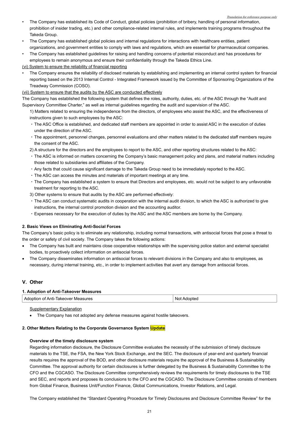 Translation for reference purpose only 21 • The Company has established its Code of Conduct, global policies (prohibition of bribery, handling of personal information, prohibition of insider trading, etc.) and other compliance-related internal rules, and implements training programs throughout the Takeda Group. • The Company has established global policies and internal regulations for interactions with healthcare entities, patient organizations, and government entities to comply with laws and regulations, which are essential for pharmaceutical companies. • The Company has established guidelines for raising and handling concerns of potential misconduct and has procedures for employees to remain anonymous and ensure their confidentiality through the Takeda Ethics Line. (vi) System to ensure the reliability of financial reporting • The Company ensures the reliability of disclosed materials by establishing and implementing an internal control system for financial reporting based on the 2013 Internal Control - Integrated Framework issued by the Committee of Sponsoring Organizations of the Treadway Commission (COSO). (vii) System to ensure that the audits by the ASC are conducted effectively The Company has established the following system that defines the roles, authority, duties, etc. of the ASC through the “Audit and Supervisory Committee Charter,” as well as internal guidelines regarding the audit and supervision of the ASC. 1) Matters related to ensuring the independence from the directors, of employees who assist the ASC, and the effectiveness of instructions given to such employees by the ASC: ・ The ASC Office is established, and dedicated staff members are appointed in order to assist ASC in the execution of duties under the direction of the ASC. ・ The appointment, personnel changes, personnel evaluations and other matters related to the dedicated staff members require the consent of the ASC. 2) A structure for the directors and the employees to report to the ASC, and other reporting structures related to the ASC: ・ The ASC is informed on matters concerning the Company’s basic management policy and plans, and material matters including those related to subsidiaries and affiliates of the Company. ・ Any facts that could cause significant damage to the Takeda Group need to be immediately reported to the ASC. ・ The ASC can access the minutes and materials of important meetings at any time. ・ The Company has established a system to ensure that Directors and employees, etc. would not be subject to any unfavorable treatment for reporting to the ASC. 3) Other systems to ensure that audits by the ASC are performed effectively: ・ The ASC can conduct systematic audits in cooperation with the internal audit division, to which the ASC is authorized to give instructions, the internal control promotion division and the accounting auditor. ・ Expenses necessary for the execution of duties by the ASC and the ASC members are borne by the Company. 2. Basic Views on Eliminating Anti-Social Forces The Company’s basic policy is to eliminate any relationship, including normal transactions, with antisocial forces that pose a threat to the order or safety of civil society. The Company takes the following actions: • The Company has built and maintains close cooperative relationships with the supervising police station and external specialist bodies, to proactively collect information on antisocial forces. • The Company disseminates information on antisocial forces to relevant divisions in the Company and also to employees, as necessary, during internal training, etc., in order to implement activities that avert any damage from antisocial forces. V. Other 1. Adoption of Anti-Takeover Measures Adoption of Anti-Takeover Measures Not Adopted Supplementary Explanation • The Company has not adopted any defense measures against hostile takeovers. 2. Other Matters Relating to the Corporate Governance System Update Overview of the timely disclosure system Regarding information disclosure, the Disclosure Committee evaluates the necessity of the submission of timely disclosure materials to the TSE, the FSA, the New York Stock Exchange, and the SEC. The disclosure of year-end and quarterly financial results requires the approval of the BOD, and other disclosure materials require the approval of the Business & Sustainability Committee. The approval authority for certain disclosures is further delegated by the Business & Sustainability Committee to the CFO and the CGCASO. The Disclosure Committee comprehensively reviews the requirements for timely disclosures to the TSE and SEC, and reports and proposes its conclusions to the CFO and the CGCASO. The Disclosure Committee consists of members from Global Finance, Business Unit/Function Finance, Global Communications, Investor Relations, and Legal. The Company established the “Standard Operating Procedure for Timely Disclosures and Disclosure Committee Review” for the