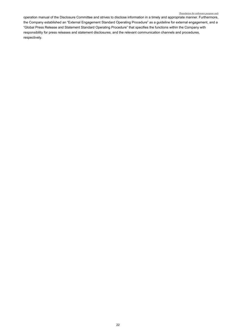 Translation for reference purpose only 22 operation manual of the Disclosure Committee and strives to disclose information in a timely and appropriate manner. Furthermore, the Company established an “External Engagement Standard Operating Procedure” as a guideline for external engagement, and a “Global Press Release and Statement Standard Operating Procedure” that specifies the functions within the Company with responsibility for press releases and statement disclosures, and the relevant communication channels and procedures, respectively.