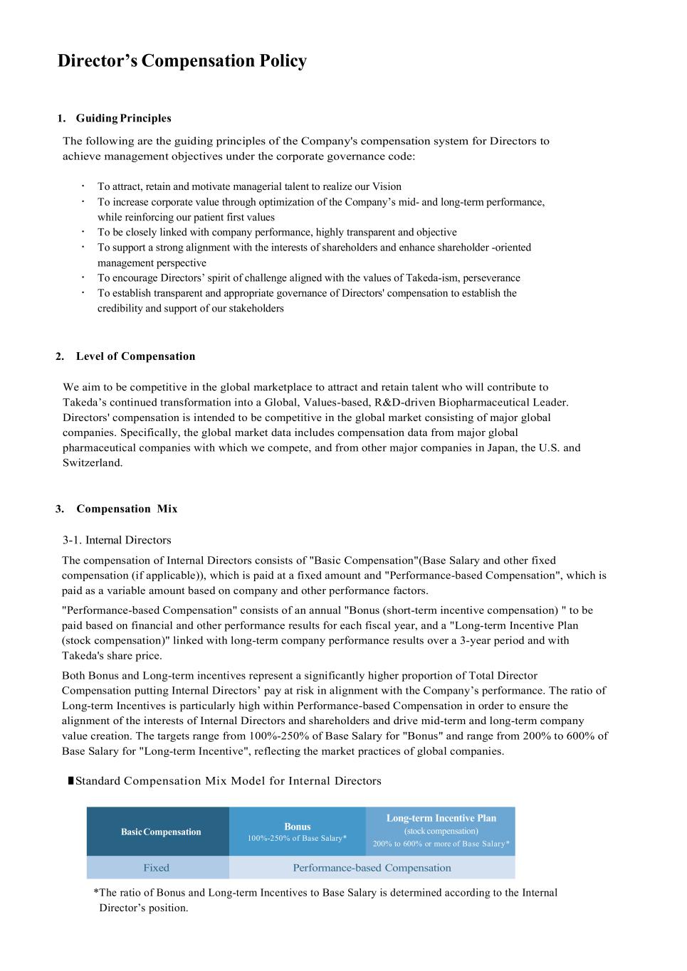 Director’s Compensation Policy 1. Guiding Principles The following are the guiding principles of the Company's compensation system for Directors to achieve management objectives under the corporate governance code:  To attract, retain and motivate managerial talent to realize our Vision  To increase corporate value through optimization of the Company’s mid- and long-term performance, while reinforcing our patient first values  To be closely linked with company performance, highly transparent and objective  To support a strong alignment with the interests of shareholders and enhance shareholder -oriented management perspective  To encourage Directors’ spirit of challenge aligned with the values of Takeda-ism, perseverance  To establish transparent and appropriate governance of Directors' compensation to establish the credibility and support of our stakeholders 2. Level of Compensation We aim to be competitive in the global marketplace to attract and retain talent who will contribute to Takeda’s continued transformation into a Global, Values-based, R&D-driven Biopharmaceutical Leader. Directors' compensation is intended to be competitive in the global market consisting of major global companies. Specifically, the global market data includes compensation data from major global pharmaceutical companies with which we compete, and from other major companies in Japan, the U.S. and Switzerland. 3. Compensation Mix 3-1. Internal Directors The compensation of Internal Directors consists of "Basic Compensation"(Base Salary and other fixed compensation (if applicable)), which is paid at a fixed amount and "Performance-based Compensation", which is paid as a variable amount based on company and other performance factors. "Performance-based Compensation" consists of an annual "Bonus (short-term incentive compensation) " to be paid based on financial and other performance results for each fiscal year, and a "Long-term Incentive Plan (stock compensation)" linked with long-term company performance results over a 3-year period and with Takeda's share price. Both Bonus and Long-term incentives represent a significantly higher proportion of Total Director Compensation putting Internal Directors’ pay at risk in alignment with the Company’s performance. The ratio of Long-term Incentives is particularly high within Performance-based Compensation in order to ensure the alignment of the interests of Internal Directors and shareholders and drive mid-term and long-term company value creation. The targets range from 100%-250% of Base Salary for "Bonus" and range from 200% to 600% of Base Salary for "Long-term Incentive", reflecting the market practices of global companies. ■ Standard Compensation Mix Model for Internal Directors Fixed Performance-based Compensation *The ratio of Bonus and Long-term Incentives to Base Salary is determined according to the Internal Director’s position. Bonus 100%-250% of Base Salary* Basic Compensation Long-term Incentive Plan (stock compensation) 200% to 600% or more of Base Salary*