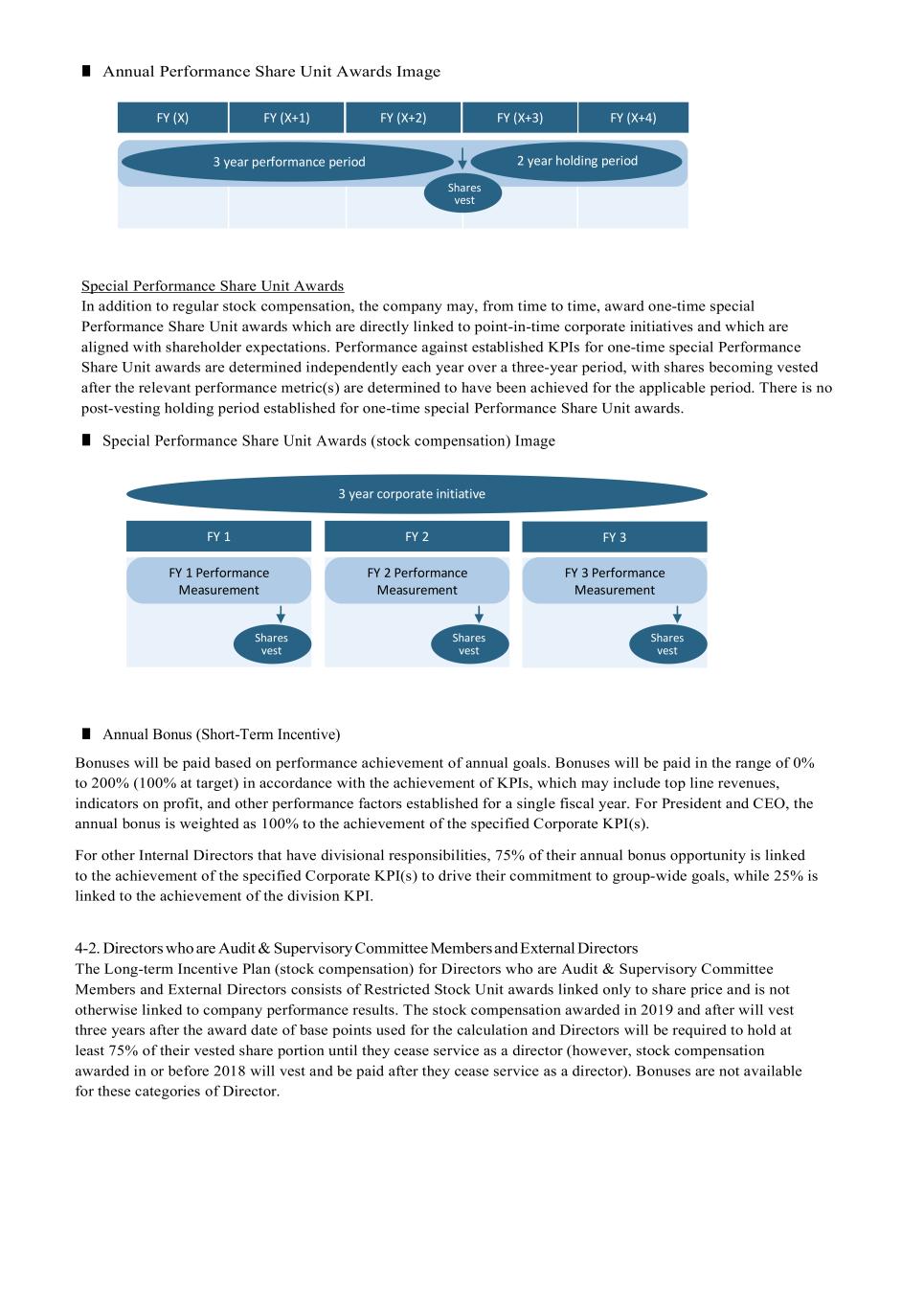 ■ Annual Performance Share Unit Awards Image Special Performance Share Unit Awards In addition to regular stock compensation, the company may, from time to time, award one-time special Performance Share Unit awards which are directly linked to point-in-time corporate initiatives and which are aligned with shareholder expectations. Performance against established KPIs for one-time special Performance Share Unit awards are determined independently each year over a three-year period, with shares becoming vested after the relevant performance metric(s) are determined to have been achieved for the applicable period. There is no post-vesting holding period established for one-time special Performance Share Unit awards. ■ Special Performance Share Unit Awards (stock compensation) Image ■ Annual Bonus (Short-Term Incentive) Bonuses will be paid based on performance achievement of annual goals. Bonuses will be paid in the range of 0% to 200% (100% at target) in accordance with the achievement of KPIs, which may include top line revenues, indicators on profit, and other performance factors established for a single fiscal year. For President and CEO, the annual bonus is weighted as 100% to the achievement of the specified Corporate KPI(s). For other Internal Directors that have divisional responsibilities, 75% of their annual bonus opportunity is linked to the achievement of the specified Corporate KPI(s) to drive their commitment to group-wide goals, while 25% is linked to the achievement of the division KPI. 4-2. Directors who are Audit & Supervisory Committee Members and External Directors The Long-term Incentive Plan (stock compensation) for Directors who are Audit & Supervisory Committee Members and External Directors consists of Restricted Stock Unit awards linked only to share price and is not otherwise linked to company performance results. The stock compensation awarded in 2019 and after will vest three years after the award date of base points used for the calculation and Directors will be required to hold at least 75% of their vested share portion until they cease service as a director (however, stock compensation awarded in or before 2018 will vest and be paid after they cease service as a director). Bonuses are not available for these categories of Director. 3 year performance period 2 year holding period Shares vest FY (X) FY (X+3) FY (X+2) FY (X+1) FY (X+4) 3 year corporate initiative FY 1 FY 3 FY 2 FY 1 Performance Measurement FY 2 Performance Measurement FY 3 Performance Measurement Shares vest Shares vest Shares vest