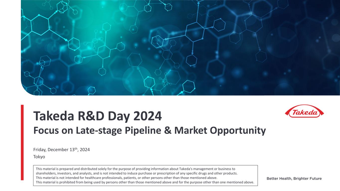 Takeda R&D Day 2024 Focus on Late-stage Pipeline & Market Opportunity Friday, December 13th, 2024 Tokyo This material is prepared and distributed solely for the purpose of providing information about Takeda's management or business to shareholders, investors, and analysts, and is not intended to induce purchase or prescription of any specific drugs and other products. This material is not intended for healthcare professionals, patients, or other persons other than those mentioned above. This material is prohibited from being used by persons other than those mentioned above and for the purpose other than one mentioned above.