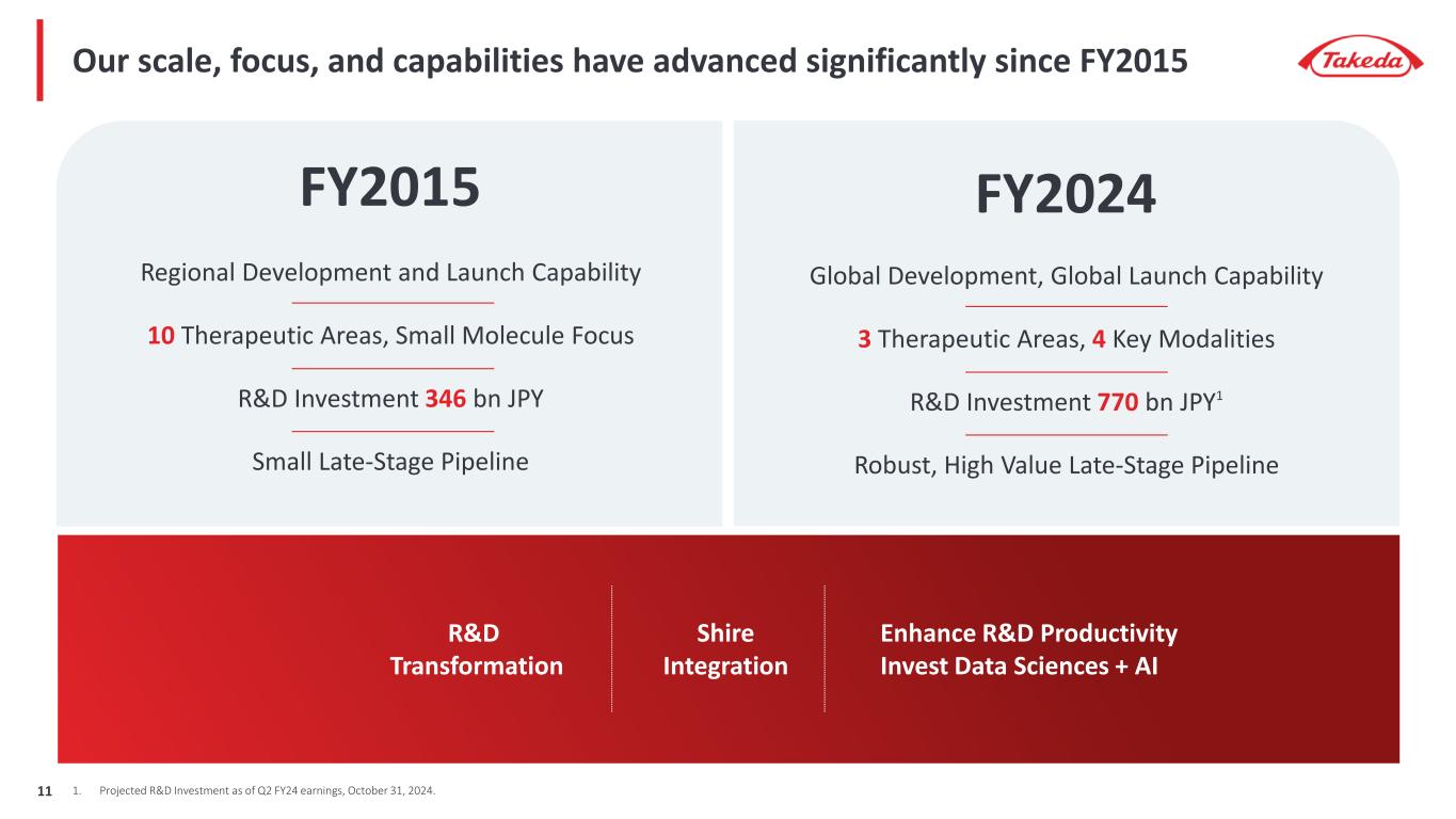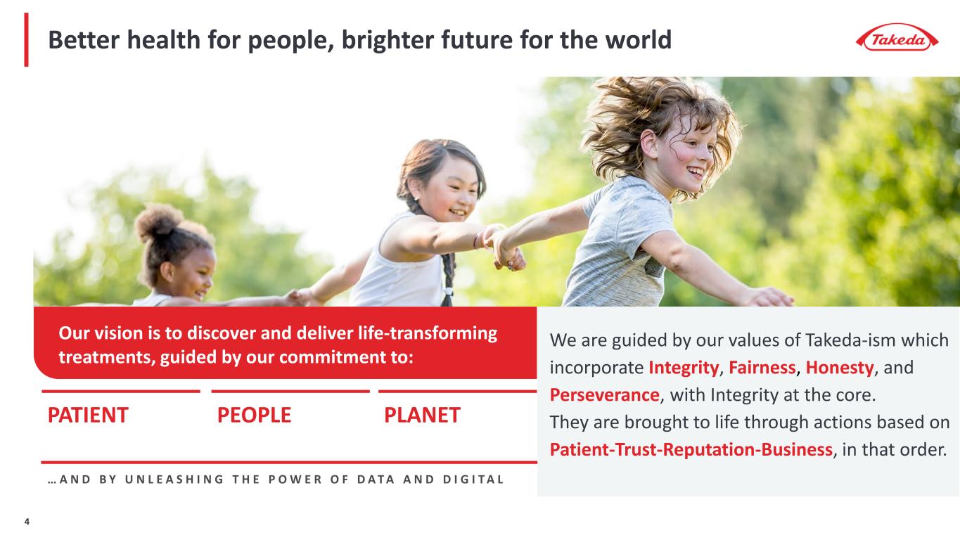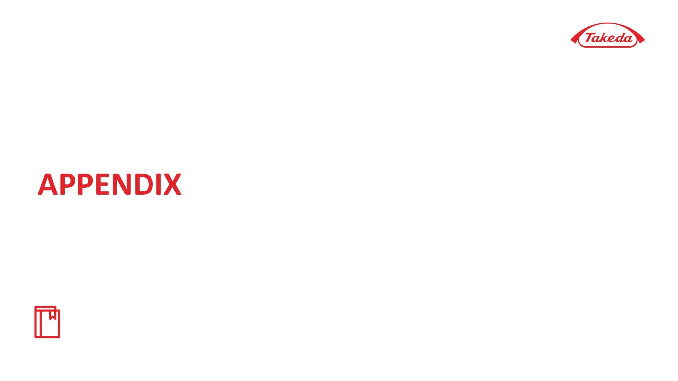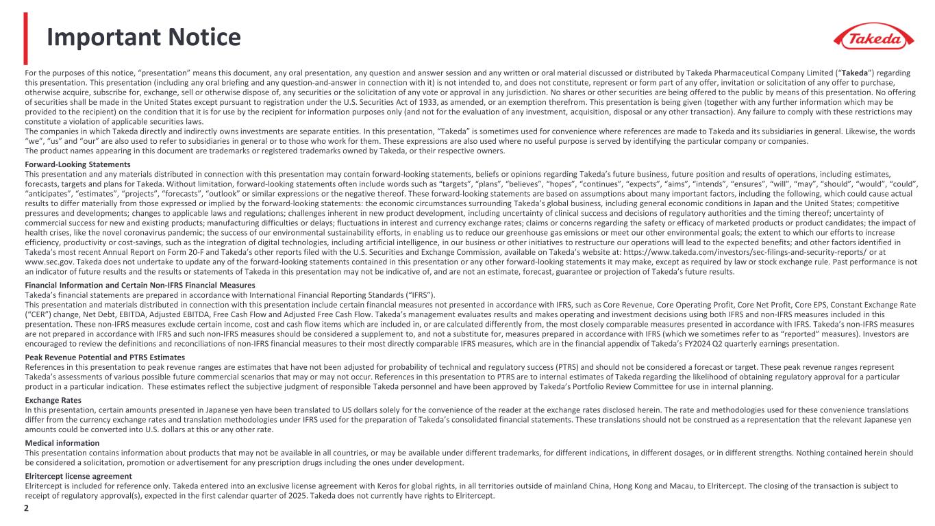 For the purposes of this notice, “presentation” means this document, any oral presentation, any question and answer session and any written or oral material discussed or distributed by Takeda Pharmaceutical Company Limited (“Takeda”) regarding this presentation. This presentation (including any oral briefing and any question-and-answer in connection with it) is not intended to, and does not constitute, represent or form part of any offer, invitation or solicitation of any offer to purchase, otherwise acquire, subscribe for, exchange, sell or otherwise dispose of, any securities or the solicitation of any vote or approval in any jurisdiction. No shares or other securities are being offered to the public by means of this presentation. No offering of securities shall be made in the United States except pursuant to registration under the U.S. Securities Act of 1933, as amended, or an exemption therefrom. This presentation is being given (together with any further information which may be provided to the recipient) on the condition that it is for use by the recipient for information purposes only (and not for the evaluation of any investment, acquisition, disposal or any other transaction). Any failure to comply with these restrictions may constitute a violation of applicable securities laws. The companies in which Takeda directly and indirectly owns investments are separate entities. In this presentation, “Takeda” is sometimes used for convenience where references are made to Takeda and its subsidiaries in general. Likewise, the words “we”, “us” and “our” are also used to refer to subsidiaries in general or to those who work for them. These expressions are also used where no useful purpose is served by identifying the particular company or companies. The product names appearing in this document are trademarks or registered trademarks owned by Takeda, or their respective owners. Forward-Looking Statements This presentation and any materials distributed in connection with this presentation may contain forward-looking statements, beliefs or opinions regarding Takeda’s future business, future position and results of operations, including estimates, forecasts, targets and plans for Takeda. Without limitation, forward-looking statements often include words such as “targets”, “plans”, “believes”, “hopes”, “continues”, “expects”, “aims”, “intends”, “ensures”, “will”, “may”, “should”, “would”, “could”, “anticipates”, “estimates”, “projects”, “forecasts”, “outlook” or similar expressions or the negative thereof. These forward-looking statements are based on assumptions about many important factors, including the following, which could cause actual results to differ materially from those expressed or implied by the forward-looking statements: the economic circumstances surrounding Takeda’s global business, including general economic conditions in Japan and the United States; competitive pressures and developments; changes to applicable laws and regulations; challenges inherent in new product development, including uncertainty of clinical success and decisions of regulatory authorities and the timing thereof; uncertainty of commercial success for new and existing products; manufacturing difficulties or delays; fluctuations in interest and currency exchange rates; claims or concerns regarding the safety or efficacy of marketed products or product candidates; the impact of health crises, like the novel coronavirus pandemic; the success of our environmental sustainability efforts, in enabling us to reduce our greenhouse gas emissions or meet our other environmental goals; the extent to which our efforts to increase efficiency, productivity or cost-savings, such as the integration of digital technologies, including artificial intelligence, in our business or other initiatives to restructure our operations will lead to the expected benefits; and other factors identified in Takeda’s most recent Annual Report on Form 20-F and Takeda’s other reports filed with the U.S. Securities and Exchange Commission, available on Takeda’s website at: https://www.takeda.com/investors/sec-filings-and-security-reports/ or at www.sec.gov. Takeda does not undertake to update any of the forward-looking statements contained in this presentation or any other forward-looking statements it may make, except as required by law or stock exchange rule. Past performance is not an indicator of future results and the results or statements of Takeda in this presentation may not be indicative of, and are not an estimate, forecast, guarantee or projection of Takeda’s future results. Financial Information and Certain Non-IFRS Financial Measures Takeda’s financial statements are prepared in accordance with International Financial Reporting Standards (“IFRS”). This presentation and materials distributed in connection with this presentation include certain financial measures not presented in accordance with IFRS, such as Core Revenue, Core Operating Profit, Core Net Profit, Core EPS, Constant Exchange Rate (“CER”) change, Net Debt, EBITDA, Adjusted EBITDA, Free Cash Flow and Adjusted Free Cash Flow. Takeda’s management evaluates results and makes operating and investment decisions using both IFRS and non-IFRS measures included in this presentation. These non-IFRS measures exclude certain income, cost and cash flow items which are included in, or are calculated differently from, the most closely comparable measures presented in accordance with IFRS. Takeda’s non-IFRS measures are not prepared in accordance with IFRS and such non-IFRS measures should be considered a supplement to, and not a substitute for, measures prepared in accordance with IFRS (which we sometimes refer to as “reported” measures). Investors are encouraged to review the definitions and reconciliations of non-IFRS financial measures to their most directl