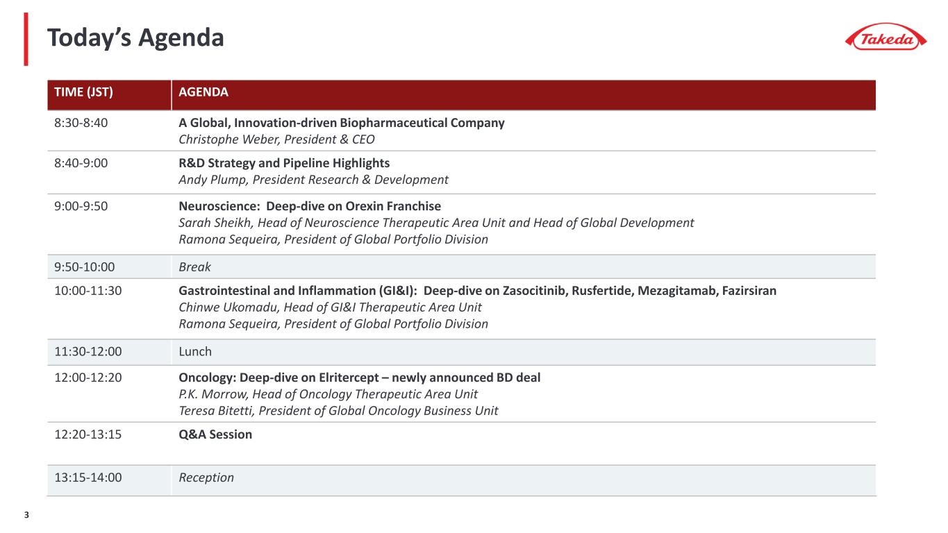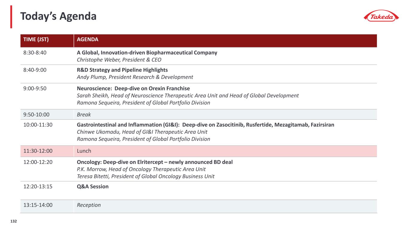 Today’s Agenda TIME (JST) AGENDA 8:30-8:40 A Global, Innovation-driven Biopharmaceutical Company Christophe Weber, President & CEO 8:40-9:00 R&D Strategy and Pipeline Highlights Andy Plump, President Research & Development 9:00-9:50 Neuroscience: Deep-dive on Orexin Franchise Sarah Sheikh, Head of Neuroscience Therapeutic Area Unit and Head of Global Development Ramona Sequeira, President of Global Portfolio Division 9:50-10:00 Break 10:00-11:30 Gastrointestinal and Inflammation (GI&I): Deep-dive on Zasocitinib, Rusfertide, Mezagitamab, Fazirsiran Chinwe Ukomadu, Head of GI&I Therapeutic Area Unit Ramona Sequeira, President of Global Portfolio Division 11:30-12:00 Lunch 12:00-12:20 Oncology: Deep-dive on Elritercept – newly announced BD deal P.K. Morrow, Head of Oncology Therapeutic Area Unit Teresa Bitetti, President of Global Oncology Business Unit 12:20-13:15 Q&A Session 13:15-14:00 Reception 132