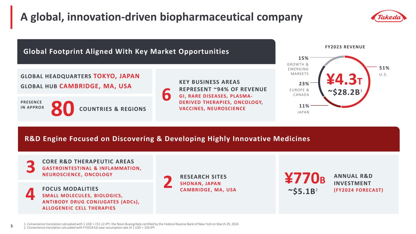 15% GROWTH & EMERGING MARKETS 23% EUROPE & CANADA 11% JAPAN 51% U.S. FY2023 REVENUE ¥4.3T ~$28.2B1 A global, innovation-driven biopharmaceutical company 80PRESENCE IN APPROX COUNTRIES & REGIONS Global Footprint Aligned With Key Market Opportunities GLOBAL HEADQUARTERS TOKYO, JAPAN GLOBAL HUB CAMBRIDGE, MA, USA 1. Convenience translation calculated with 1 USD = 151.22 JPY, the Noon Buying Rate certified by the Federal Reserve Bank of New York on March 29, 2024 2. Convenience translation calculated with FY2024 full year assumption rate of 1 USD = 150 JPY 6 KEY BUSINESS AREAS REPRESENT ~94% OF REVENUE GI, RARE DISEASES, PLASMA- DERIVED THERAPIES, ONCOLOGY, VACCINES, NEUROSCIENCE 4 FOCUS MODALITIES SMALL MOLECULES, BIOLOGICS, ANTIBODY DRUG CONJUGATES (ADCs), ALLOGENEIC CELL THERAPIES CORE R&D THERAPEUTIC AREAS GASTROINTESTINAL & INFLAMMATION, NEUROSCIENCE, ONCOLOGY R&D Engine Focused on Discovering & Developing Highly Innovative Medicines 3 2 RESEARCH SITES SHONAN, JAPAN CAMBRIDGE, MA, USA ANNUAL R&D INVESTMENT (FY2024 FORECAST) ¥770B ~$5.1B2 5