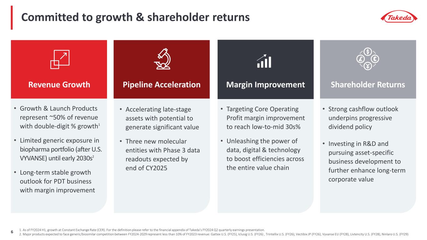 Committed to growth & shareholder returns Revenue Growth Pipeline Acceleration • Accelerating late-stage assets with potential to generate significant value • Three new molecular entities with Phase 3 data readouts expected by end of CY2025 Margin Improvement Shareholder Returns • Strong cashflow outlook underpins progressive dividend policy • Investing in R&D and pursuing asset-specific business development to further enhance long-term corporate value • Targeting Core Operating Profit margin improvement to reach low-to-mid 30s% • Unleashing the power of data, digital & technology to boost efficiencies across the entire value chain • Growth & Launch Products represent ~50% of revenue with double-digit % growth1 • Limited generic exposure in biopharma portfolio (after U.S. VYVANSE) until early 2030s2 • Long-term stable growth outlook for PDT business with margin improvement 1. As of FY2024 H1, growth at Constant Exchange Rate (CER). For the definition please refer to the financial appendix of Takeda’s FY2024 Q2 quarterly earnings presentation. 2. Major products expected to face generic/biosimilar competition between FY2024-2029 represent less than 10% of FY2023 revenue: Gattex U.S. (FY25), Iclusig U.S. (FY26) , Trintellix U.S. (FY26), Vectibix JP (FY26), Vyvanse EU (FY28), Livtencity U.S. (FY28), Ninlaro U.S. (FY29)6