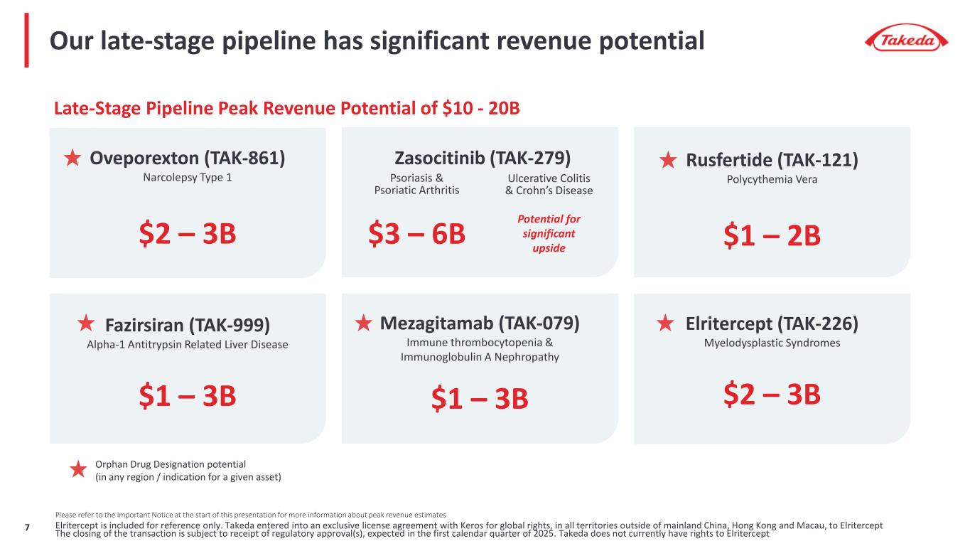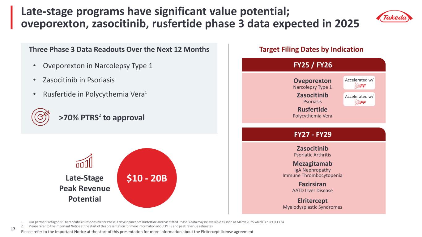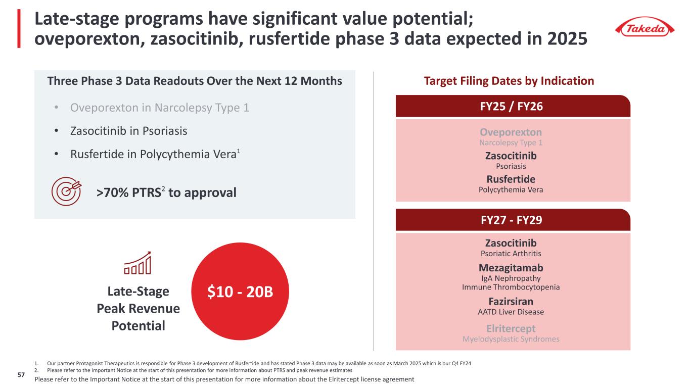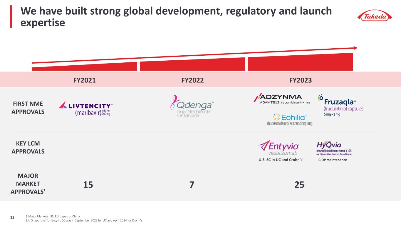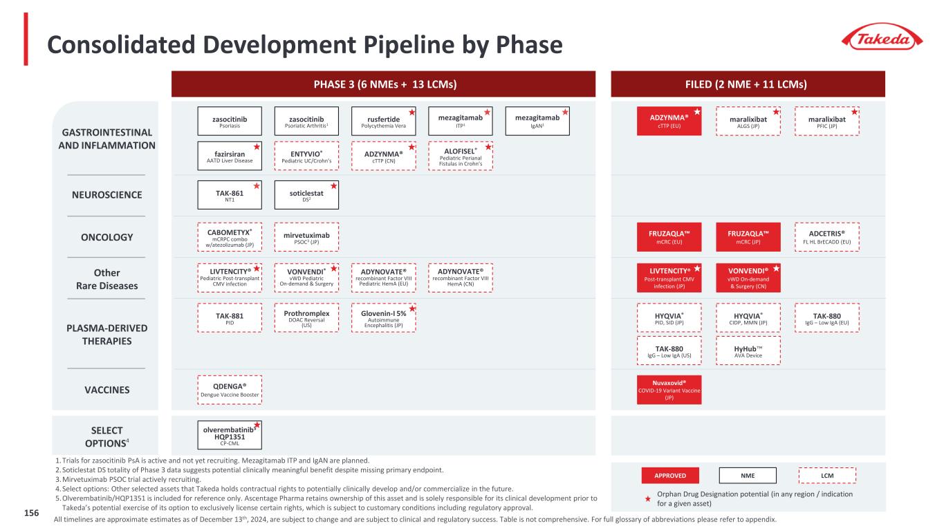 Orphan Drug Designation potential (in any region / indication for a given asset) FILED (2 NME + 11 LCMs)PHASE 3 (6 NMEs + 13 LCMs) NME LCMAPPROVED CABOMETYX® mCRPC combo w/atezolizumab (JP) maralixibat PFIC (JP) Prothromplex DOAC Reversal (US) HYQVIA® PID, SID (JP) ADCETRIS® FL HL BrECADD (EU) HYQVIA® CIDP, MMN (JP) ENTYVIO® Pediatric UC/Crohn’s QDENGA® Dengue Vaccine Booster soticlestat DS2 fazirsiran AATD Liver Disease Glovenin-I 5% Autoimmune Encephalitis (JP) Consolidated Development Pipeline by Phase ONCOLOGY PLASMA-DERIVED THERAPIES NEUROSCIENCE SELECT OPTIONS4 GASTROINTESTINAL AND INFLAMMATION ADZYNMA® cTTP (CN) VONVENDI® vWD On-demand & Surgery (CN) ADYNOVATE® recombinant Factor VIII Pediatric HemA (EU) VONVENDI® vWD Pediatric On-demand & Surgery LIVTENCITY® Pediatric Post-transplant CMV infection Other Rare Diseases All timelines are approximate estimates as of December 13th, 2024, are subject to change and are subject to clinical and regulatory success. Table is not comprehensive. For full glossary of abbreviations please refer to appendix. FRUZAQLA mCRC (JP) FRUZAQLA mCRC (EU) ADZYNMA® cTTP (EU) TAK-880 IgG – Low IgA (EU) ADYNOVATE® recombinant Factor VIII HemA (CN) zasocitinib Psoriatic Arthritis1 TAK-881 PID LIVTENCITY® Post-transplant CMV infection (JP) 156 rusfertide Polycythemia Vera maralixibat ALGS (JP) TAK-880 IgG – Low IgA (US) 1.Trials for zasocitinib PsA is active and not yet recruiting. Mezagitamab ITP and IgAN are planned. 2.Soticlestat DS totality of Phase 3 data suggests potential clinically meaningful benefit despite missing primary endpoint. 3.Mirvetuximab PSOC trial actively recruiting. 4.Select options: Other selected assets that Takeda holds contractual rights to potentially clinically develop and/or commercialize in the future. 5.Olverembatinib/HQP1351 is included for reference only. Ascentage Pharma retains ownership of this asset and is solely responsible for its clinical development prior to Takeda’s potential exercise of its option to exclusively license certain rights, which is subject to customary conditions including regulatory approval. olverembatinib5 HQP1351 CP-CML VACCINES Nuvaxovid® COVID-19 Variant Vaccine (JP) ALOFISEL® Pediatric Perianal Fistulas in Crohn’s mezagitamab ITP1 mezagitamab IgAN1 HyHub AVA Device mirvetuximab PSOC3 (JP) zasocitinib Psoriasis TAK-861 NT1