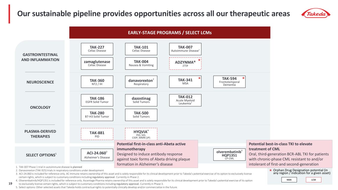 EARLY-STAGE PROGRAMS / SELECT LCMs SELECT OPTIONS5 NEUROSCIENCE zamaglutenase Celiac Disease Orphan Drug Designation potential (in any region / indication for a given asset) TAK-594 Frontotemporal Dementia TAK-341 MSA GASTROINTESTINAL AND INFLAMMATION TAK-101 Celiac Disease TAK-227 Celiac Disease danavorexton2 Respiratory PLASMA-DERIVED THERAPIES ACI-24.0603 Alzheimer’s Disease ADZYNMA® iTTP Our sustainable pipeline provides opportunities across all our therapeutic areas olverembatinib4 HQP1351 CP-CML TAK-004 Nausea & Vomiting 1. TAK-007 Phase 1 trial in autoimmune disease is planned 2. Danavorexton (TAK-925) trials in respiratory conditions under development 3. ACI-24.060 is included for reference only. AC Immune retains ownership of this asset and is solely responsible for its clinical development prior to Takeda’s potential exercise of its option to exclusively license certain rights, which is subject to customary conditions including regulatory approval. Currently in Phase 2. 4. Olverembatinib/HQP1351 is included for reference only. Ascentage Pharma retains ownership of this asset and is solely responsible for its clinical development prior to Takeda’s potential exercise of its option to exclusively license certain rights, which is subject to customary conditions including regulatory approval. Currently in Phase 3. 5. Select options: Other selected assets that Takeda holds contractual rights to potentially clinically develop and/or commercialize in the future. TAK-007 Autoimmune Disease1 TAK-360 NT2 / IH dazostinag Solid Tumors TAK-012 Acute Myeloid Leukemia1 TAK-186 EGFR Solid Tumor TAK-500 Solid Tumors TAK-280 B7-H3 Solid Tumor ONCOLOGY HYQVIA® PID, SID, CIDP, MMN (JP) Potential first-in-class anti-Abeta active immunotherapy Designed to induce antibody response against toxic forms of Abeta driving plaque formation in Alzheimer’s disease NME LCM Potential best-in-class TKI to elevate treatment of CML Oral, third-generation BCR-ABL TKI for patients with chronic-phase CML resistant to and/or intolerant of first-and second-generation TAK-881 PID 19