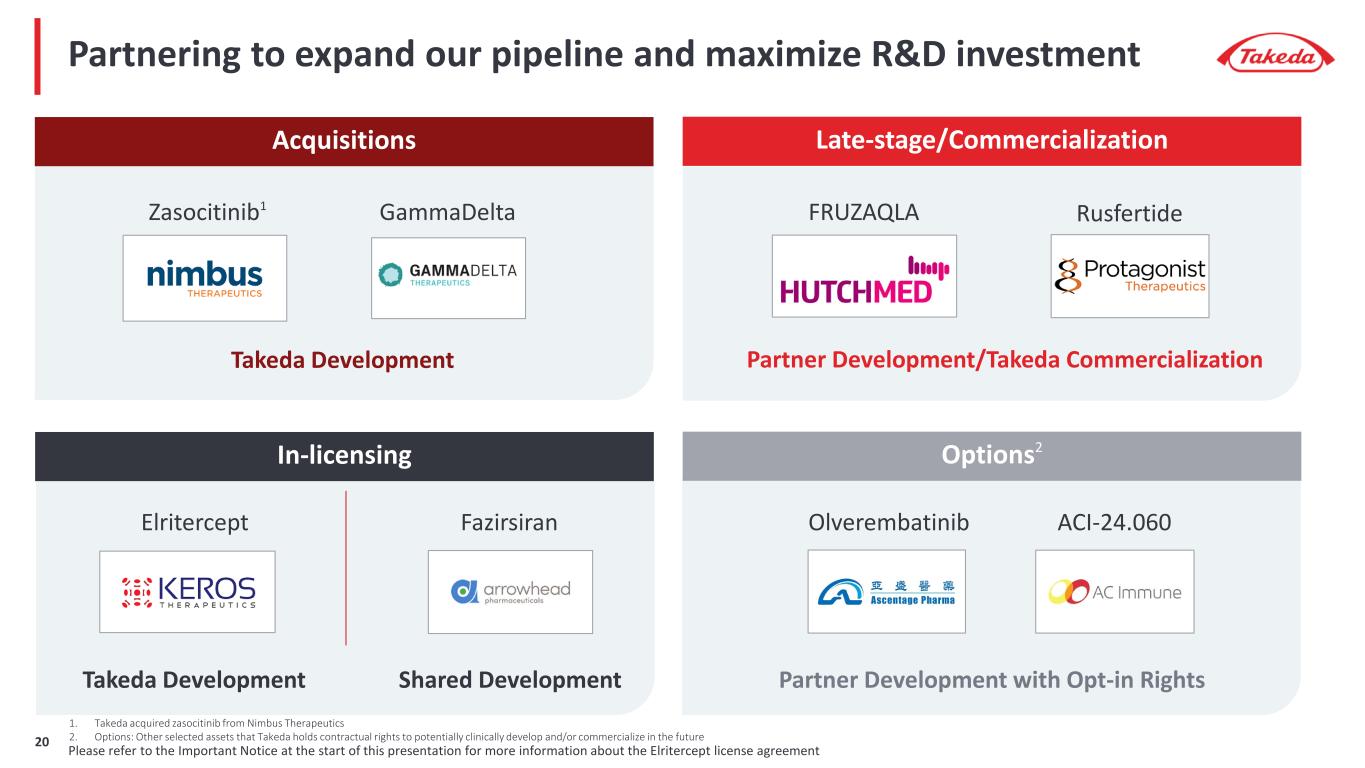 Partnering to expand our pipeline and maximize R&D investment Acquisitions Late-stage/Commercialization In-licensing Zasocitinib1 Takeda Development FRUZAQLA Partner Development/Takeda Commercialization Fazirsiran Olverembatinib Shared Development Partner Development with Opt-in Rights RusfertideGammaDelta ACI-24.060Elritercept Takeda Development 1. Takeda acquired zasocitinib from Nimbus Therapeutics 2. Options: Other selected assets that Takeda holds contractual rights to potentially clinically develop and/or commercialize in the future Please refer to the Important Notice at the start of this presentation for more information about the Elritercept license agreement20 Options2