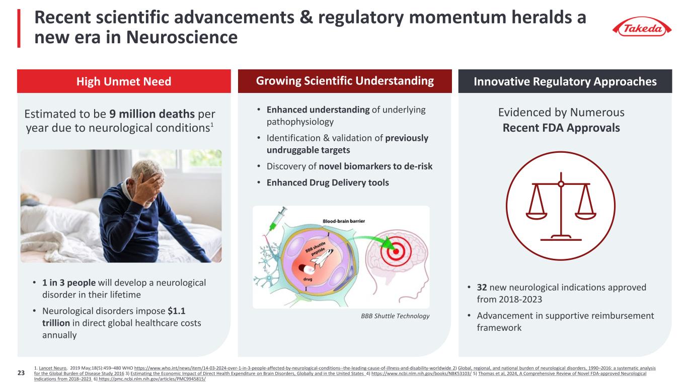 High Unmet Need Recent scientific advancements & regulatory momentum heralds a new era in Neuroscience Growing Scientific Understanding Innovative Regulatory Approaches BBB Shuttle Technology • Enhanced understanding of underlying pathophysiology • Identification & validation of previously undruggable targets • Discovery of novel biomarkers to de-risk • Enhanced Drug Delivery tools • 1 in 3 people will develop a neurological disorder in their lifetime • Neurological disorders impose $1.1 trillion in direct global healthcare costs annually • 32 new neurological indications approved from 2018-2023​ • Advancement in supportive reimbursement framework Estimated to be 9 million deaths per year due to neurological conditions1 Evidenced by Numerous Recent FDA Approvals 1. Lancet Neuro, 2019 May;18(5):459–480 WHO https://www.who.int/news/item/14-03-2024-over-1-in-3-people-affected-by-neurological-conditions--the-leading-cause-of-illness-and-disability-worldwide 2) Global, regional, and national burden of neurological disorders, 1990–2016: a systematic analysis for the Global Burden of Disease Study 2016 3) Estimating the Economic Impact of Direct Health Expenditure on Brain Disorders, Globally and in the United States 4) https://www.ncbi.nlm.nih.gov/books/NBK53103/ 5) Thomas et al, 2024, A Comprehensive Review of Novel FDA-approved Neurological Indications from 2018–2023 6) https://pmc.ncbi.nlm.nih.gov/articles/PMC9945815/ 23