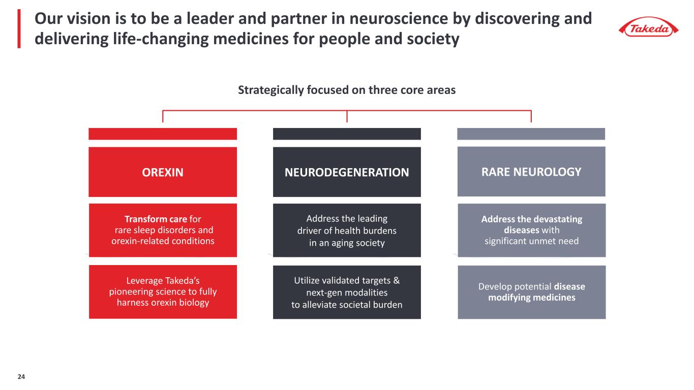 Our vision is to be a leader and partner in neuroscience by discovering and delivering life-changing medicines for people and society NEURODEGENERATION RARE NEUROLOGY Strategically focused on three core areas OREXIN Transform care for rare sleep disorders and orexin-related conditions Leverage Takeda’s pioneering science to fully harness orexin biology Address the leading driver of health burdens in an aging society Utilize validated targets & next-gen modalities to alleviate societal burden Address the devastating diseases with significant unmet need Develop potential disease modifying medicines 24