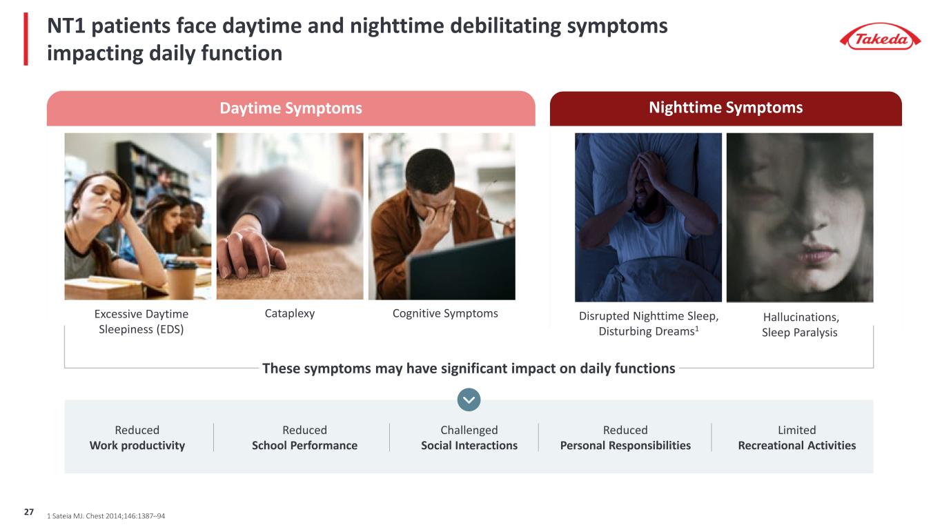 Nighttime Symptoms Excessive Daytime Sleepiness (EDS) Cataplexy Hallucinations, Sleep Paralysis Disrupted Nighttime Sleep, Disturbing Dreams1 NT1 patients face daytime and nighttime debilitating symptoms impacting daily function Cognitive Symptoms Daytime Symptoms 1 Sateia MJ. Chest 2014;146:1387–94 Reduced Work productivity Reduced School Performance Challenged Social Interactions Reduced Personal Responsibilities Limited Recreational Activities​ These symptoms may have significant impact on daily functions 27