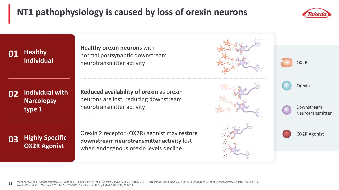 OX2R Orexin Downstream Neurotransmitter OX2R Agonist Mahoney CE, et al. Nat Rev Neurosci. 2019;20(2):83-93; Chastain EM, et al. Biochim Biophys Acta. 2011;1812:265–274; Nishino S. Sleep Med. 2007;8(4):373-399; Saper CB, et al. Trends Neurosci. 2001;24(12):726-731; Yoshida Y, et al. Eur J Neurosci. 2001;14(7):1075-1081; Dauvilliers, Y., N Engl J Med, 2023; 389, 309-321 Healthy orexin neurons with normal postsynaptic downstream neurotransmitter activity Healthy Individual 01 Reduced availability of orexin as orexin neurons are lost, reducing downstream neurotransmitter activity Individual with Narcolepsy type 1 02 Orexin 2 receptor (OX2R) agonist may restore downstream neurotransmitter activity lost when endogenous orexin levels decline Highly Specific OX2R Agonist 03 NT1 pathophysiology is caused by loss of orexin neurons 28