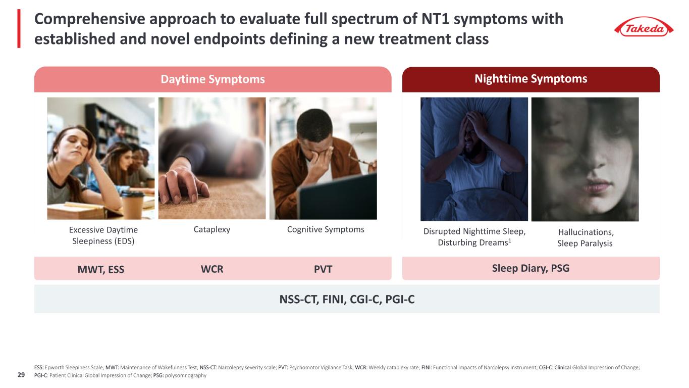 Sleep Diary, PSG ESS: Epworth Sleepiness Scale; MWT: Maintenance of Wakefulness Test; NSS-CT: Narcolepsy severity scale; PVT: Psychomotor Vigilance Task; WCR: Weekly cataplexy rate; FINI: Functional Impacts of Narcolepsy Instrument; CGI-C: Clinical Global Impression of Change; PGI-C: Patient Clinical Global Impression of Change; PSG: polysomnography Comprehensive approach to evaluate full spectrum of NT1 symptoms with established and novel endpoints defining a new treatment class WCR PVTMWT, ESS NSS-CT, FINI, CGI-C, PGI-C Nighttime Symptoms Excessive Daytime Sleepiness (EDS) Cataplexy Hallucinations, Sleep Paralysis Cognitive Symptoms Daytime Symptoms Disrupted Nighttime Sleep, Disturbing Dreams1 29