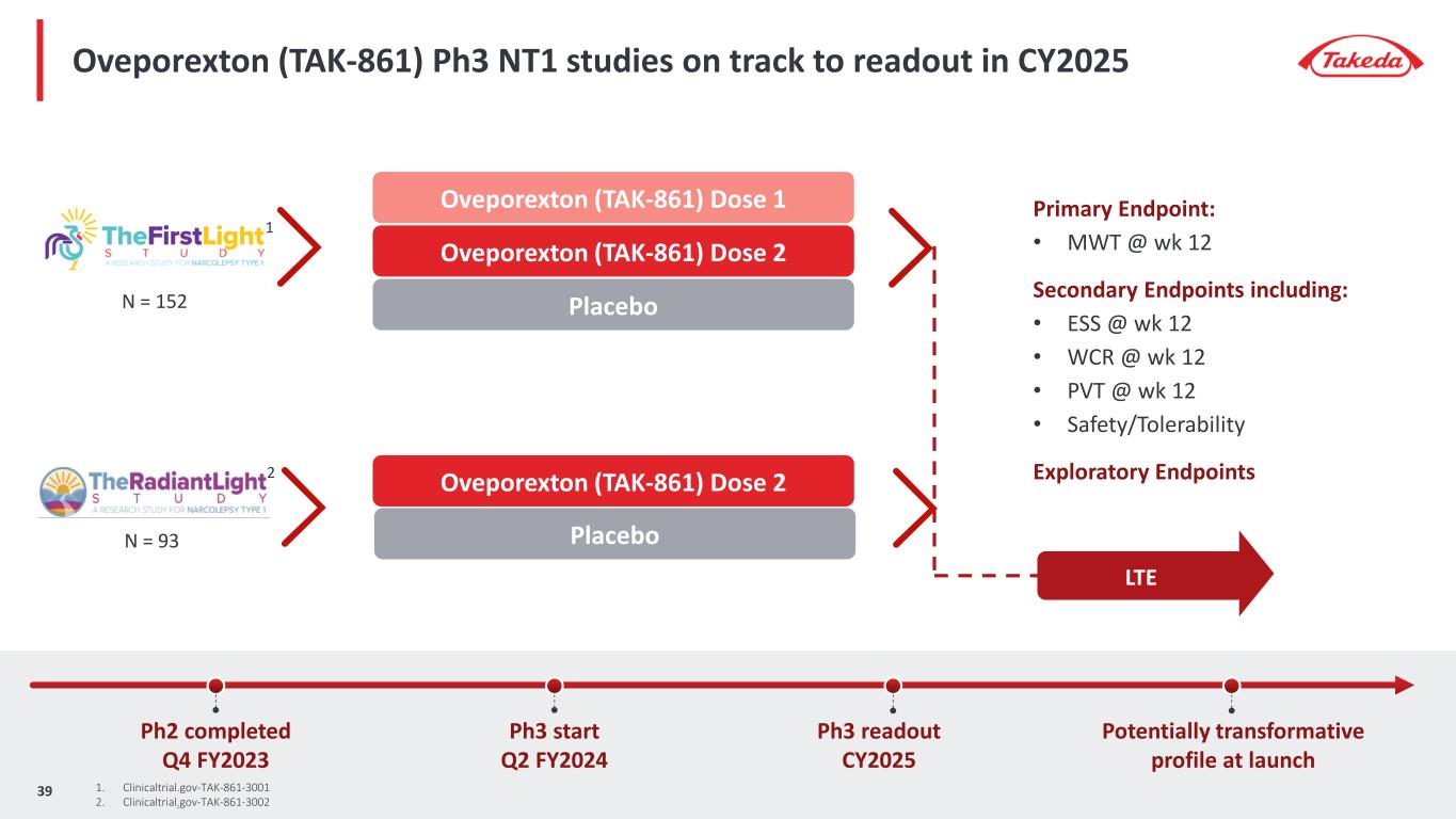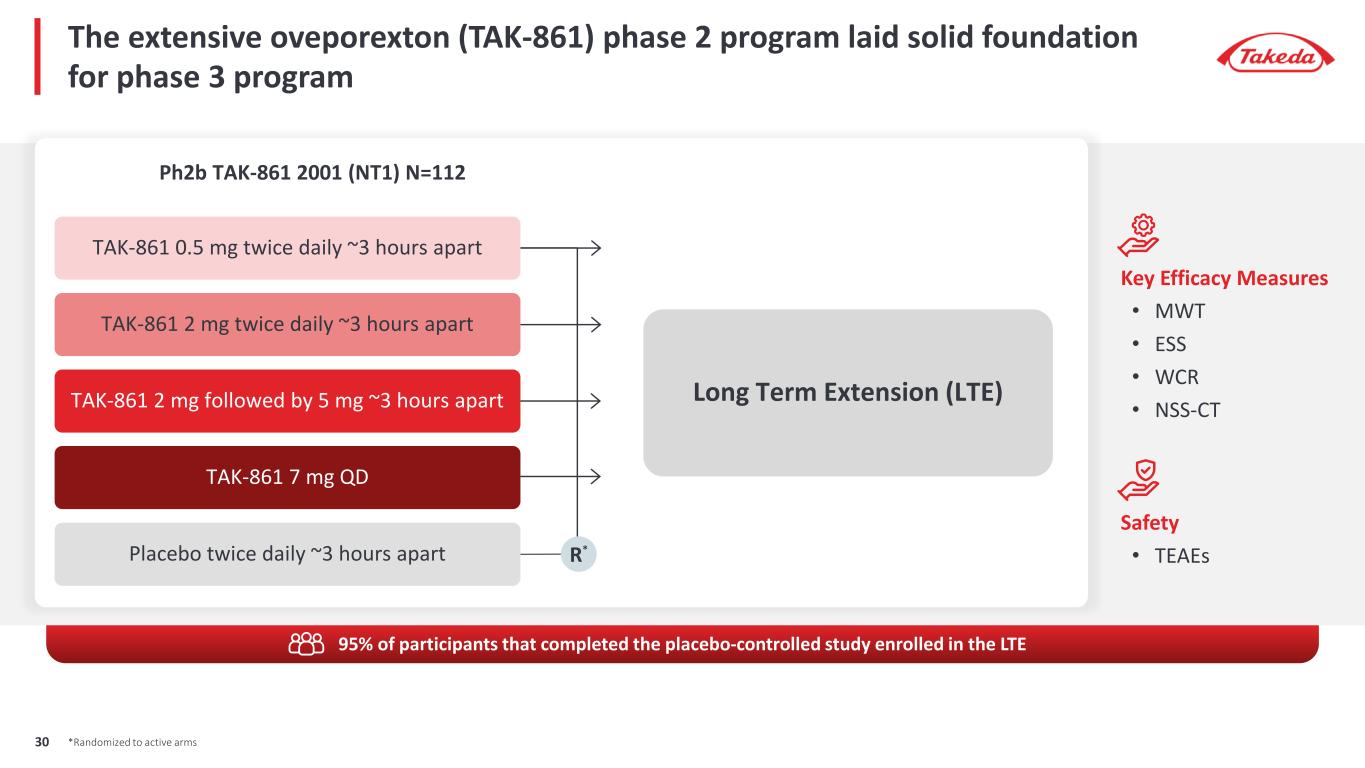 *Randomized to active arms The extensive oveporexton (TAK-861) phase 2 program laid solid foundation for phase 3 program 95% of participants that completed the placebo-controlled study enrolled in the LTE TAK-861 0.5 mg twice daily ~3 hours apart TAK-861 2 mg twice daily ~3 hours apart TAK-861 2 mg followed by 5 mg ~3 hours apart TAK-861 7 mg QD Ph2b TAK-861 2001 (NT1) N=112 Long Term Extension (LTE) Key Efficacy Measures • MWT • ESS • WCR • NSS-CT Safety • TEAEsPlacebo twice daily ~3 hours apart R* 30