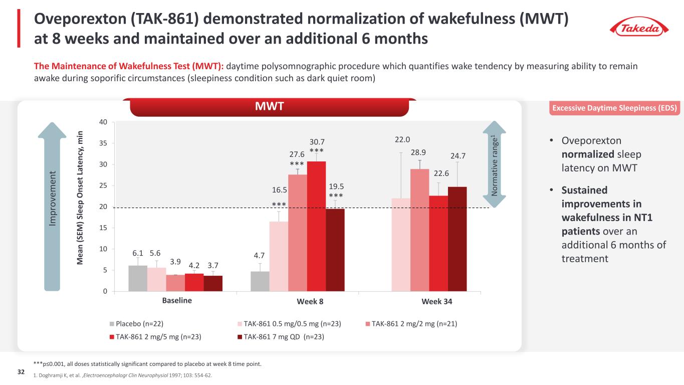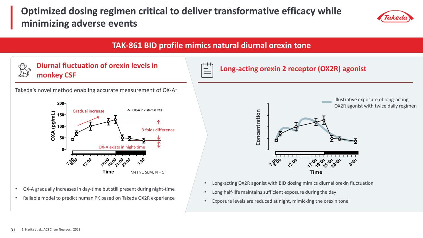 Optimized dosing regimen critical to deliver transformative efficacy while minimizing adverse events TAK-861 BID profile mimics natural diurnal orexin tone Diurnal fluctuation of orexin levels in monkey CSF Long-acting orexin 2 receptor (OX2R) agonist 7:0 0 8:0 0 12 :00 17 :00 19 :00 21 :00 23 :00 3:0 0 0 50 100 150 200 Time O XA (p g/ m L) Takeda’s novel method enabling accurate measurement of OX-A1 • OX-A gradually increases in day-time but still present during night-time • Reliable model to predict human PK based on Takeda OX2R experience 1. Narita et al., ACS Chem Neurosci, 2023 Gradual increase 3 folds difference OX-A exists in night-time Mean ± SEM, N = 5 7:0 0 8:0 0 12 :00 17 :00 19 :00 21 :00 23 :00 3:0 0 0 50 100 150 200 Time OX A (p g/ m L) • Long-acting OX2R agonist with BID dosing mimics diurnal orexin fluctuation • Long half-life maintains sufficient exposure during the day • Exposure levels are reduced at night, mimicking the orexin tone Illustrative exposure of long-acting OX2R agonist with twice daily regimen Co nc en tr at io n 31